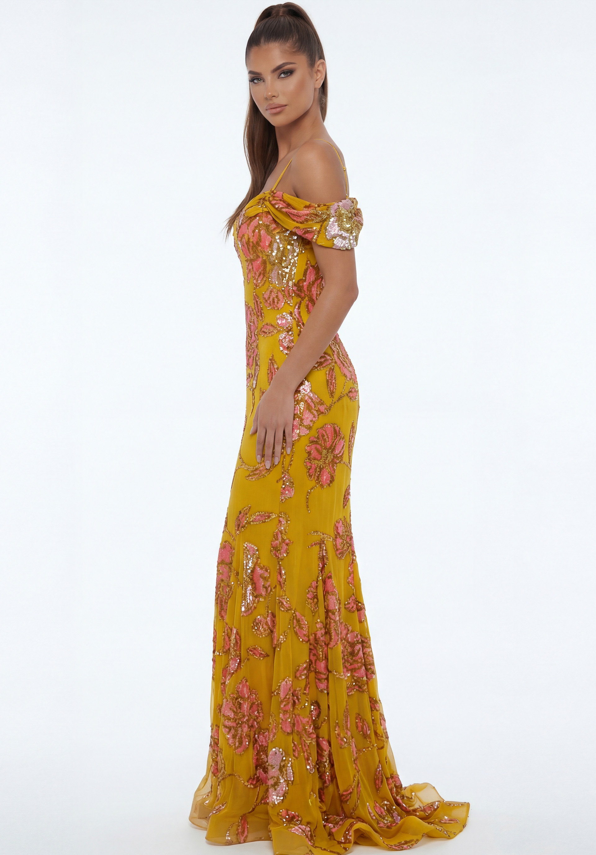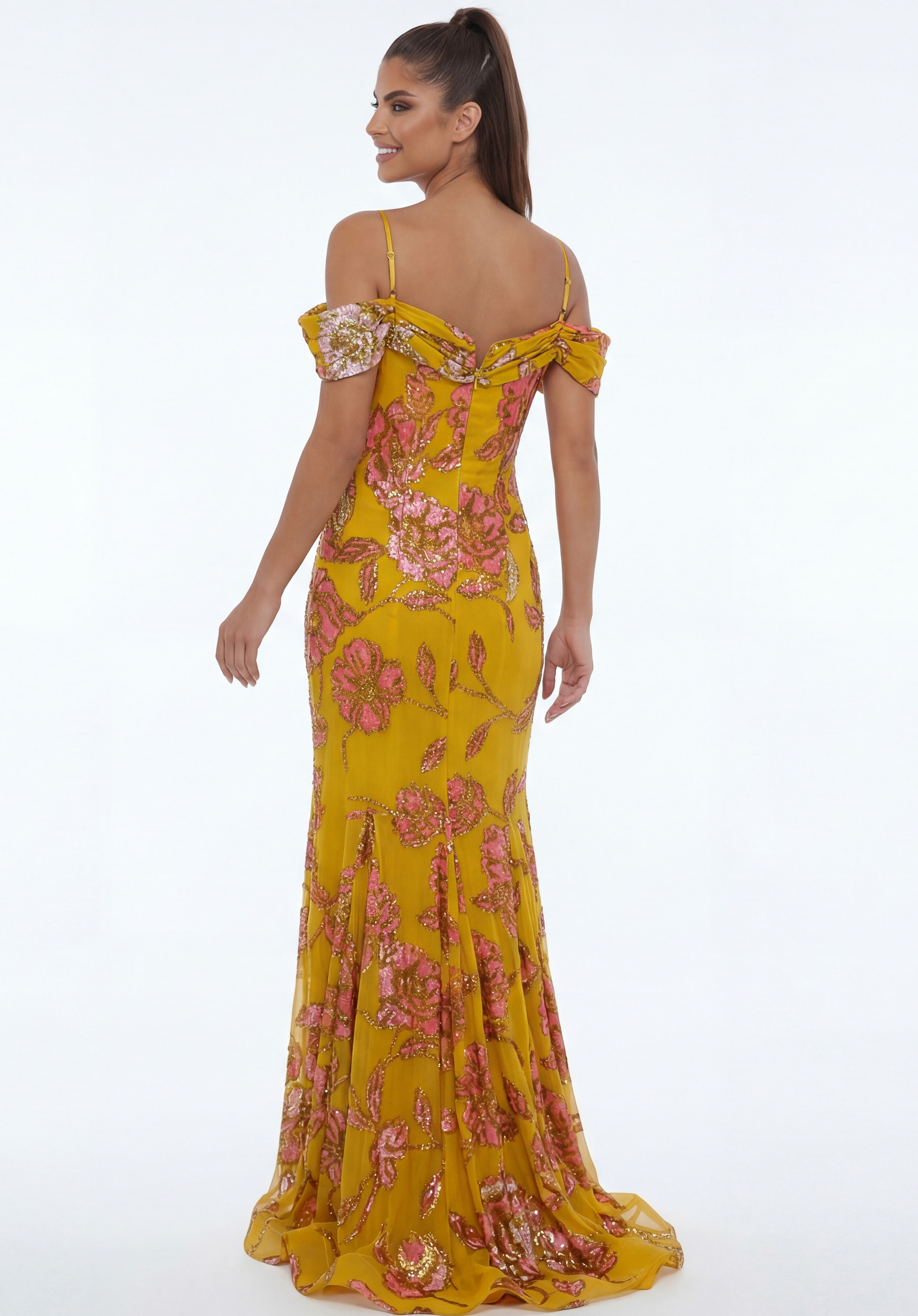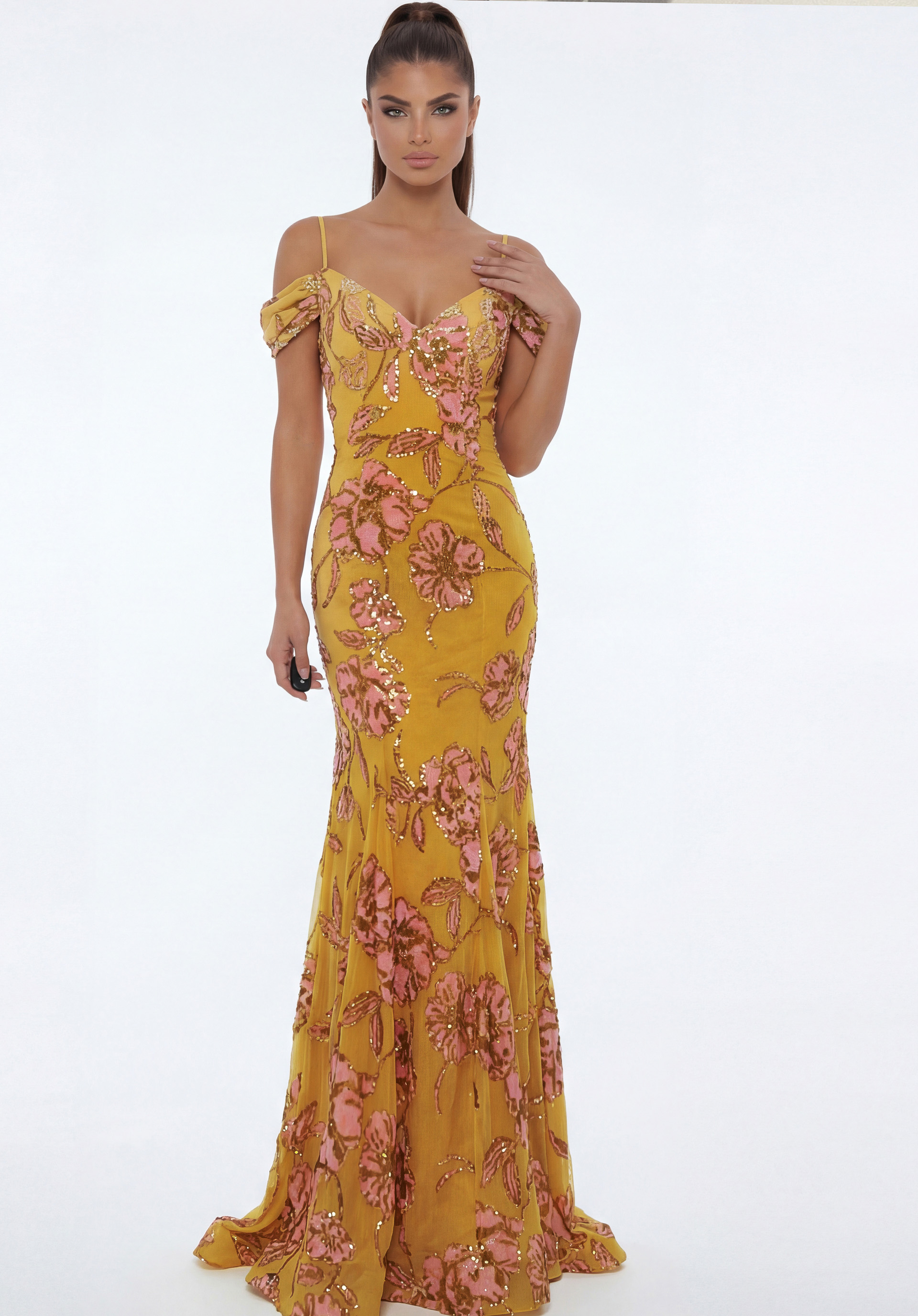 Strapless Jacquard Gown With Floral Waist Detail 51692