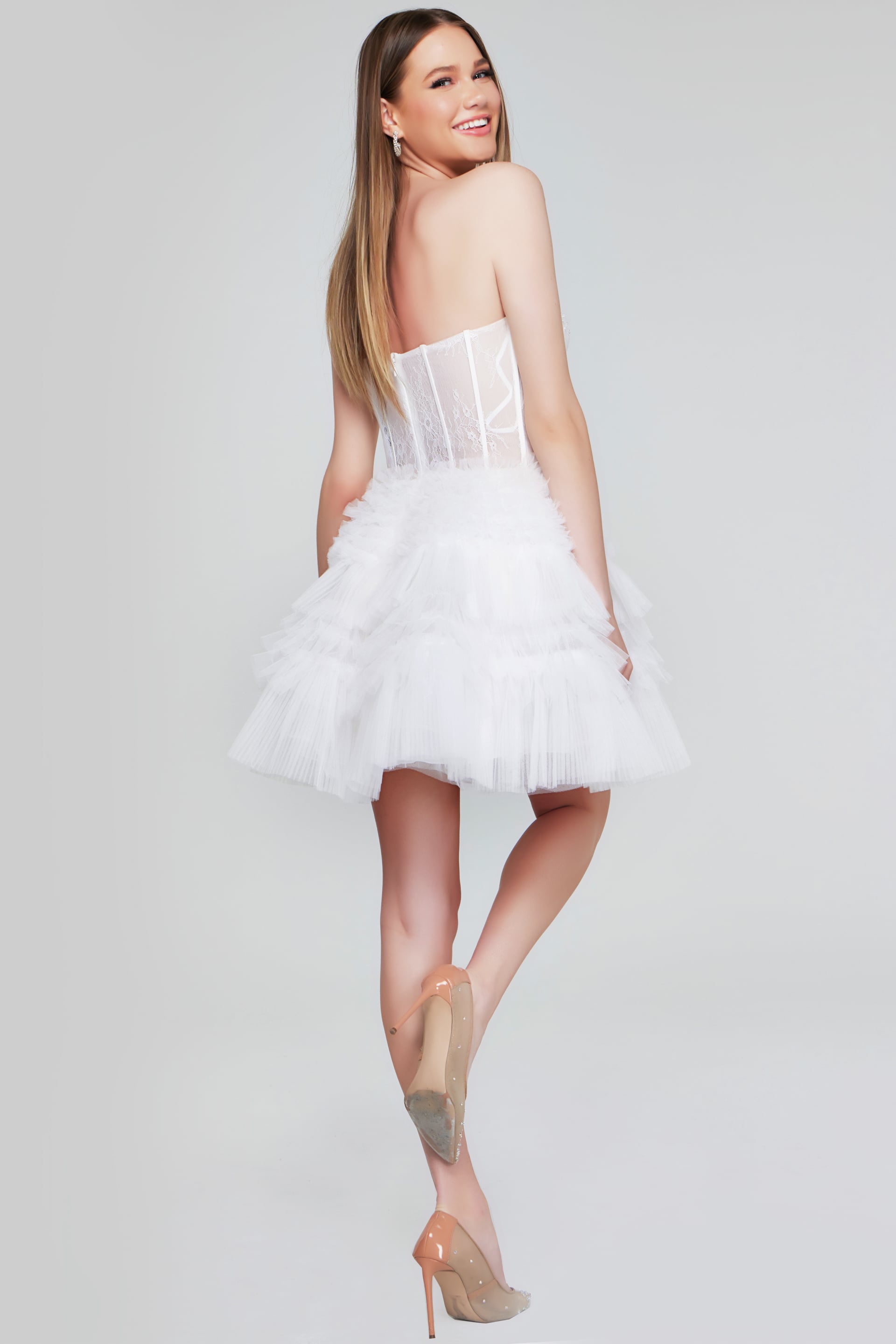 Turn heads with this stunning off-white strapless short dress. This dress features a corset bodice made from sheer lace with bead detailing stitching, creating an elegant and contemporary look. The tiered tulle skirt adds volume and movement, perfect for dancing the night away. The dress length is short, enhancing its playful yet sophisticated feel. It is an ideal choice for cocktail parties or any special evening event.