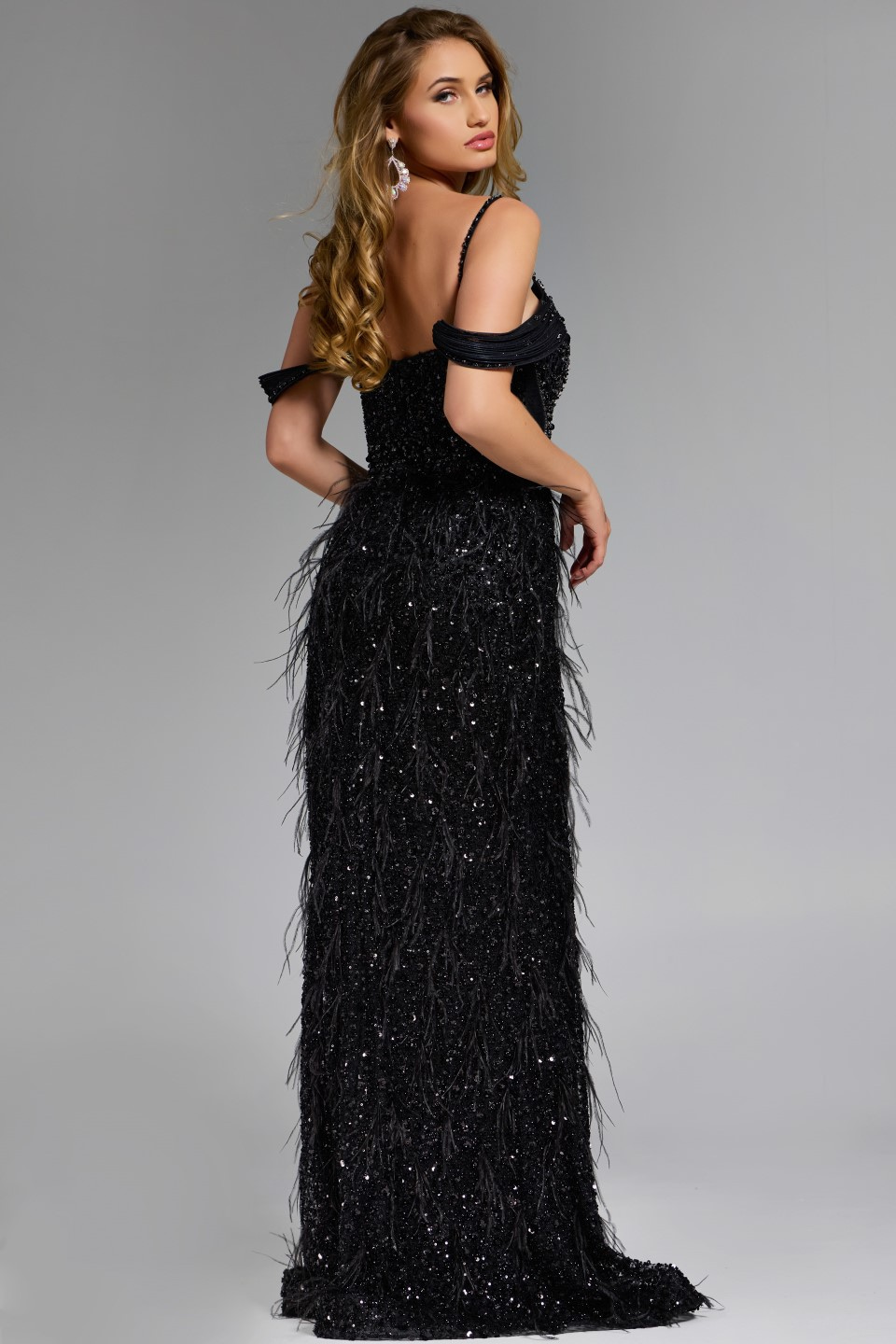 This exquisite gown captivates with its full-length design, offering a fitted silhouette that elegantly flares towards the hem. The sweetheart neckline beautifully frames the collarbone, adding a touch of sophistication. It features off-the-shoulder sleeves that seamlessly enhance its graceful charm. Adorned with shimmering embellishments and intricate feather detailing, the dress radiates elegance, making it perfect for an upscale event.