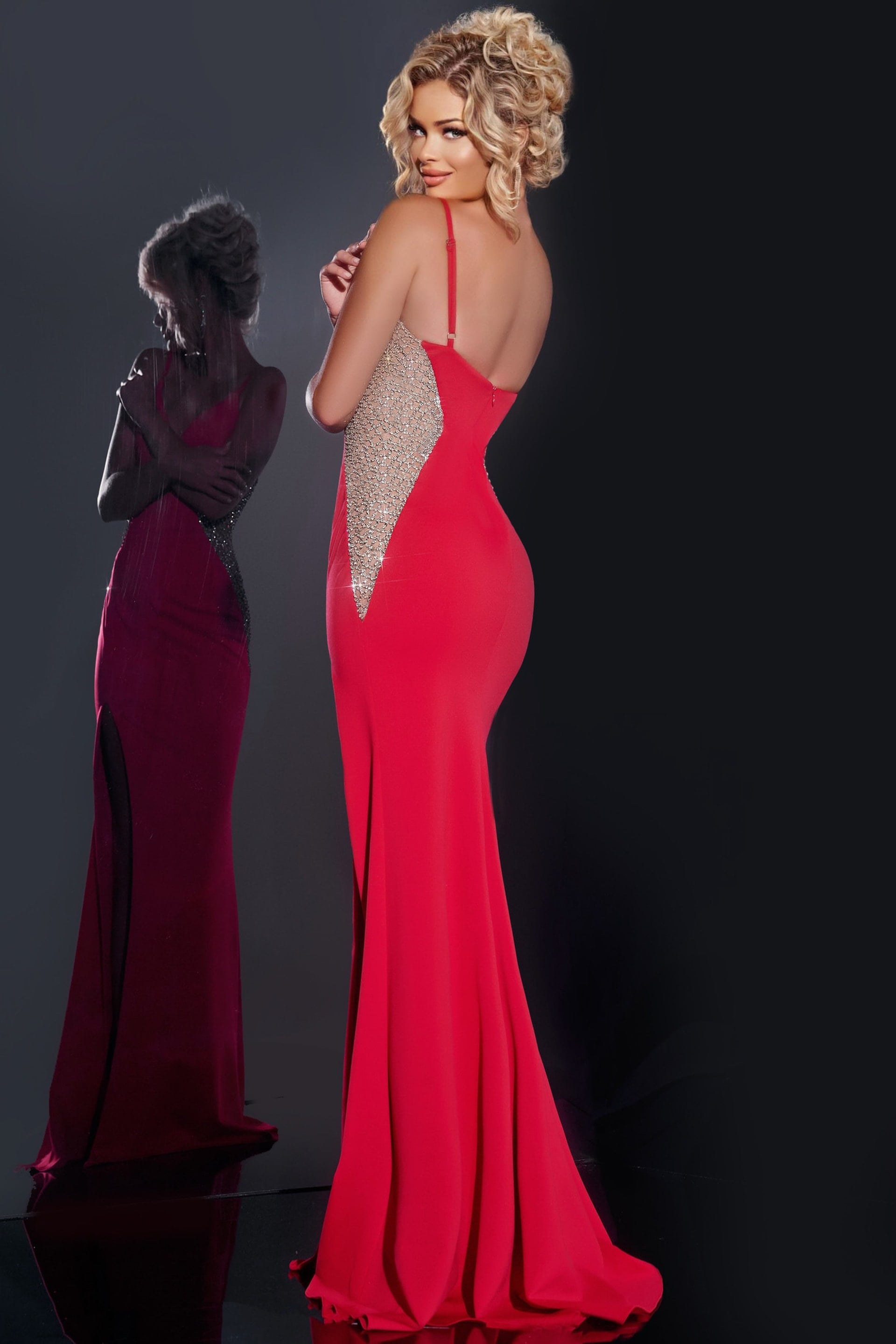 This stunning red gown features a sleek column silhouette and a captivating deep V-neckline. The sleeveless design is accentuated by elegant shoulder straps, highlighting the gently beaded panels on the sides that add a touch of sparkle. The dress extends to the floor with a graceful hemline and includes a daring high slit for added allure, allowing ease of movement and an extra touch of drama.