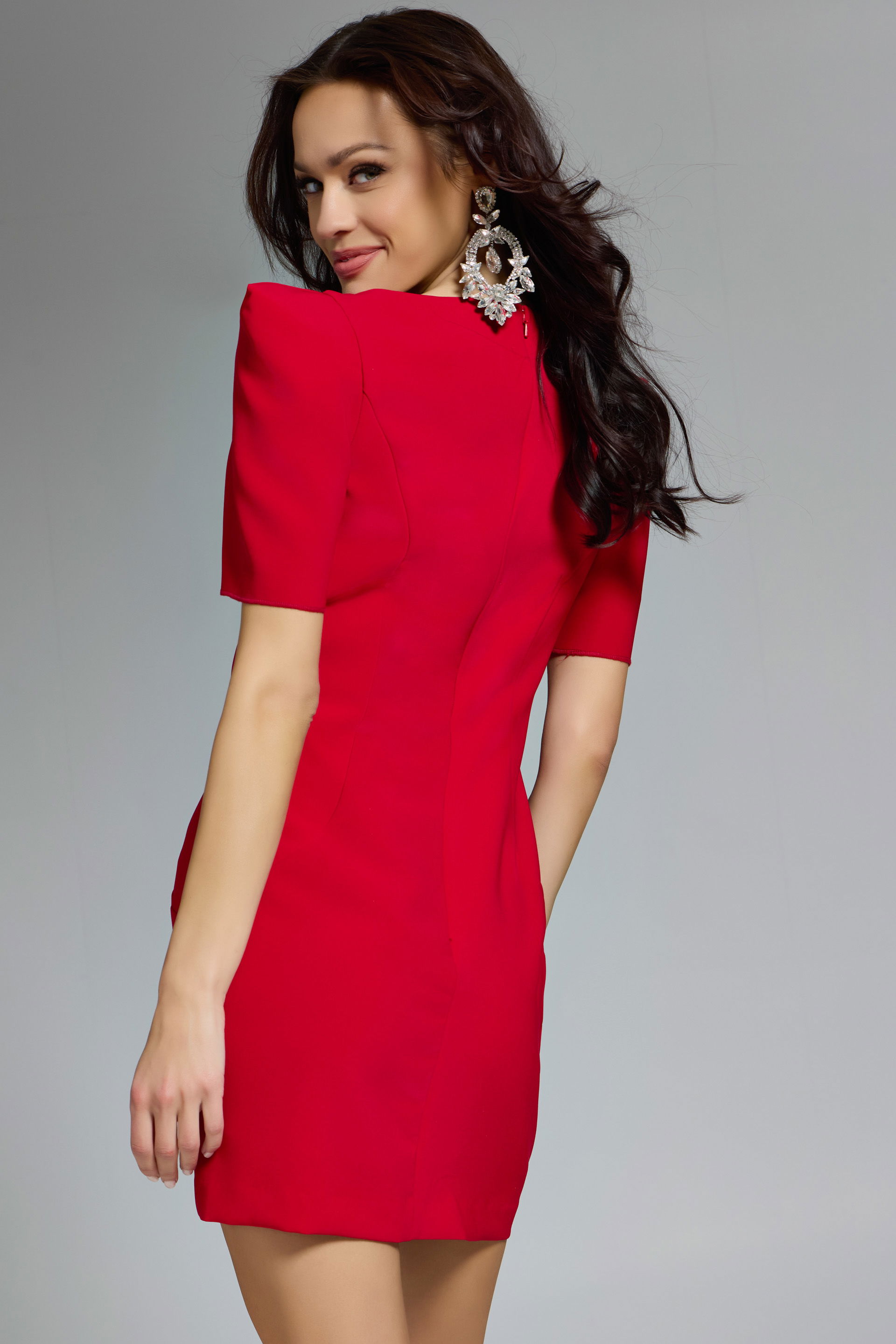 The Jovani 42745 dress boasts an elegant, fitted silhouette that beautifully contours the figure. Crafted in a vibrant red hue, it features a classic crew neckline and striking cap sleeves. The dress falls to a chic knee length, highlighting its sophisticated design. A simple yet captivating piece, it’s perfect for a range of formal occasions.