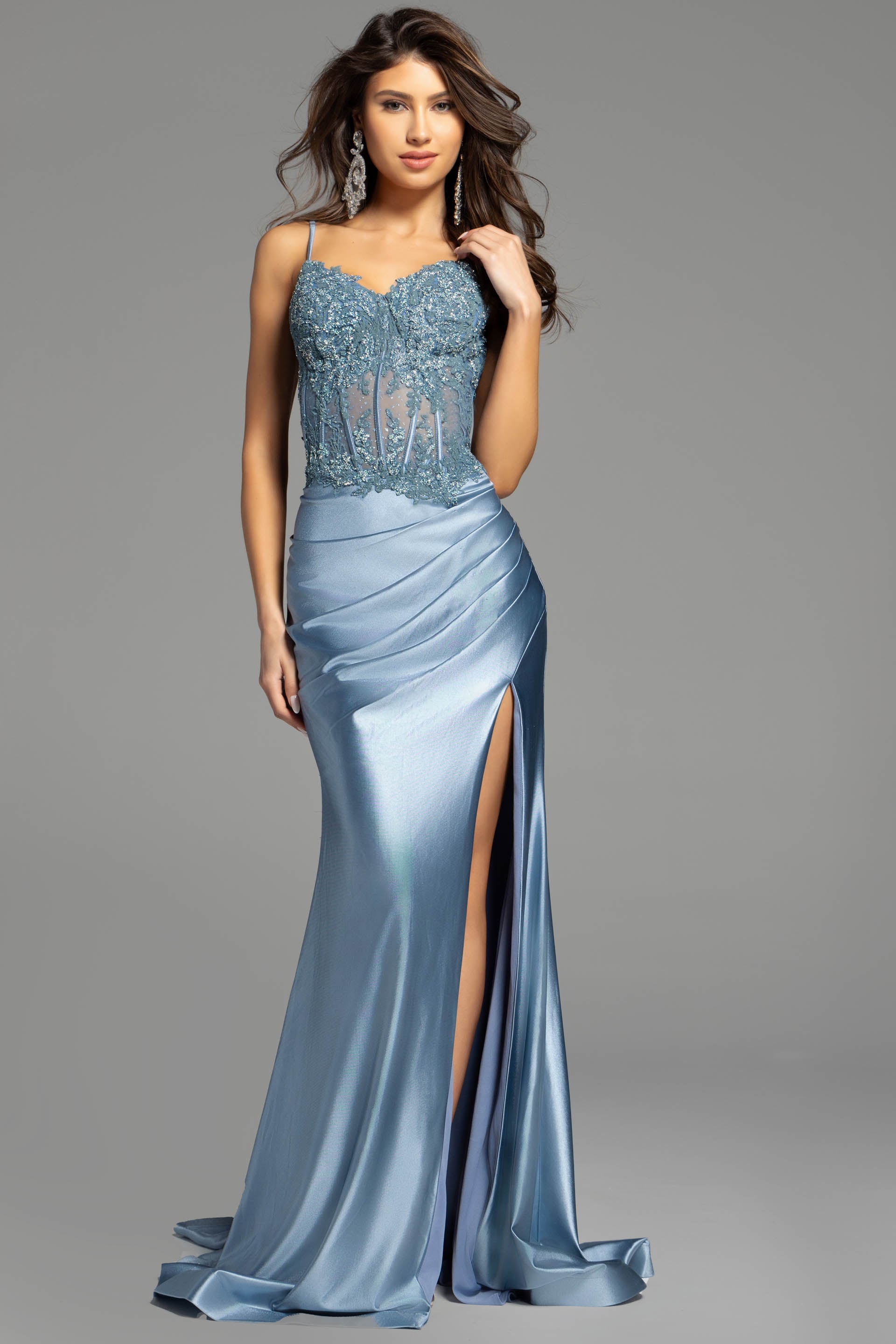 The Fitted Satin Gown with Beaded Bodice and High Slit 42259 captures elegance and sophistication perfectly. Crafted from luxurious satin, this sumptuous gown features an intricately beaded bodice that adds a touch of glamour and sparkle. The striking V-neckline enhances its allure, while the high slit adds a daring and sensual flair, making it ideal for evening events. The sleeveless design showcases your shoulders beautifully and allows for effortless movement. This long, fitted silhouette gracefully hugs your curves, creating a stunning and flattering figure. The gown’s embellishments and embroidery details make it a true statement piece for any formal occasion.