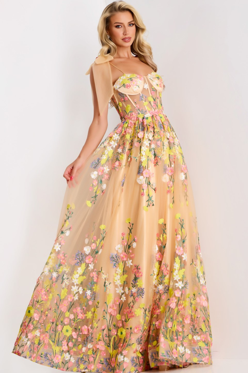 This enchanting dress features a full-length A-line silhouette that effortlessly flows from the fitted corset bodice. Its sweetheart neckline is beautifully complemented by delicate ribbon shoulder straps. The gown is adorned with exquisite floral embroidery, adding a touch of romance and elegance. The back is equally captivating with a lace-up detail, ensuring a perfect fit.