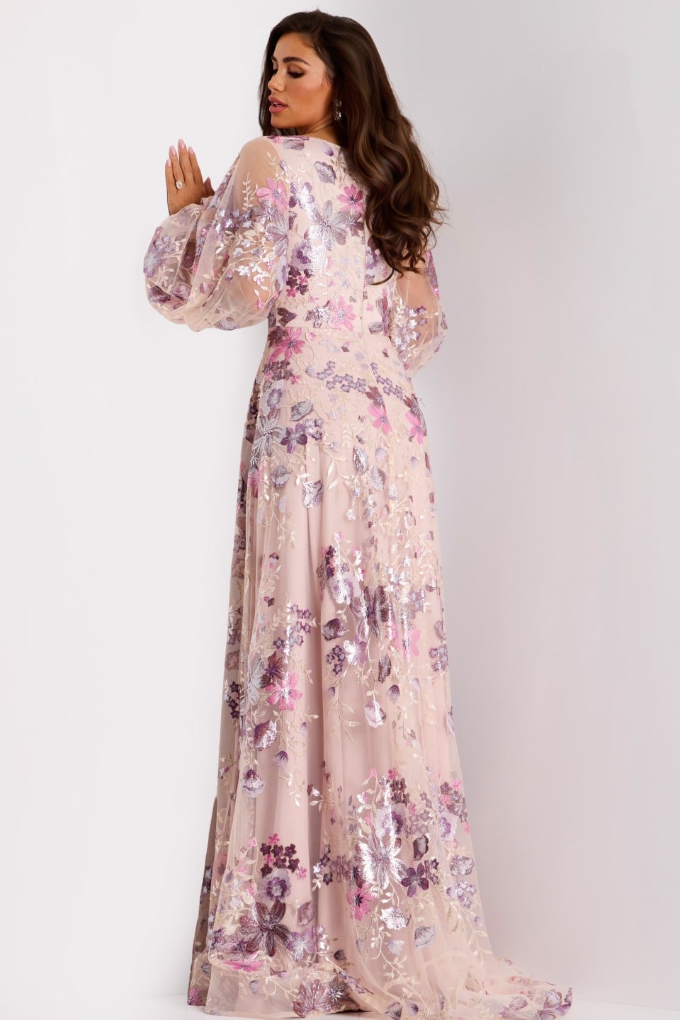 This exquisite floral embroidered gown features a full-length A-line silhouette that flows gracefully with every step. The captivating plunging V-neckline is both elegant and daring, while the long bishop sleeves add a touch of ethereal charm. Adorned with intricate floral embroidery, the gown is completed with a high slit that adds a modern twist to this classic design.