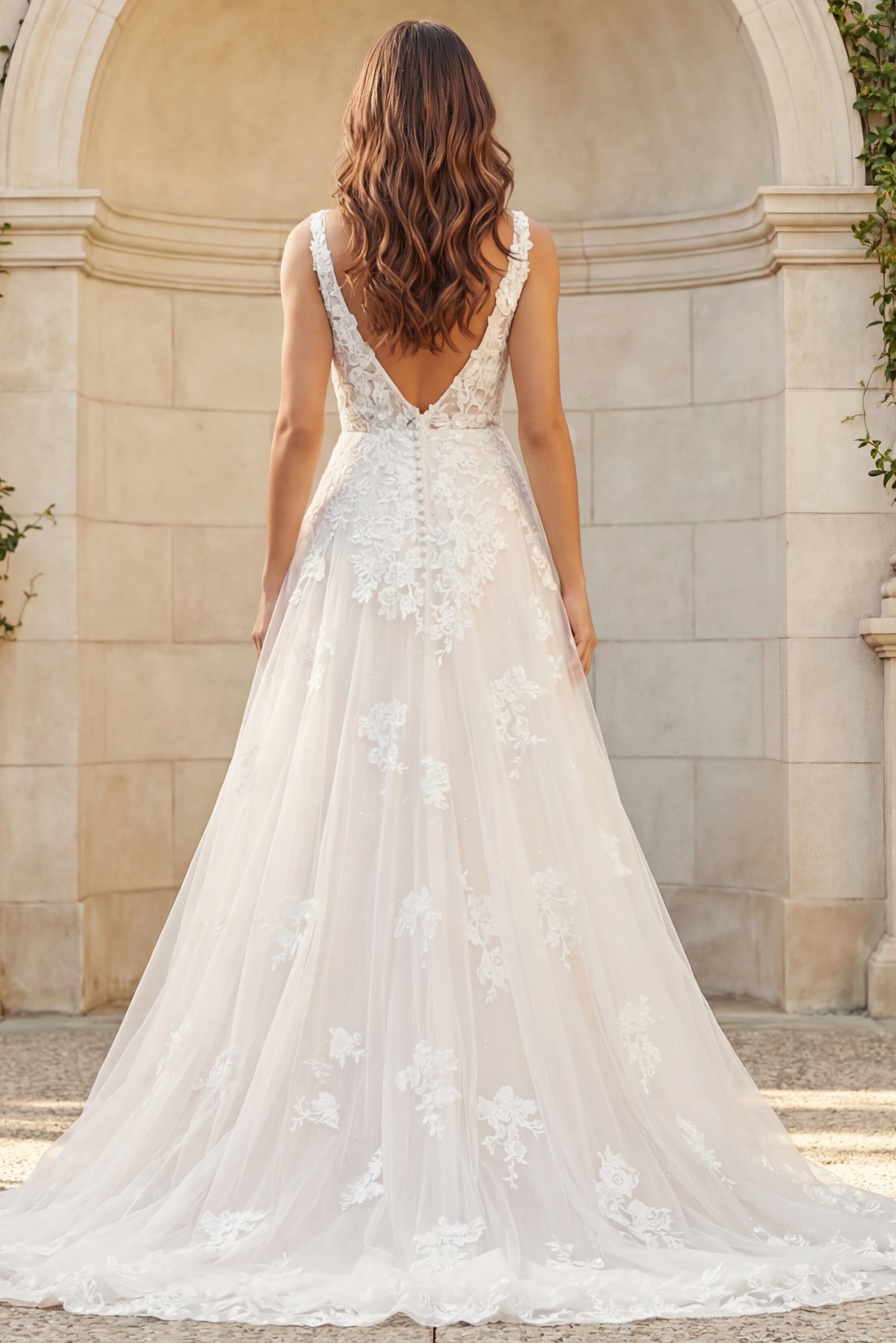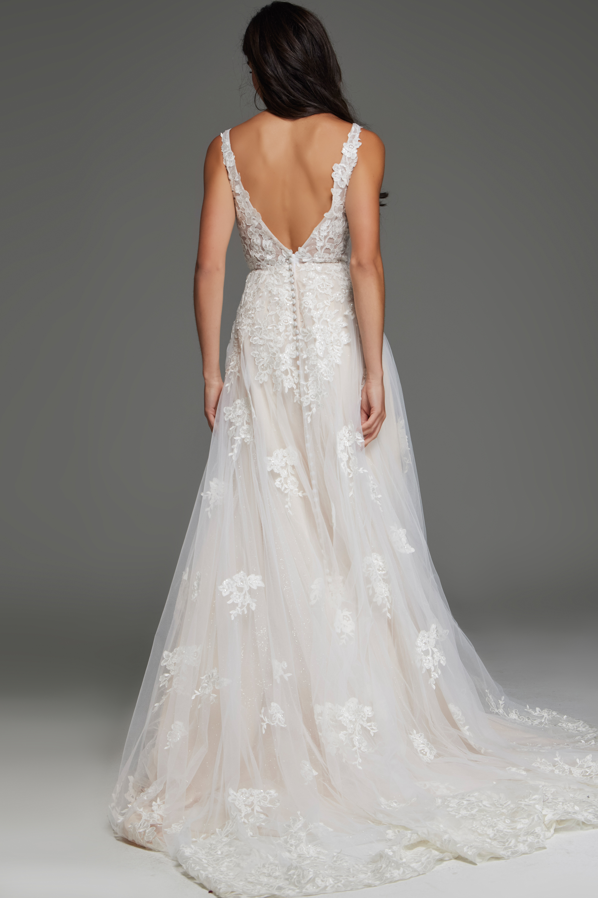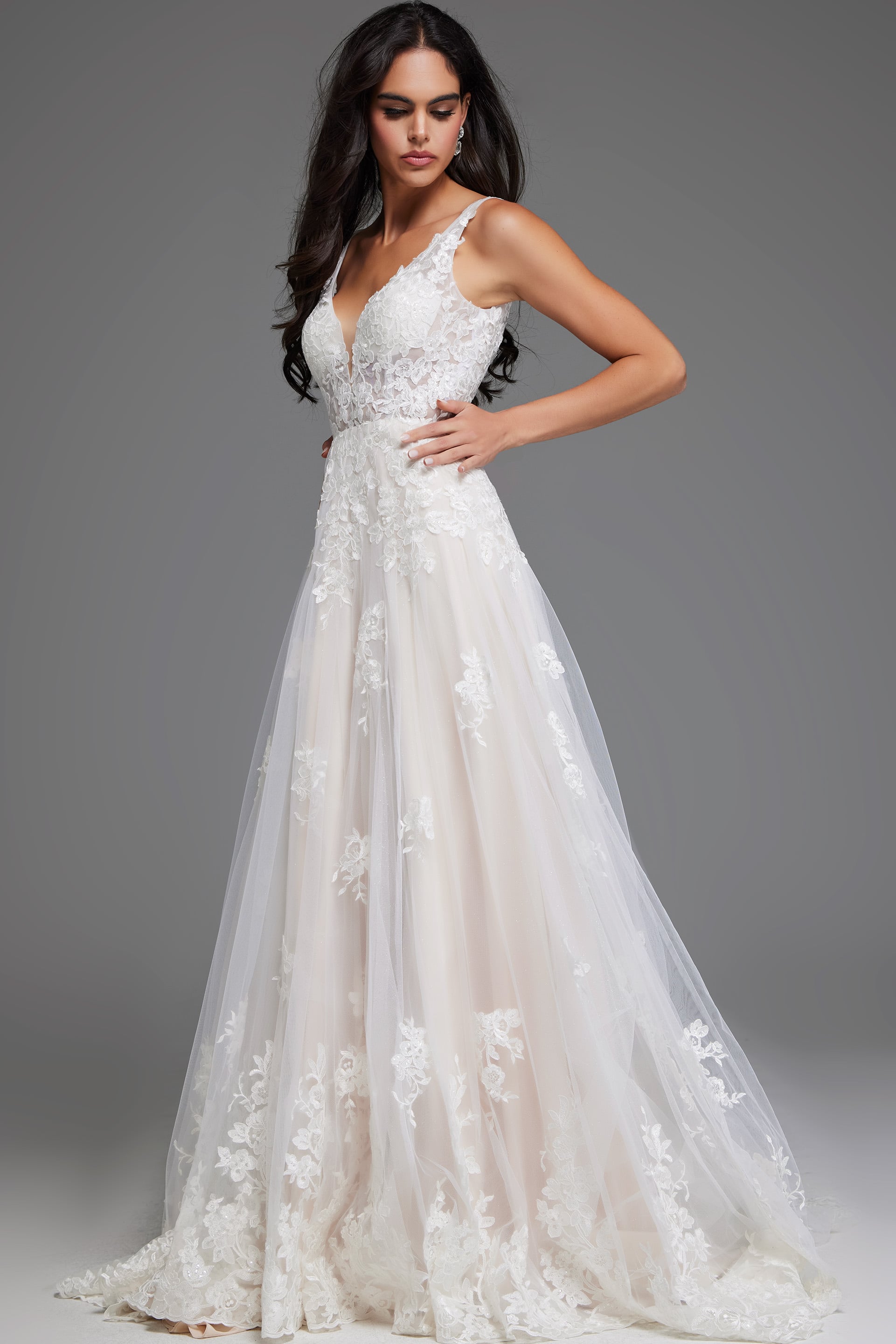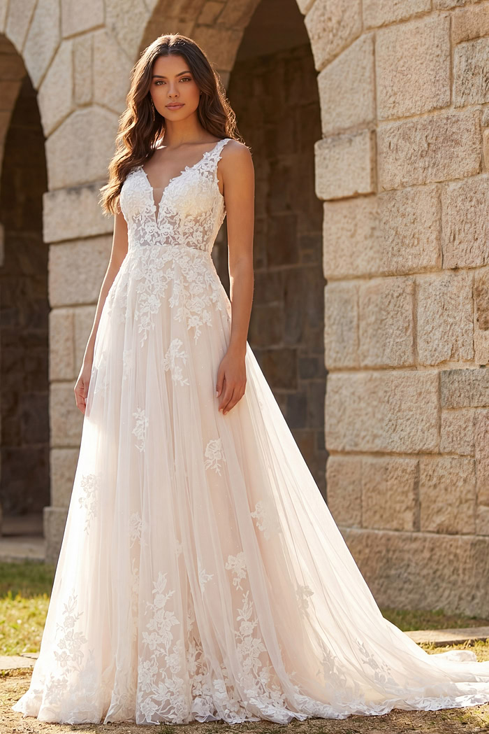 Floral Lace A-Line Bridal Gown with Plunging V Neck and Train JB220005. Step into timeless elegance with this stunning bridal gown featuring a plunging V-neckline that enhances your femininity. The floral lace detailing embodies a romantic and intricate appeal, while the A-line silhouette gracefully drapes to the floor, creating a dreamy and enchanting look. Crafted with luxurious tulle fabric, this gown flows effortlessly, perfect for your fairy-tale wedding. The closed back provides a sophisticated finish for a day to remember.