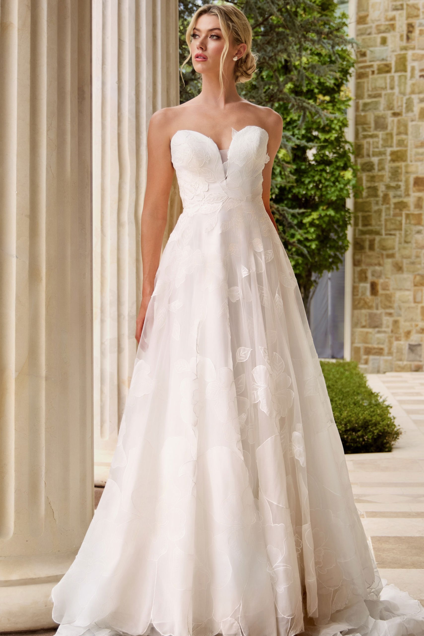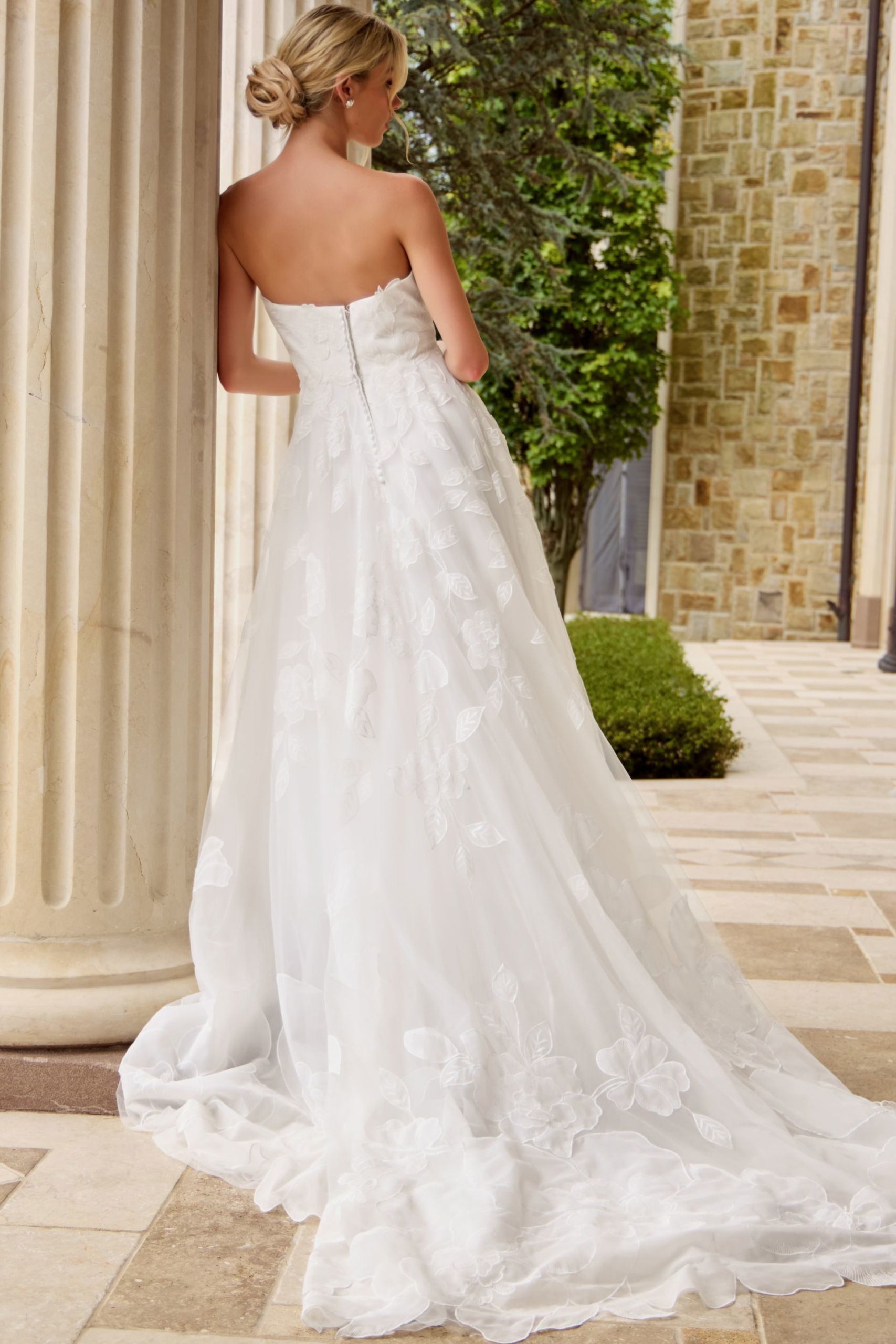 Sheer bodice with appliqué accents, floral lace overlay, chapel train