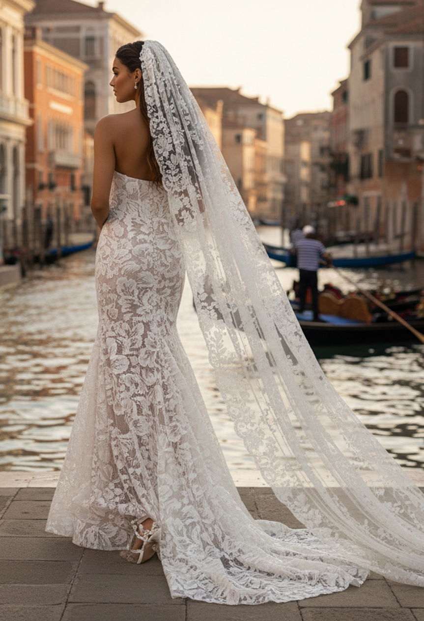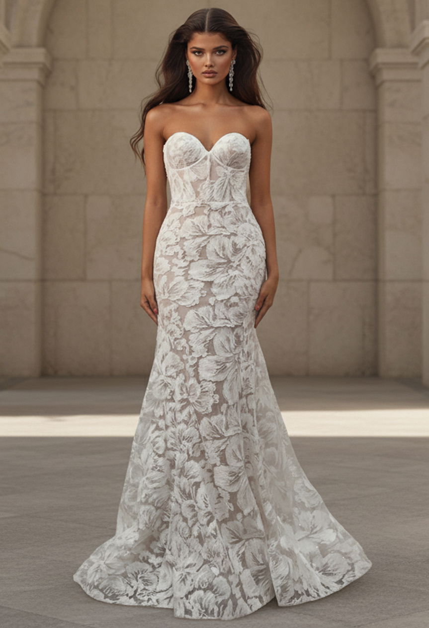 3D Floral Appliqués, Sheer Illusion Bodice, Lace Train