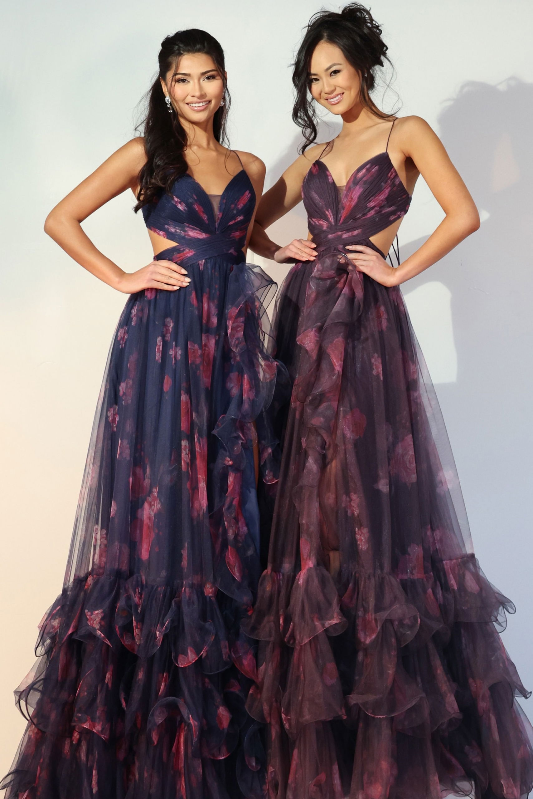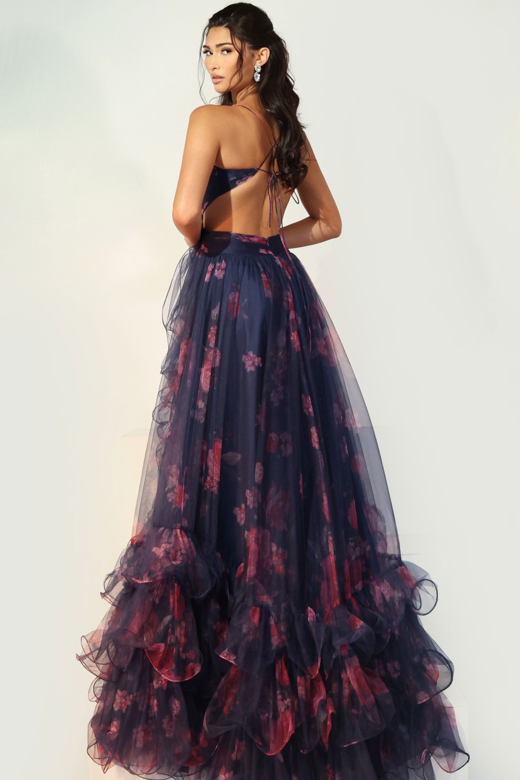 3D ruffle tiers, ruched bodice, floral motif, side cutouts