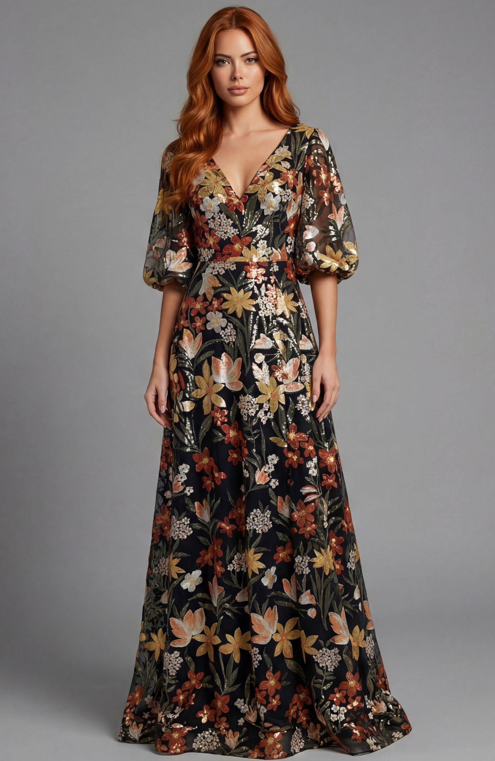 Floral V Neck Gown With Puff Sleeves 44656