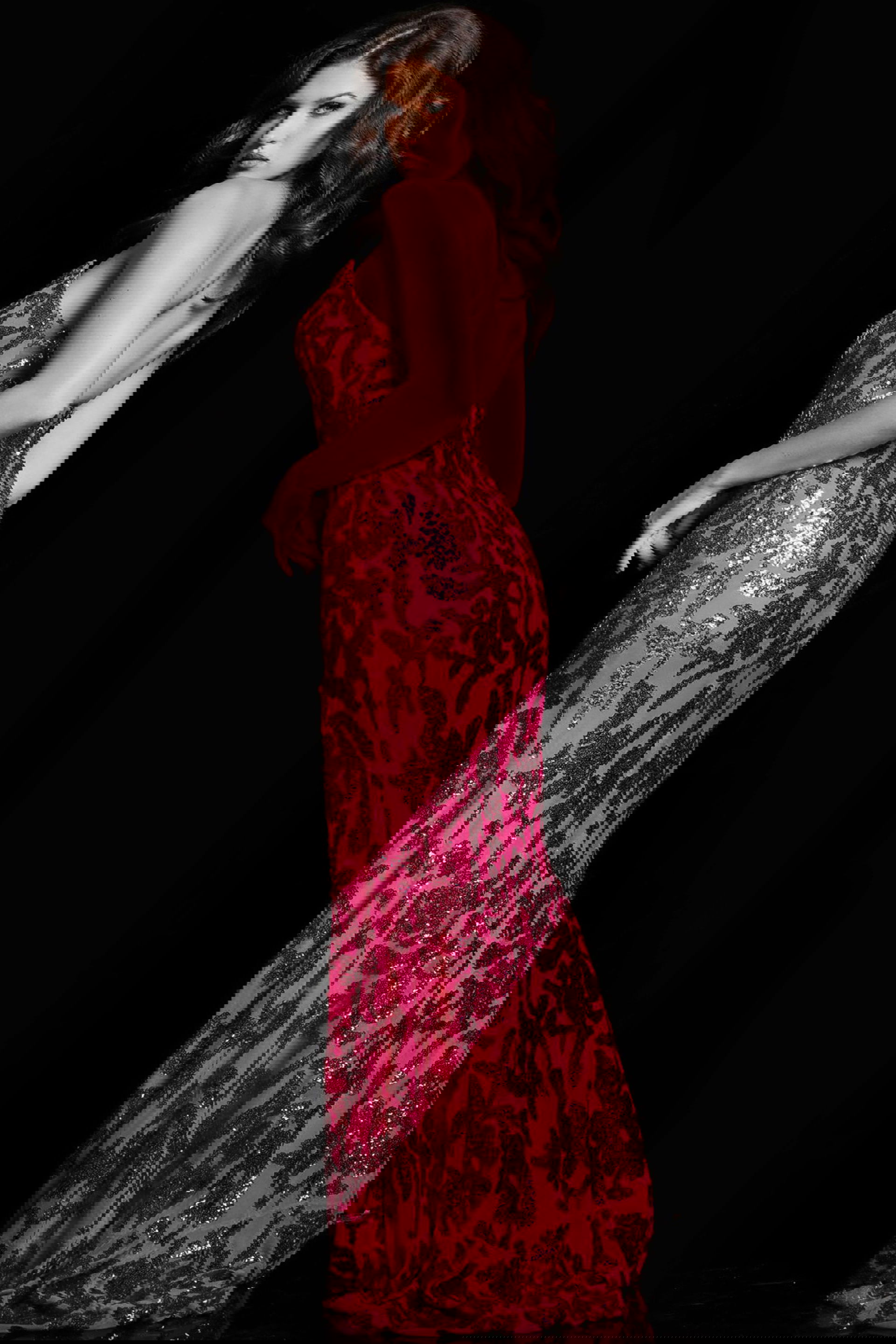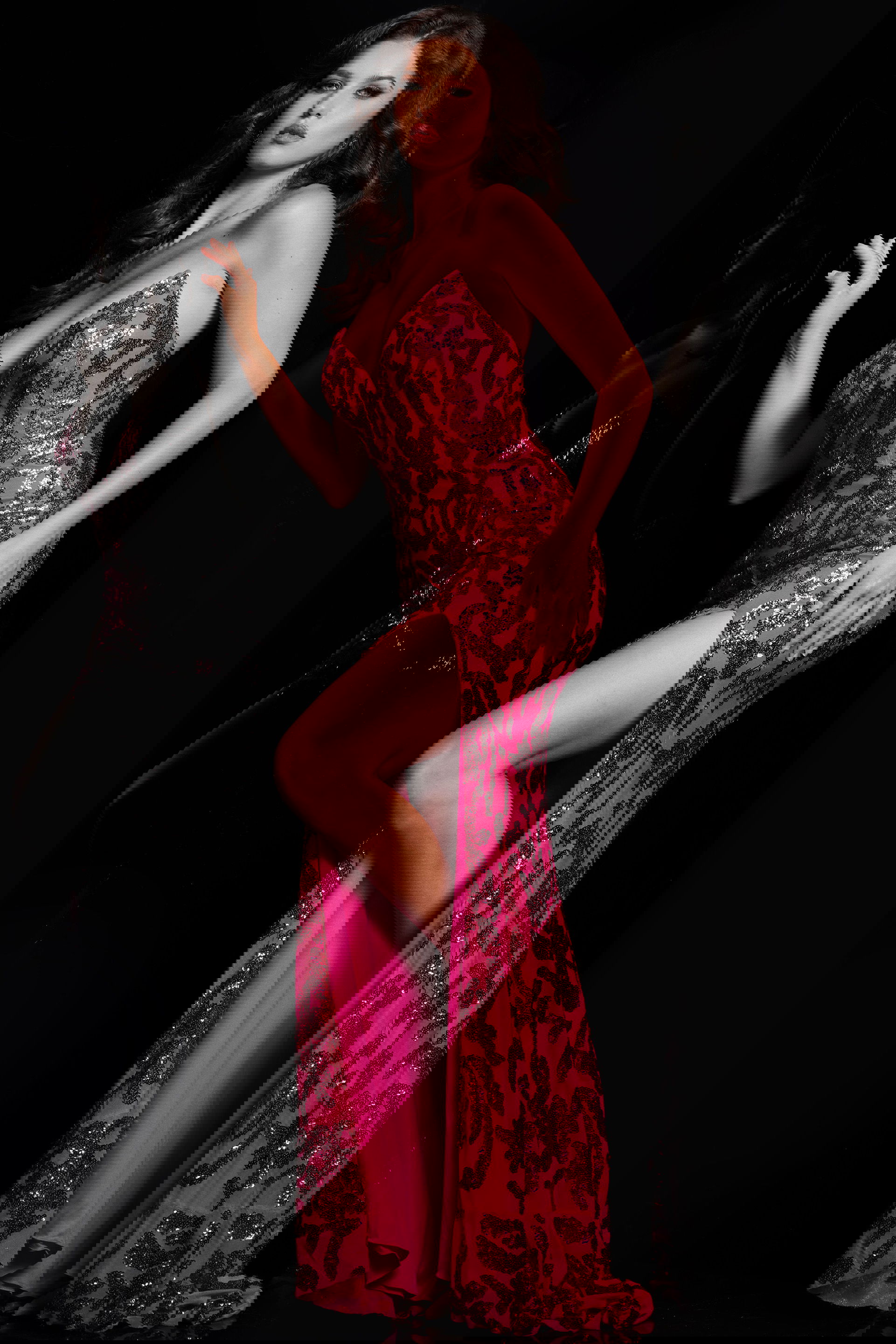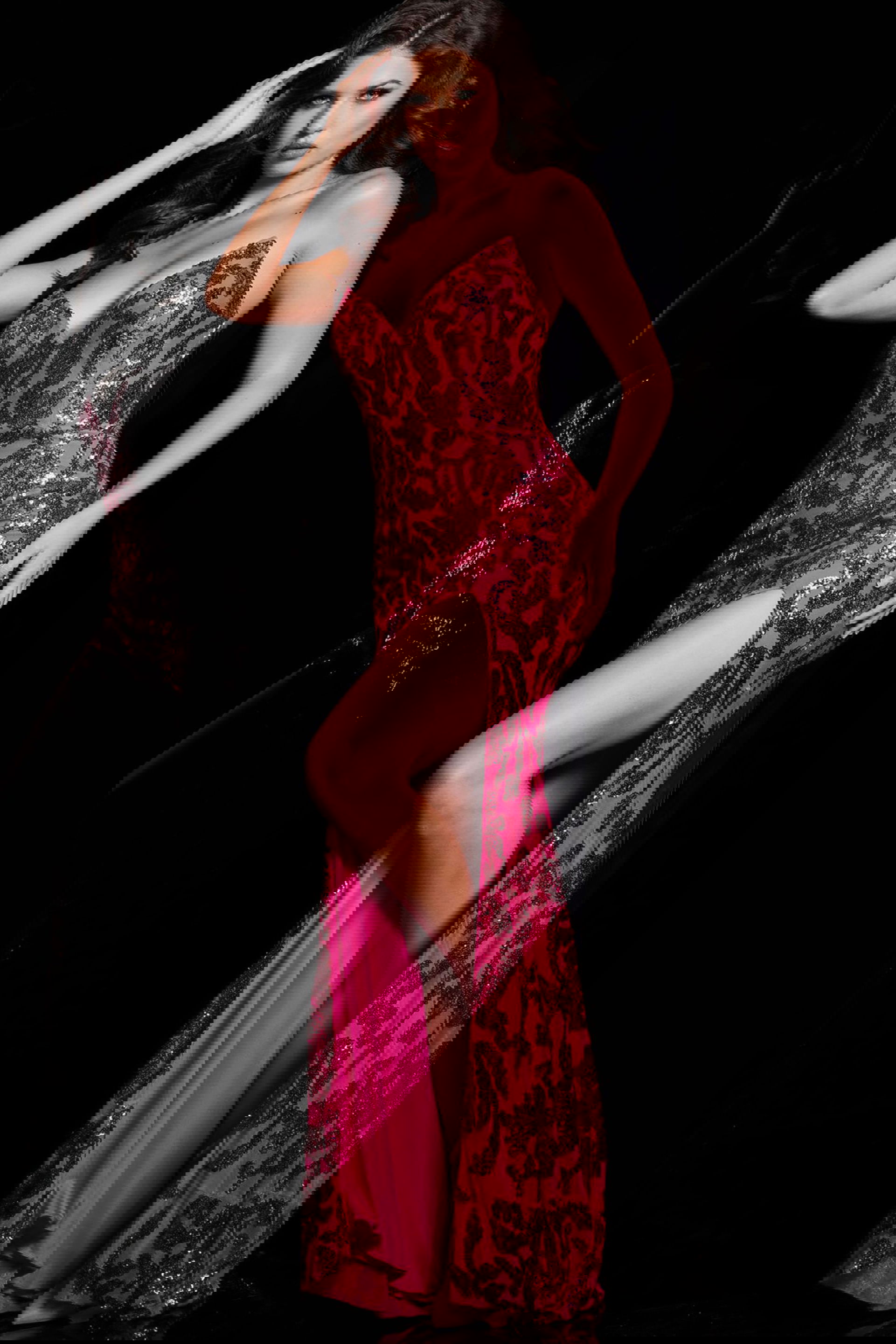 This fitted gown is embellished with sequins, creating a stunning and captivating look that exudes opulence and luxury, making it the perfect choice for special occasions.