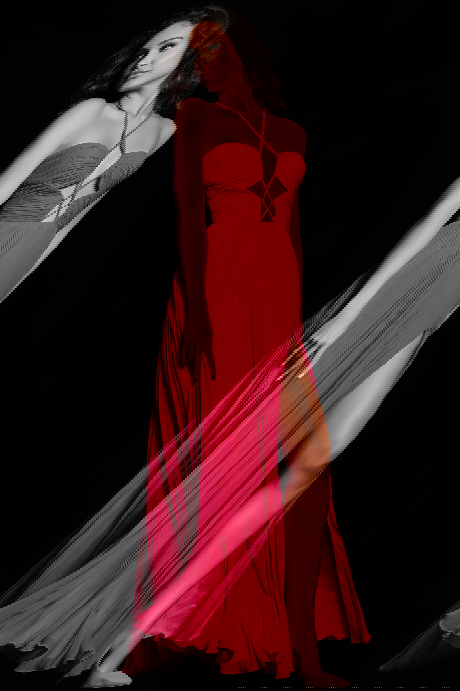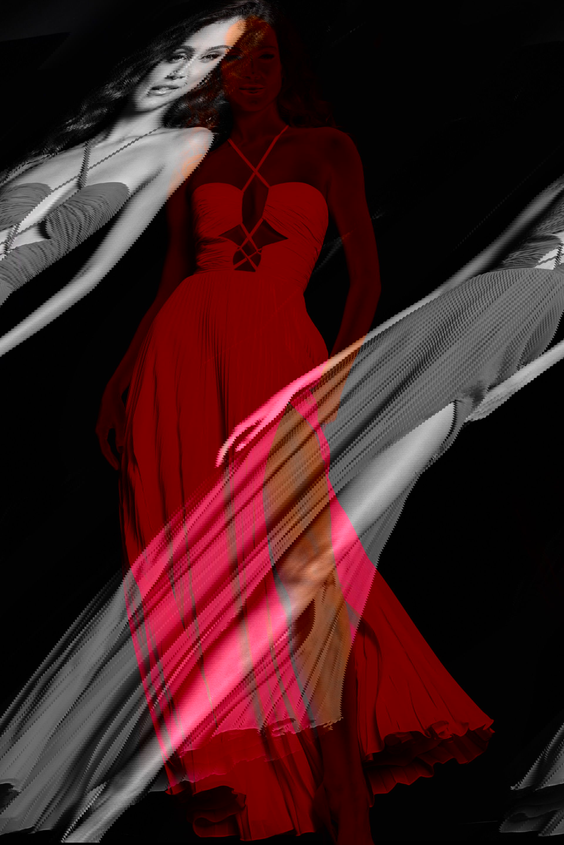 The pleated cut-out bodice is a unique and eye-catching feature of this gown. It adds a sense of texture and dimension to the dress, creating a stylish and modern look. The cut-out detailing also offers a glimpse of skin, adding a touch of sensuality.