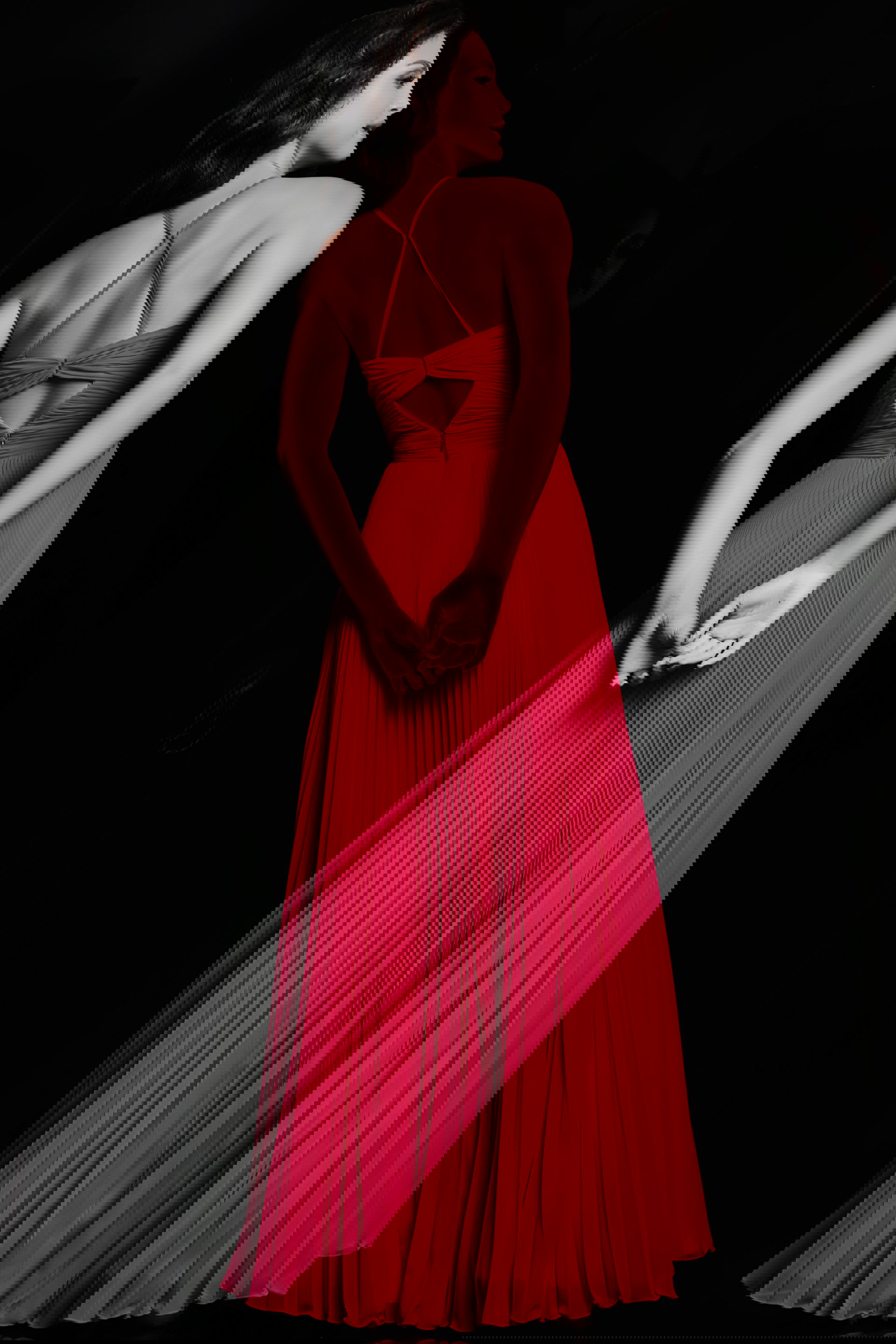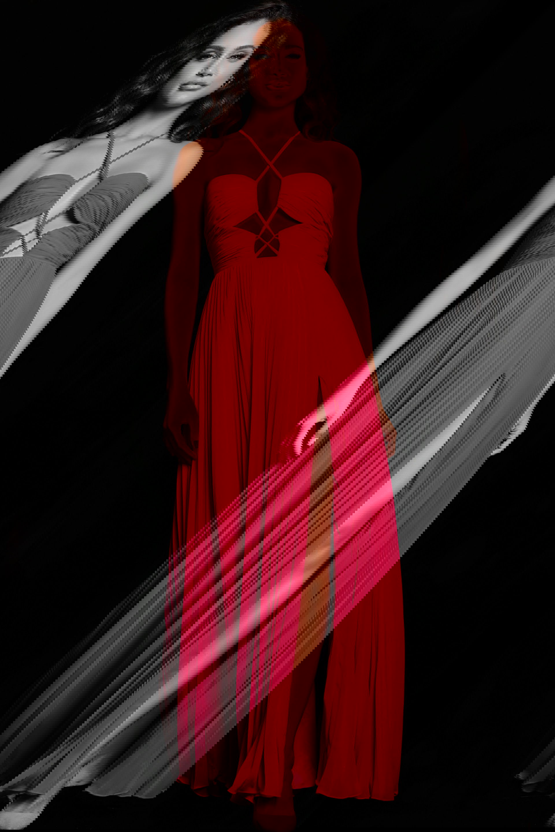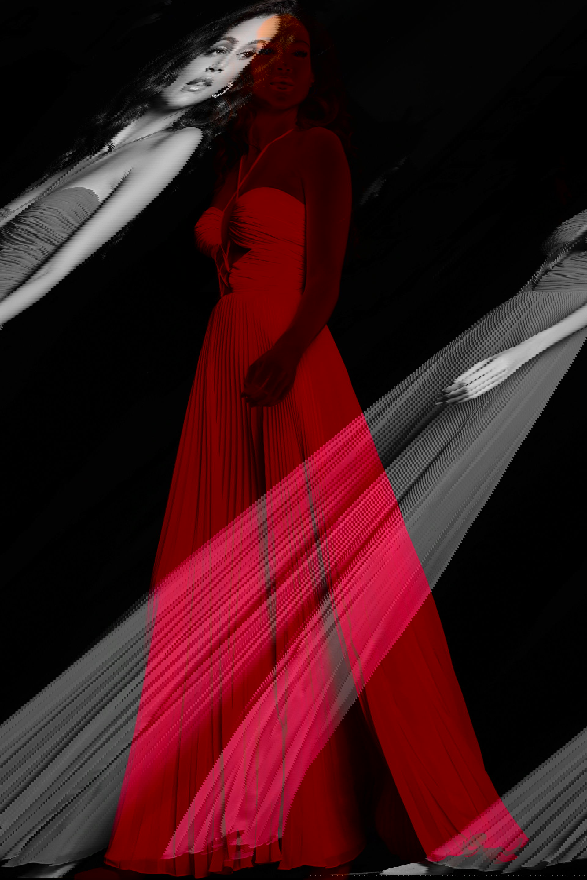 This maxi-length gown features a pleated skirt with a high slit and a sweeping train. The pleated skirt adds a touch of sophistication and movement to your look, while the high slit offers a hint of allure and allows for ease of movement. The sweeping train adds an extra element of drama and grandeur to the overall design.