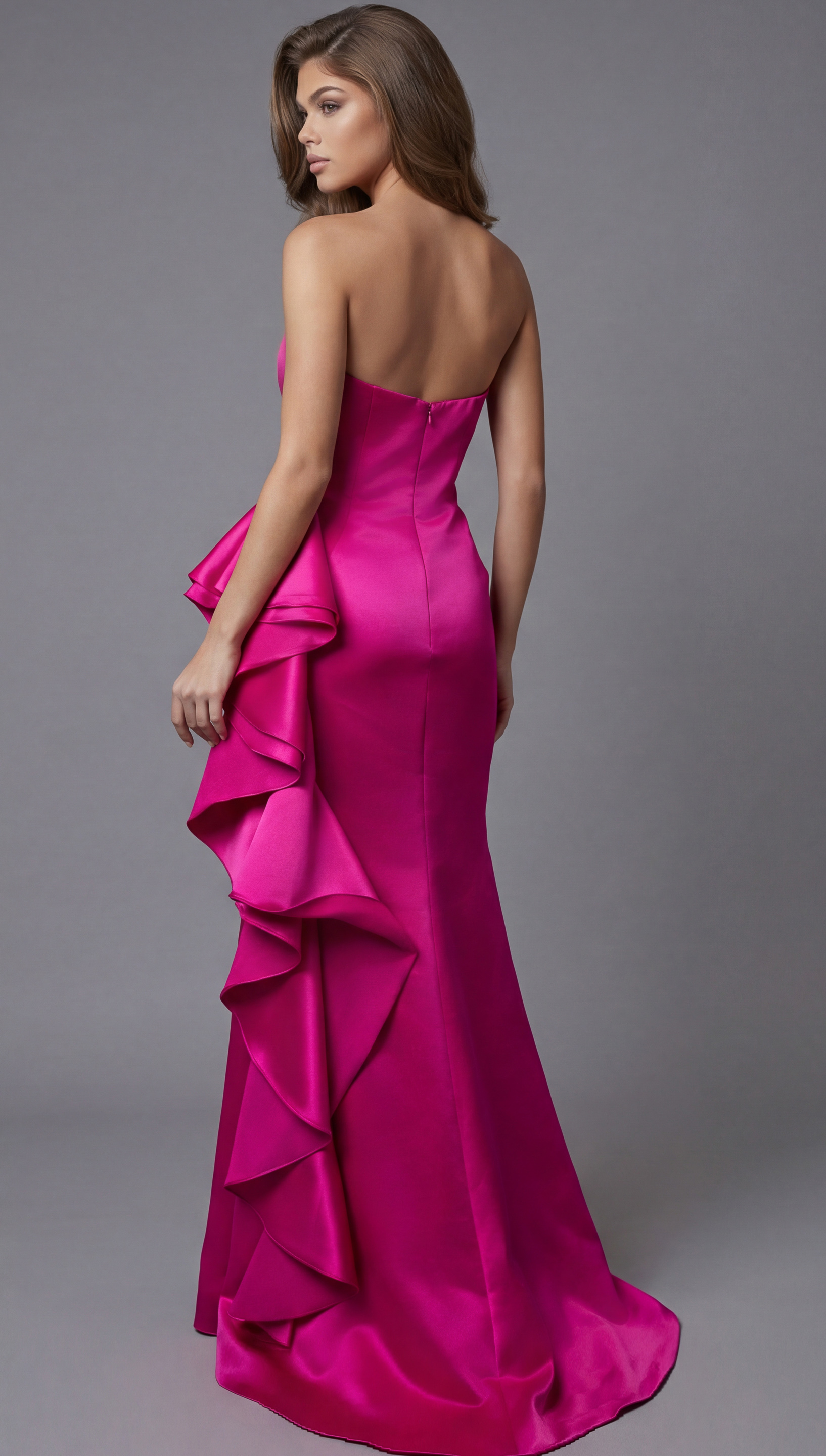 Fuchsia Satin Strapless Gown with Cascading Ruffle 47386