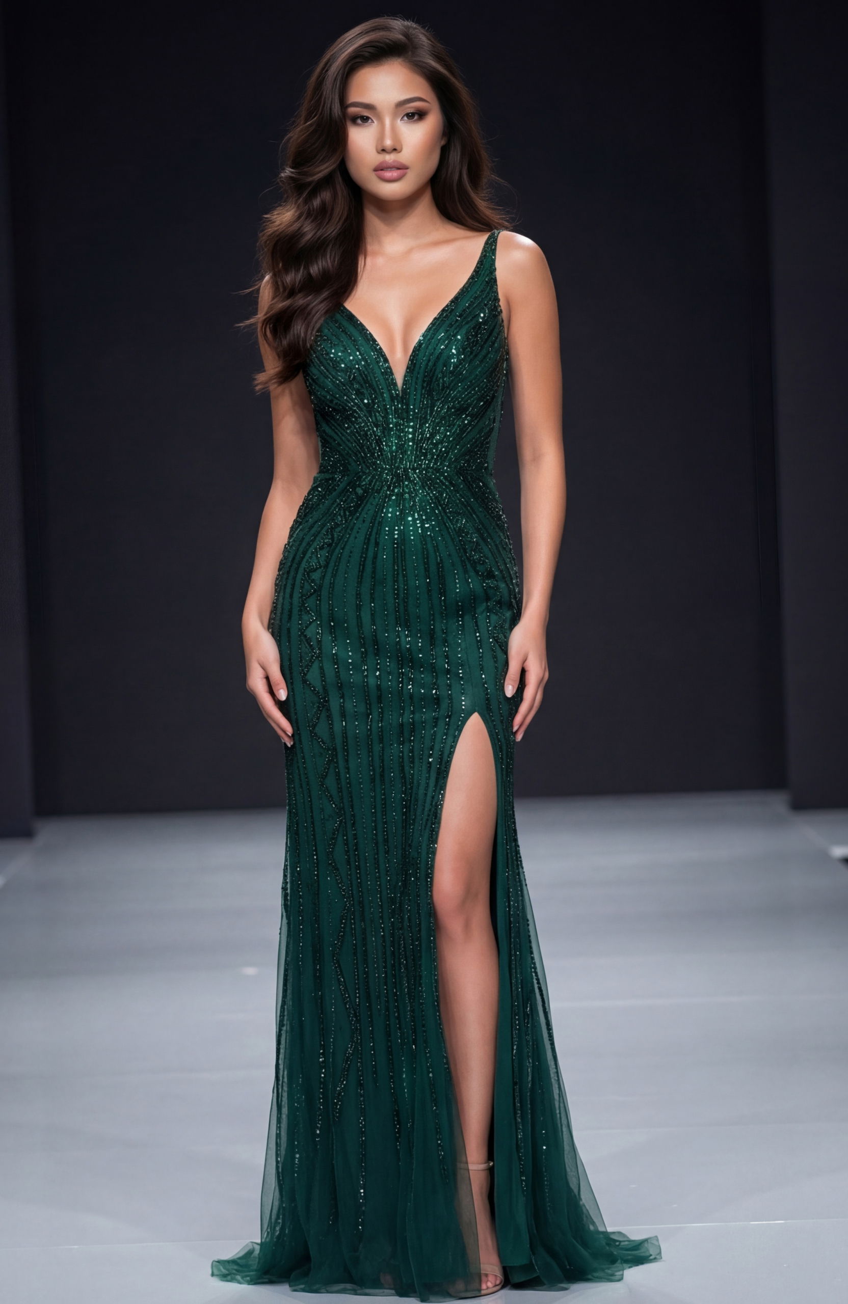 Embrace elegance with this captivating silver gown that features an exquisite fitted silhouette, beautifully showcasing your figure. The dress is adorned with intricate beading, adding a touch of sparkle to every move. Its deep V-neckline complements the sleeveless design, creating a delicate yet bold look. The gown is full-length, gracefully flowing to the floor, with a high slit that adds a daring twist. The open back design adds an extra element of allure, making this dress perfect for any elegant occasion.