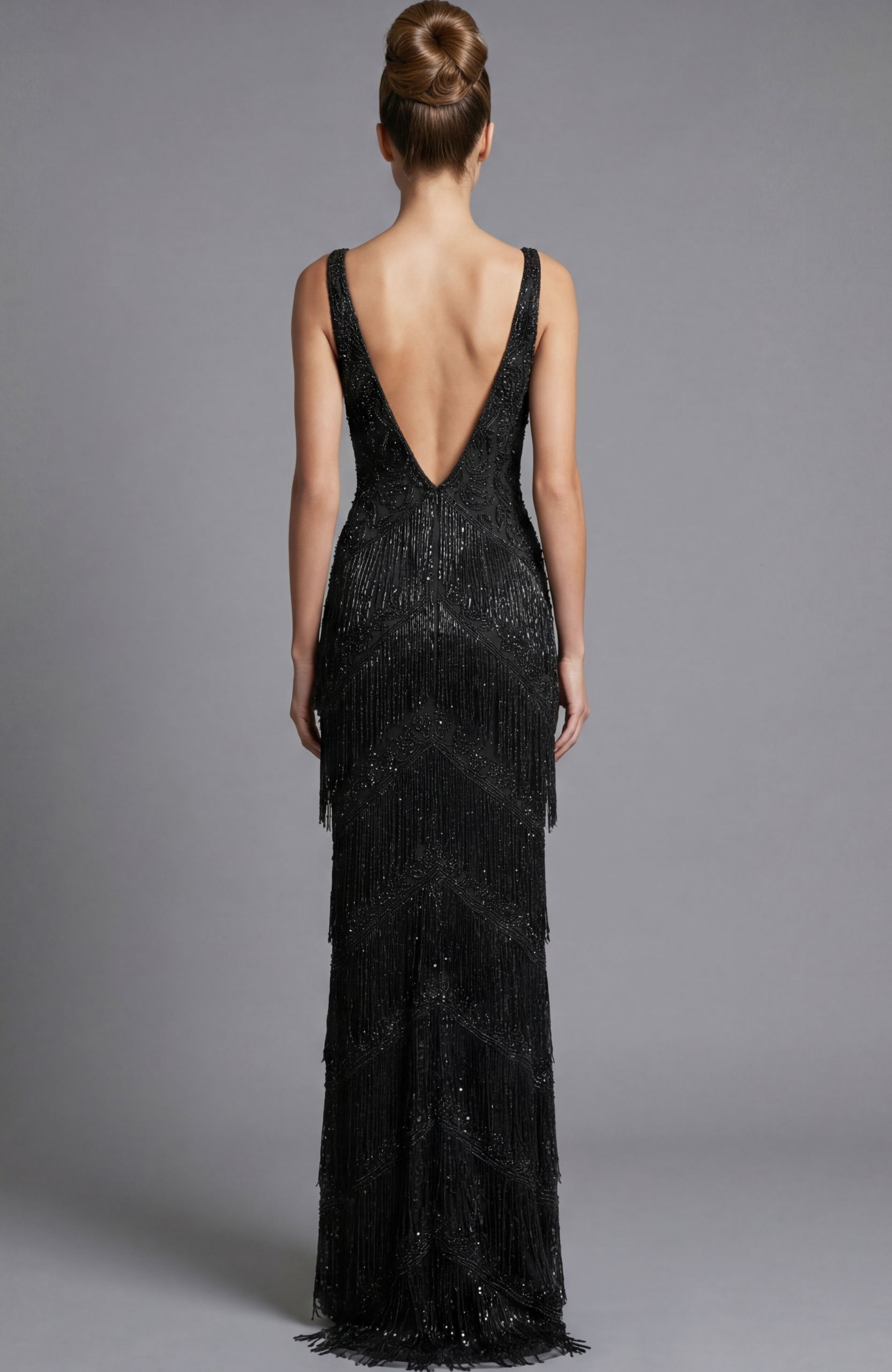Layered fringe, beaded bodice, high slit, shimmering accents