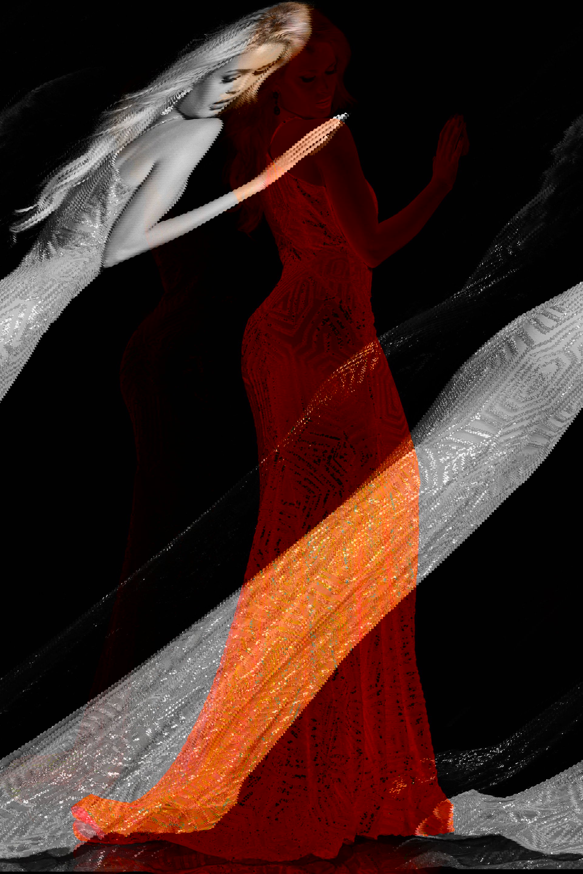 The dress is embellished with sequins, adding a touch of sparkle and creating a captivating effect. The floor-length gown features a train that enhances the overall glamour and drama, making it a perfect choice for formal events.