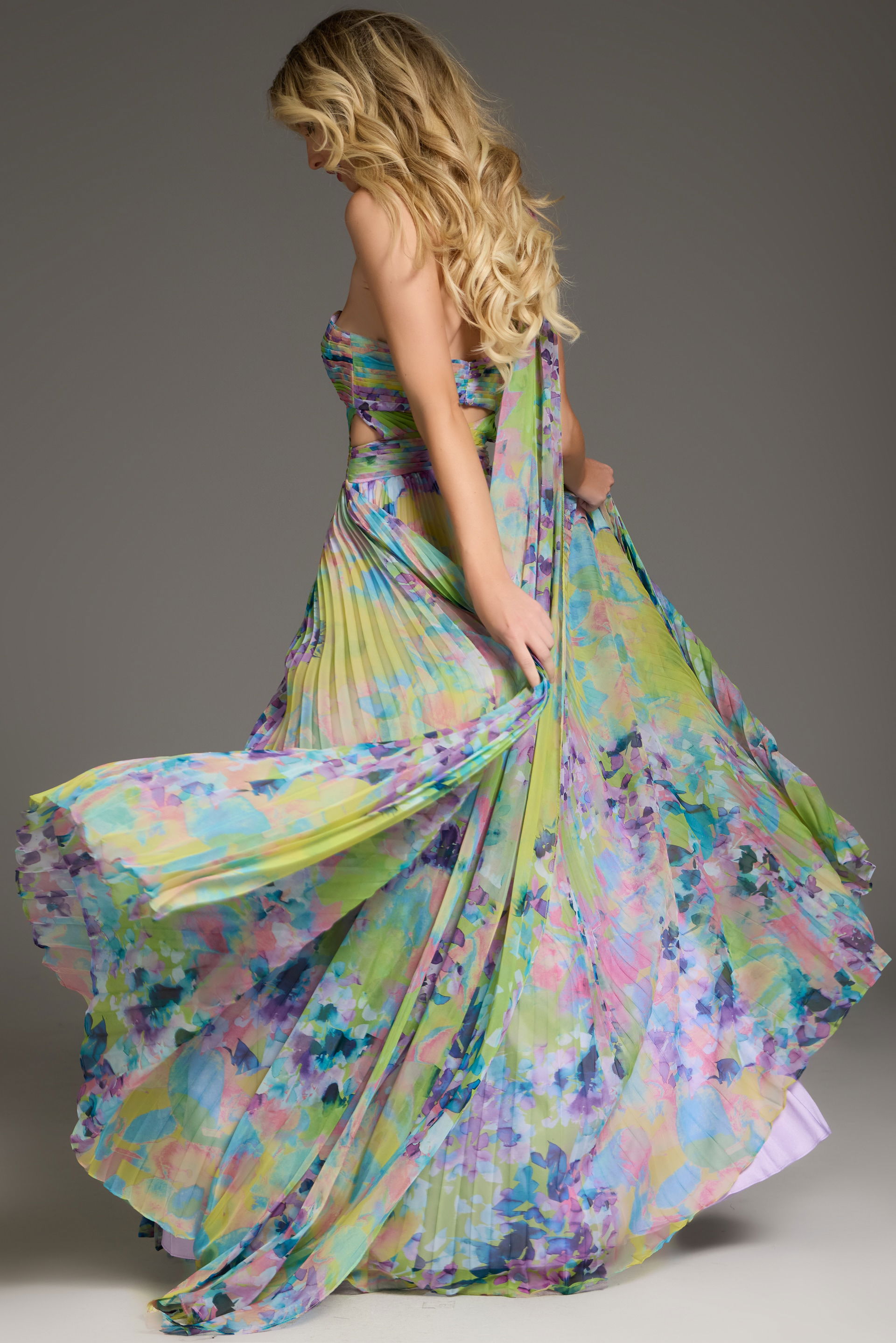 This captivating floor-length dress features a flowing silhouette with a vibrant print design. The dress boasts a playful halter neckline with an alluring keyhole cutout, enhancing its unique style. The sleeveless design and sweeping A-line skirt create an elegant look, further accentuated by pleated details that flow gracefully. Perfect for making a statement at any event.