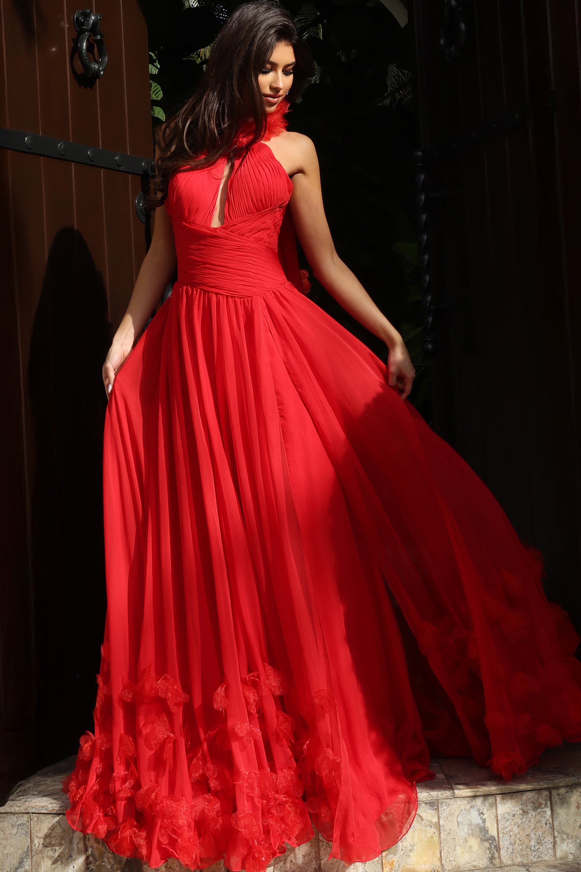 Halter Neck Pleated Gown With Floral Appliqué 42861