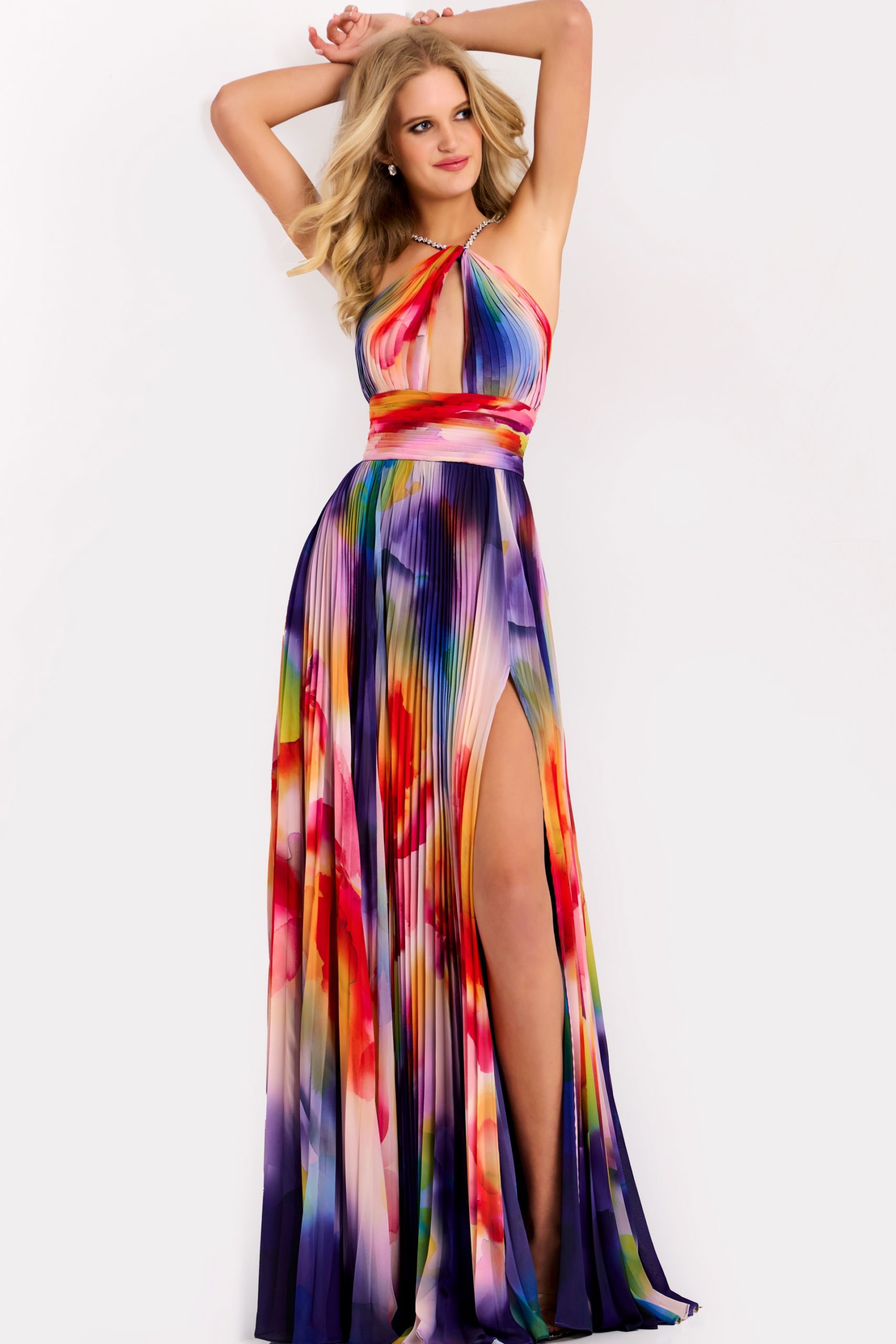Watercolor Print, High Slit, Flowing Overlay, Draped Skirt