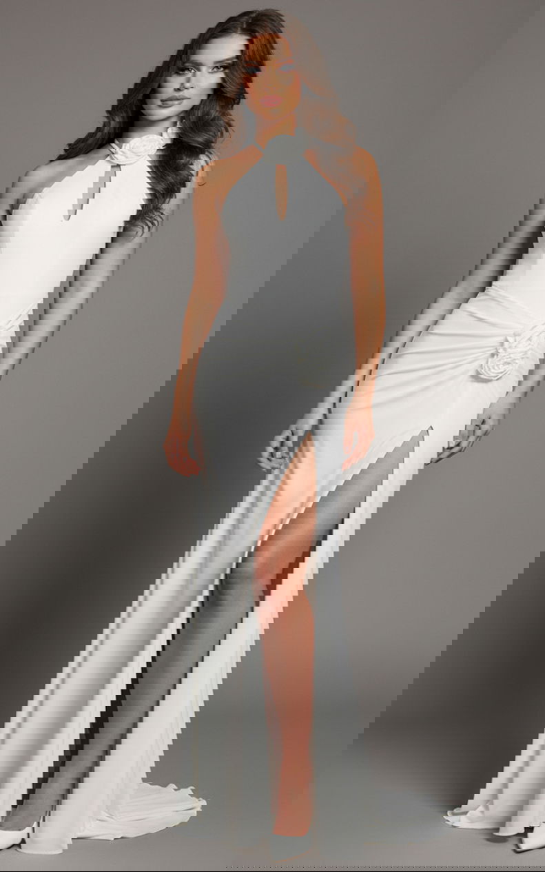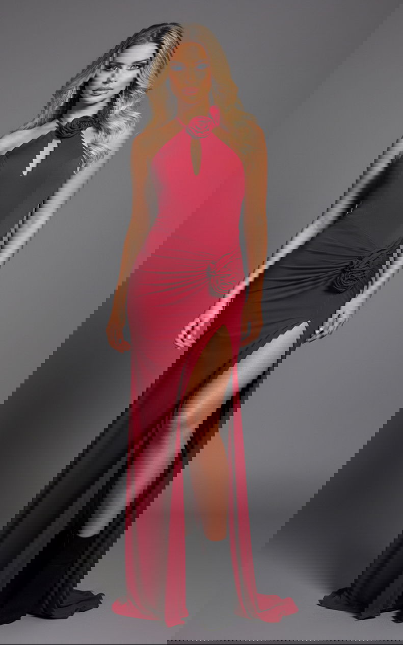 Pink halter neck Jersey backless prom dress with rosette details and keyhole on the neckline made in jersey stretched fabric featuring high side slit on the side.
