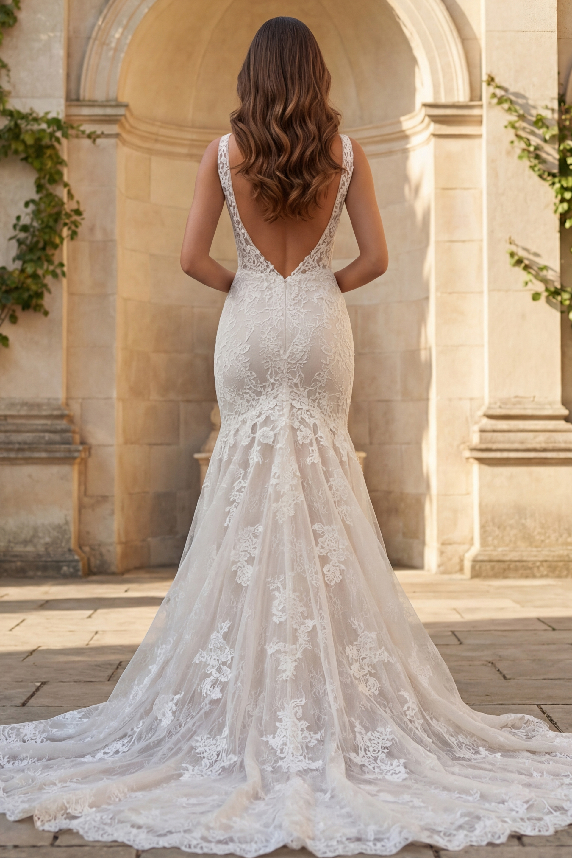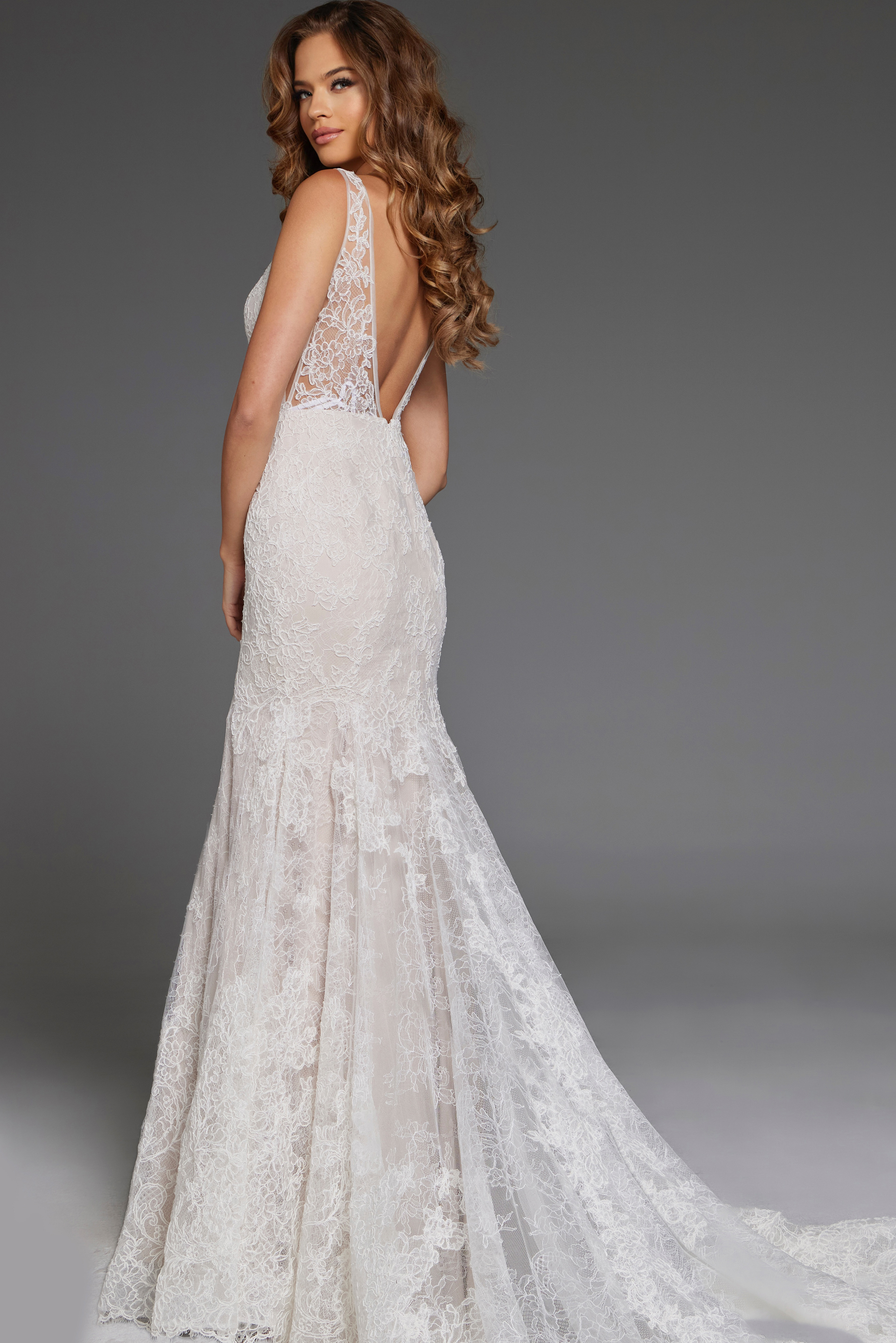 Intricate Lace Wedding Gown with Deep V Neckline and Flowing Train JB43894. This breathtaking wedding gown features luxurious lace fabric adorned with intricate details. The deep V-neckline adds a touch of sensual elegance, while the sleeveless design keeps it timeless and chic. Boasting a flattering fit and flare silhouette, this gown accentuates your curves beautifully and cascades down to a floor-length, flowing train that commands attention. Perfect for the modern bride seeking a blend of romantic and classic elements on her special day.