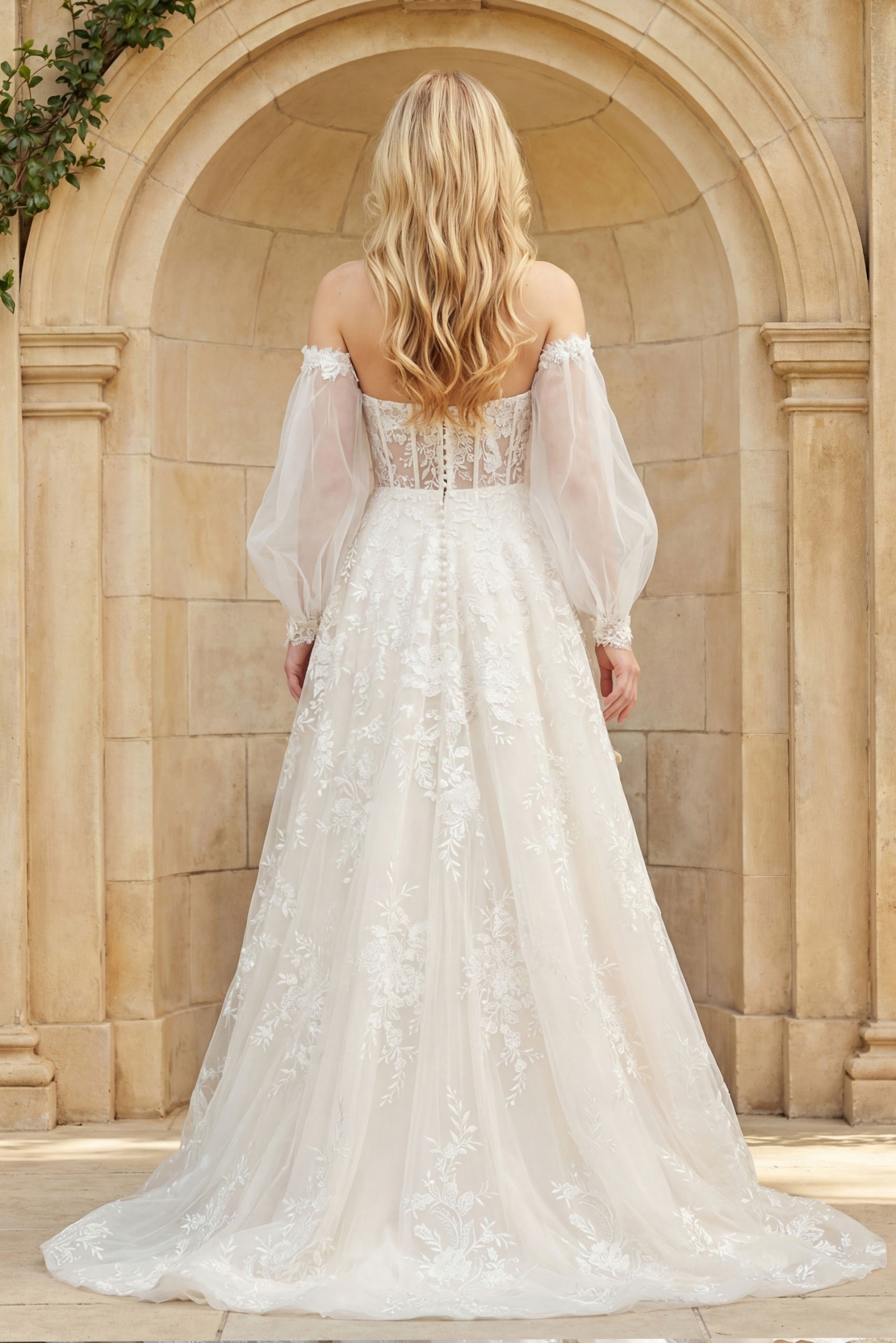 Ivory Corset Bodice Bridal Gown with Removable Sleeves JB220004 exudes timeless elegance and romantic charm. This stunning bridal gown features a delicate lace and tulle fabric that creates a dreamy and ethereal look. The corset silhouette enhances your natural curves while offering support and shaping. Its sweetheart neckline adds a touch of romance, perfectly paired with long puff sleeves that can be effortlessly removed for a versatile look. The floor-length, sweeping skirt is adorned with intricate lace detailing, making it perfect for a grand entrance. Whether you dream of a fairy-tale wedding or a graceful garden ceremony, this exquisite gown promises to make your special day unforgettable.