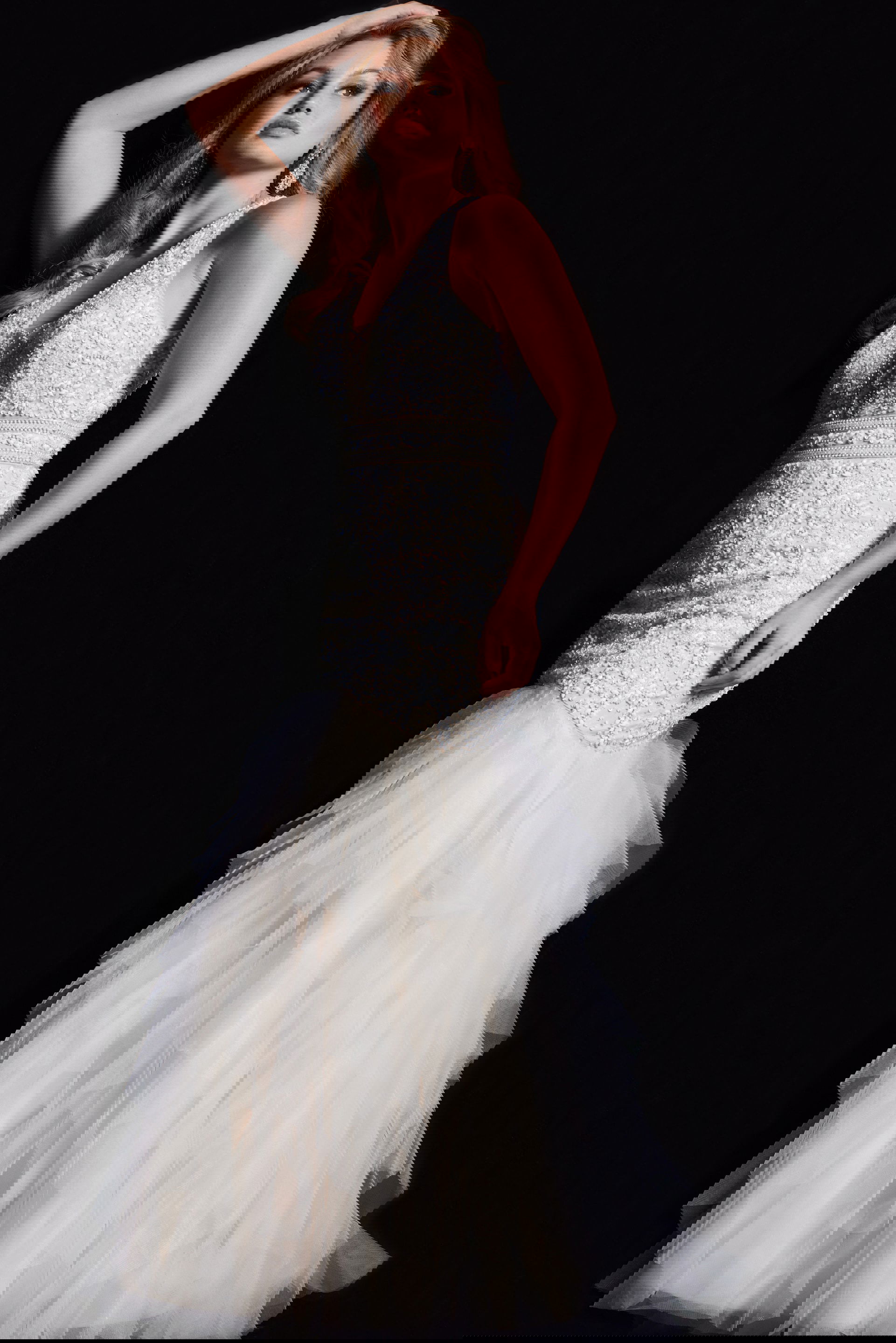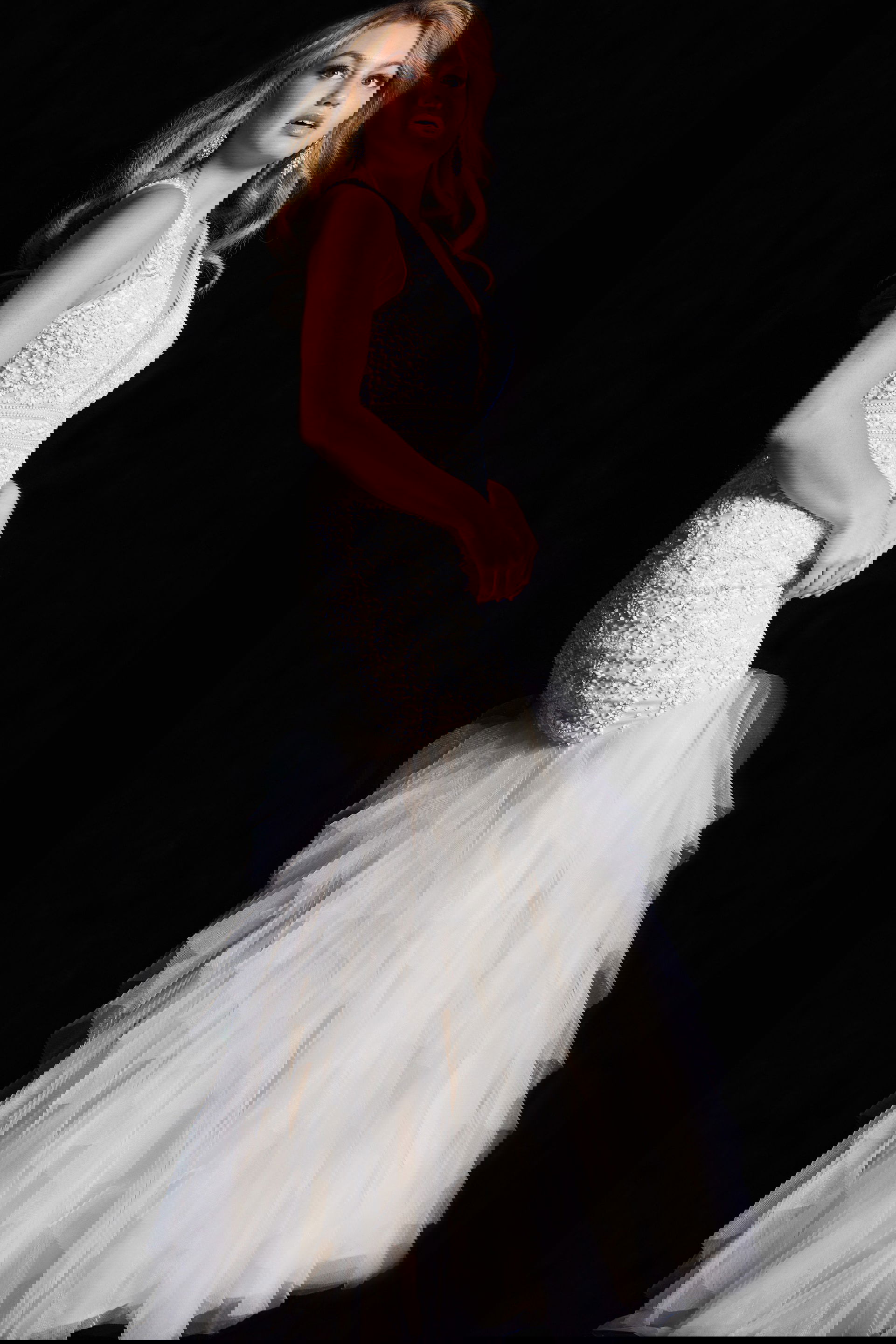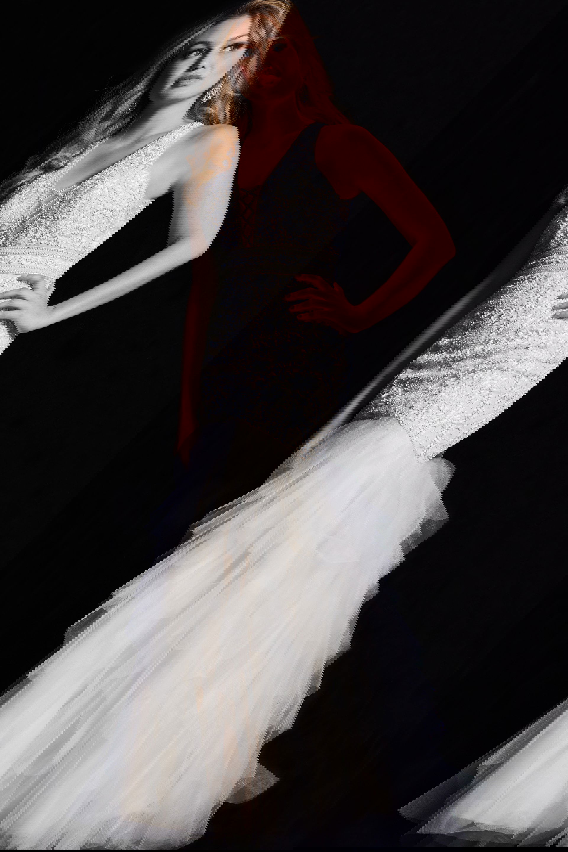 Crafted from delicate tulle, the gown features a flattering fit and flare silhouette that accentuates the curves with grace. The details are exquisite, with a beaded bodice that adds a hint of sparkle and allure. Fully lined for comfort, the gown boasts a flare tiered bottom that adds movement and drama to every step.