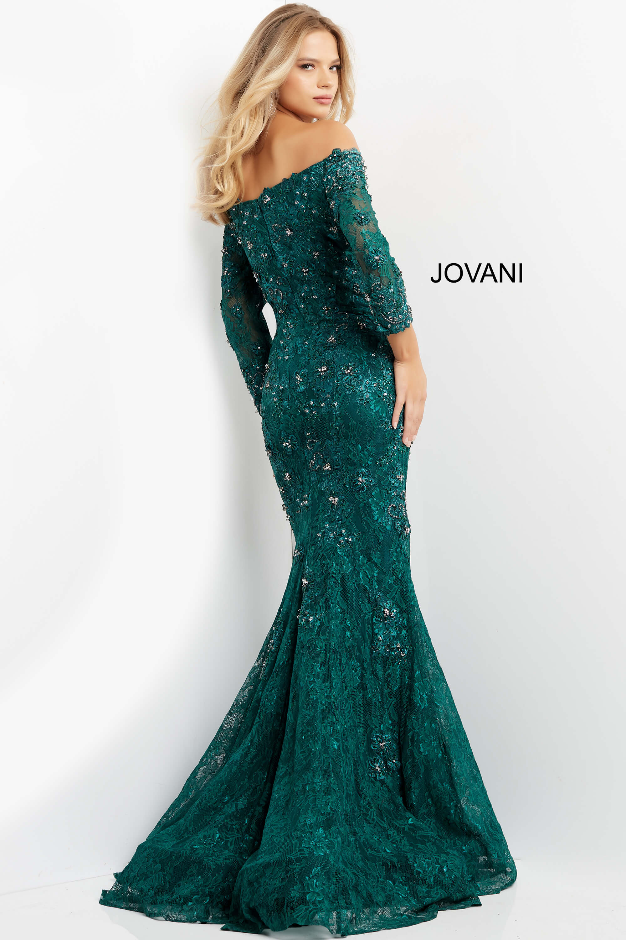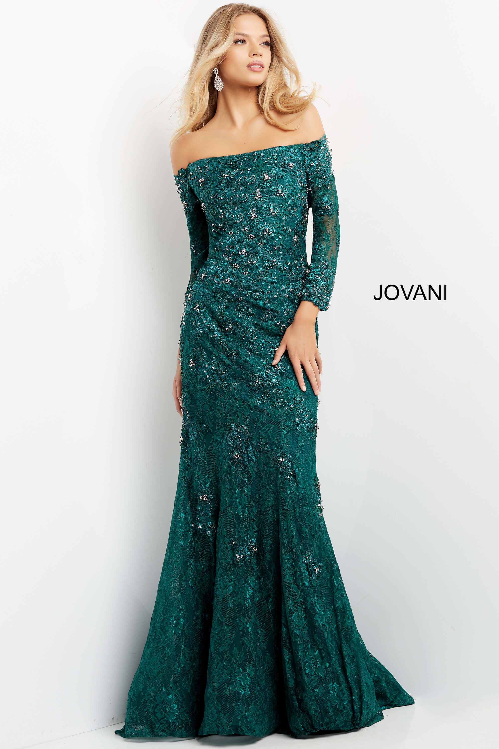 This striking mermaid silhouette gown features an off-the-shoulder neckline with intricate beaded details over a luxurious lace fabric. The fitted bodice and hips elegantly flare out at the knee, creating a dramatic and sophisticated look ideal for formal occasions. The gown is further enhanced by long sheer sleeves adding a touch of graceful allure.