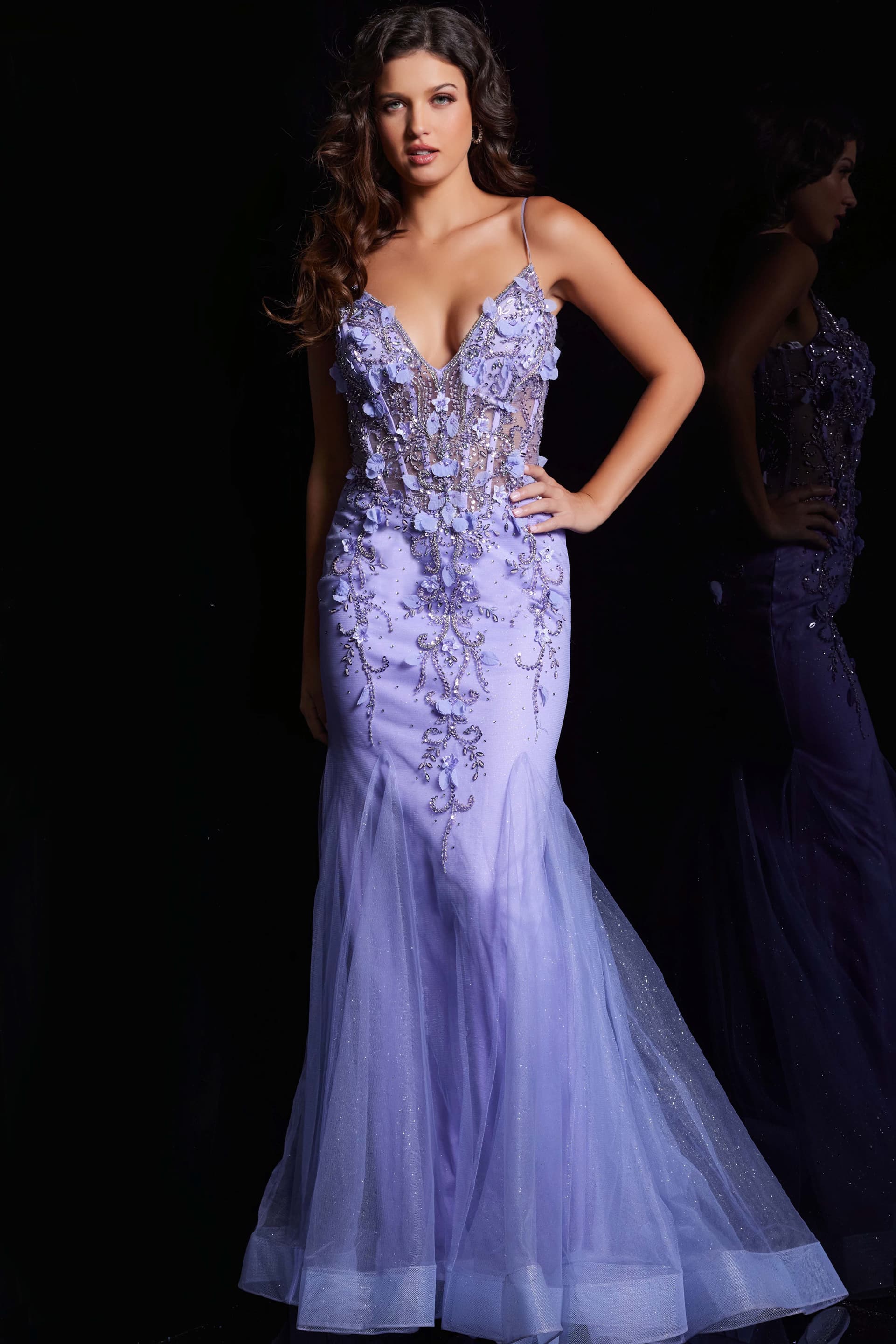 Mermaid floral embroidered long prom gown with v neckline and beading details on the bodice made with tulle fabric and v back.