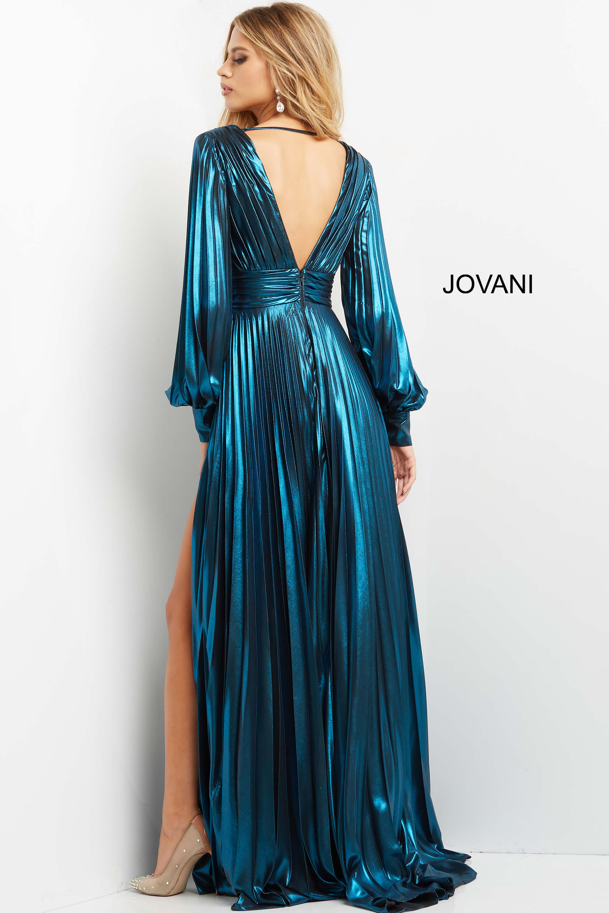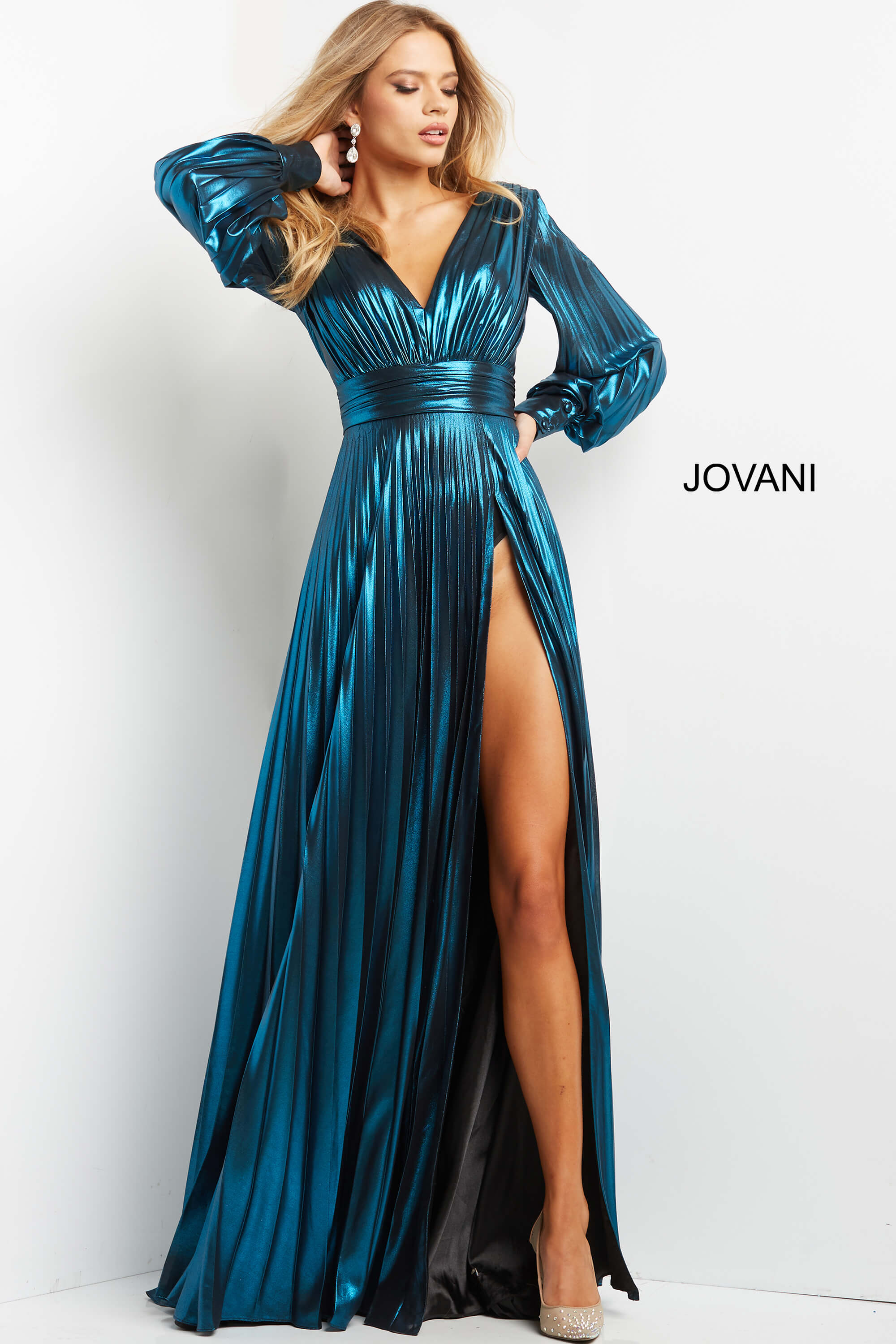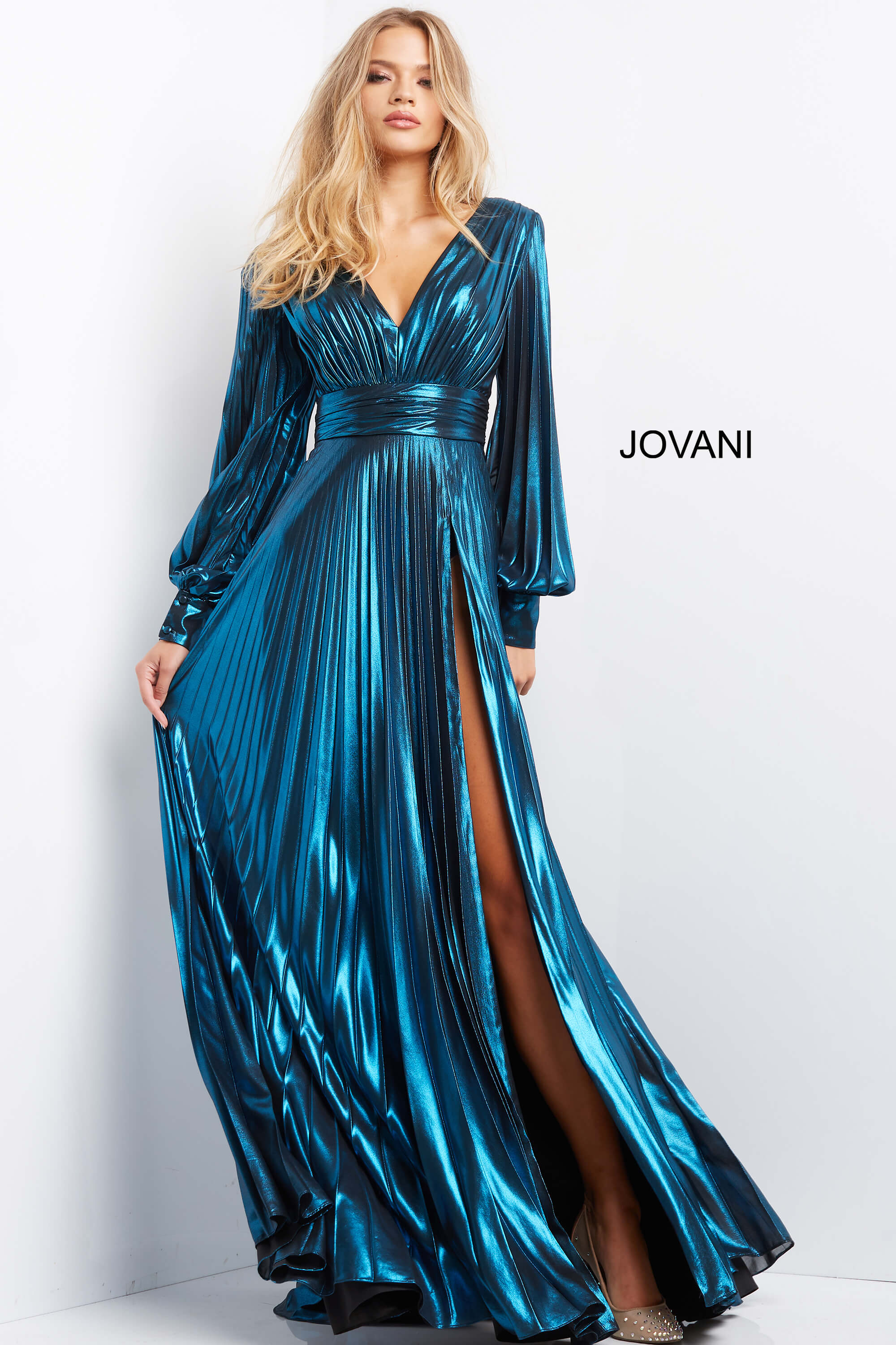This stunning teal gown features a luxurious metallic fabric that shines beautifully. With a long sleeve design, deep V-neckline, and high slit, this floor-length gown ensures an elegant and striking silhouette. The pleated detailing adds texture and sophistication. A perfect choice for formal events and special occasions.