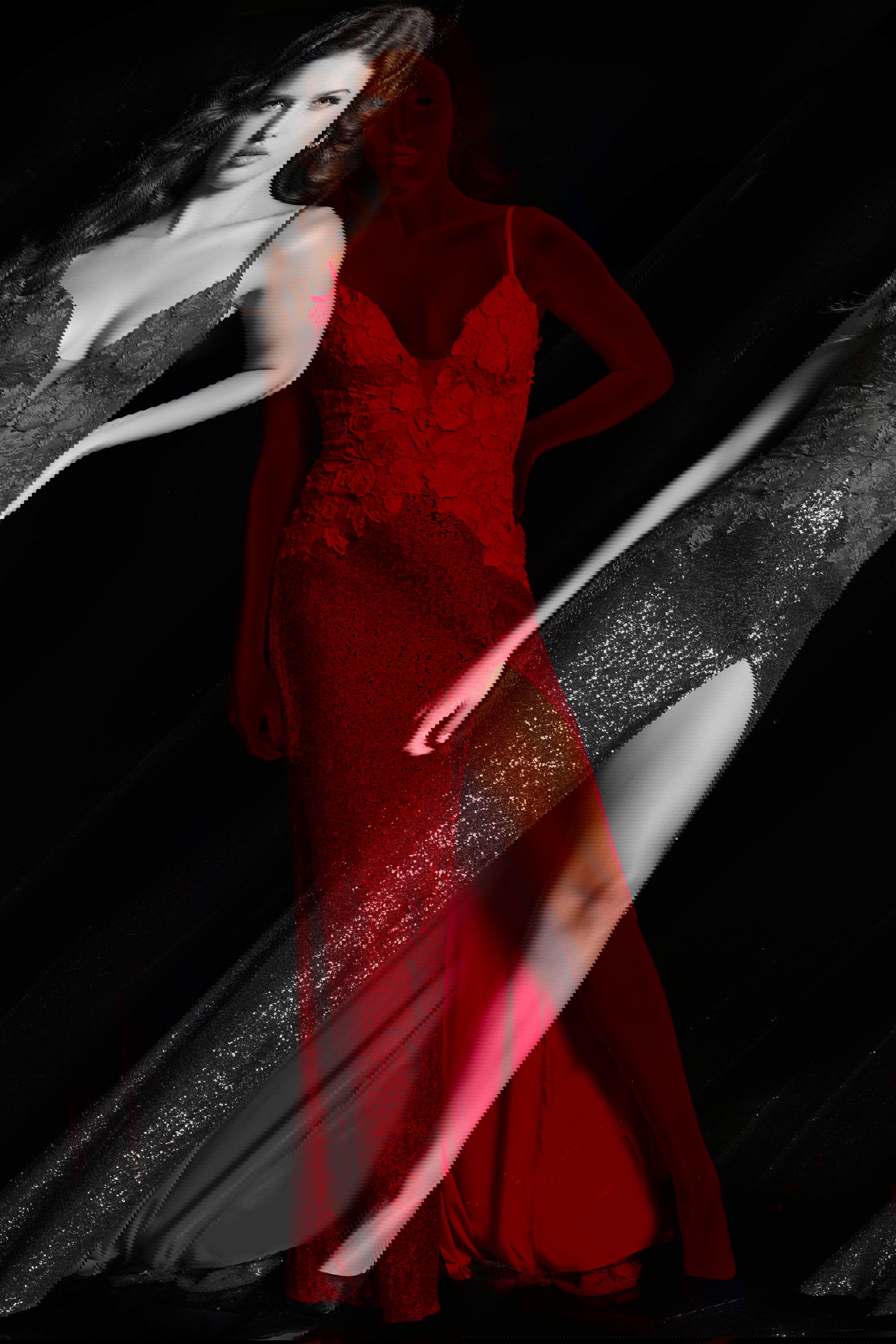 Jovani 06426 is a stunning piece combining classic elegance and modern flair. This light blue floral bodice dress is perfect for anyone who wants to make a statement on their big night. The dress features a form-fitting silhouette that flatters the body and accentuates curves. The sequin stretch fabric adds a touch of sparkle, ensuring you’ll shine on the dance floor. The floor-length skirt has a high slit and train, allowing for ease of movement while adding a touch of drama. The illusion bodice with floral appliques gives a romantic touch to the dress, making it perfect for a prom or any formal event.