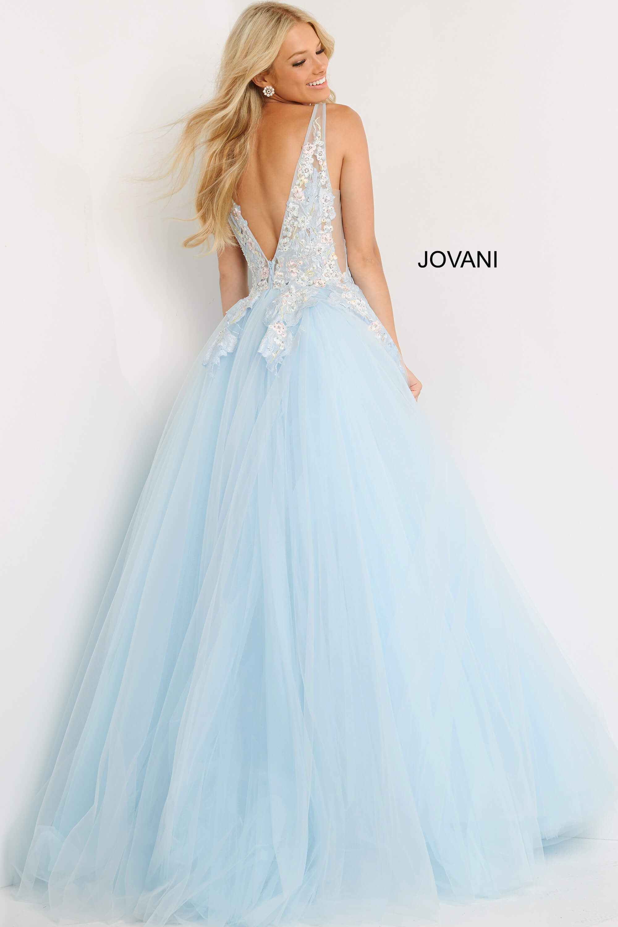 Jovani 06808 Light Blue Deep V Neck Floral Prom Ballgown