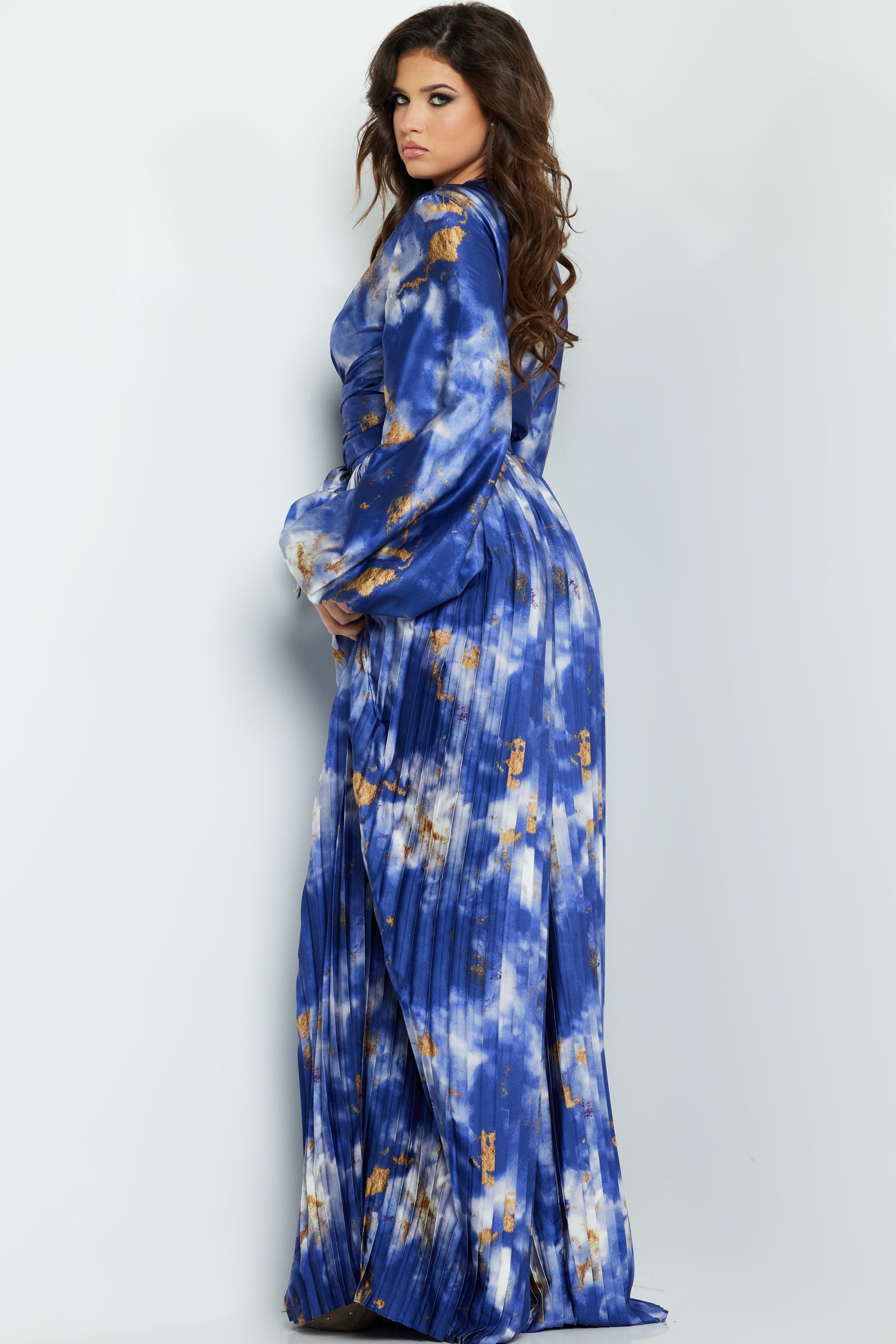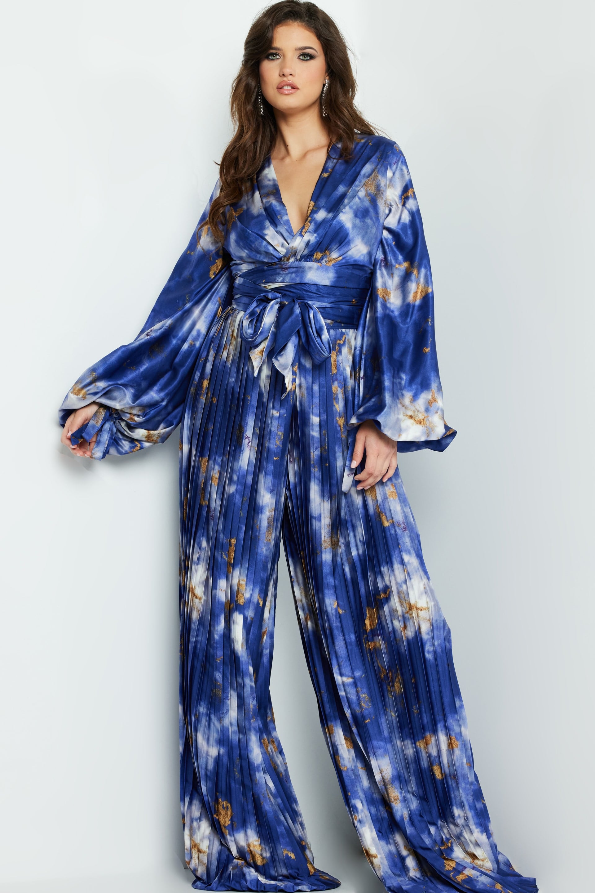 Jovani 06849 and 06850 Multi Print Two Piece Set. This stunning ensemble features a striking multi-print fabric that commands attention. Crafted with luxurious pleated chiffon, this long-length set includes a wrap-style top with a deep V-neckline and voluminous long sleeves that add an extra touch of glamour. The high-waisted, wide-leg pants are also pleated, creating a flowing, elegant silhouette perfect for making a statement at any special occasion. The intricate detailing and vibrant design make this two-piece set an eye-catching choice for fashion-forward individuals.