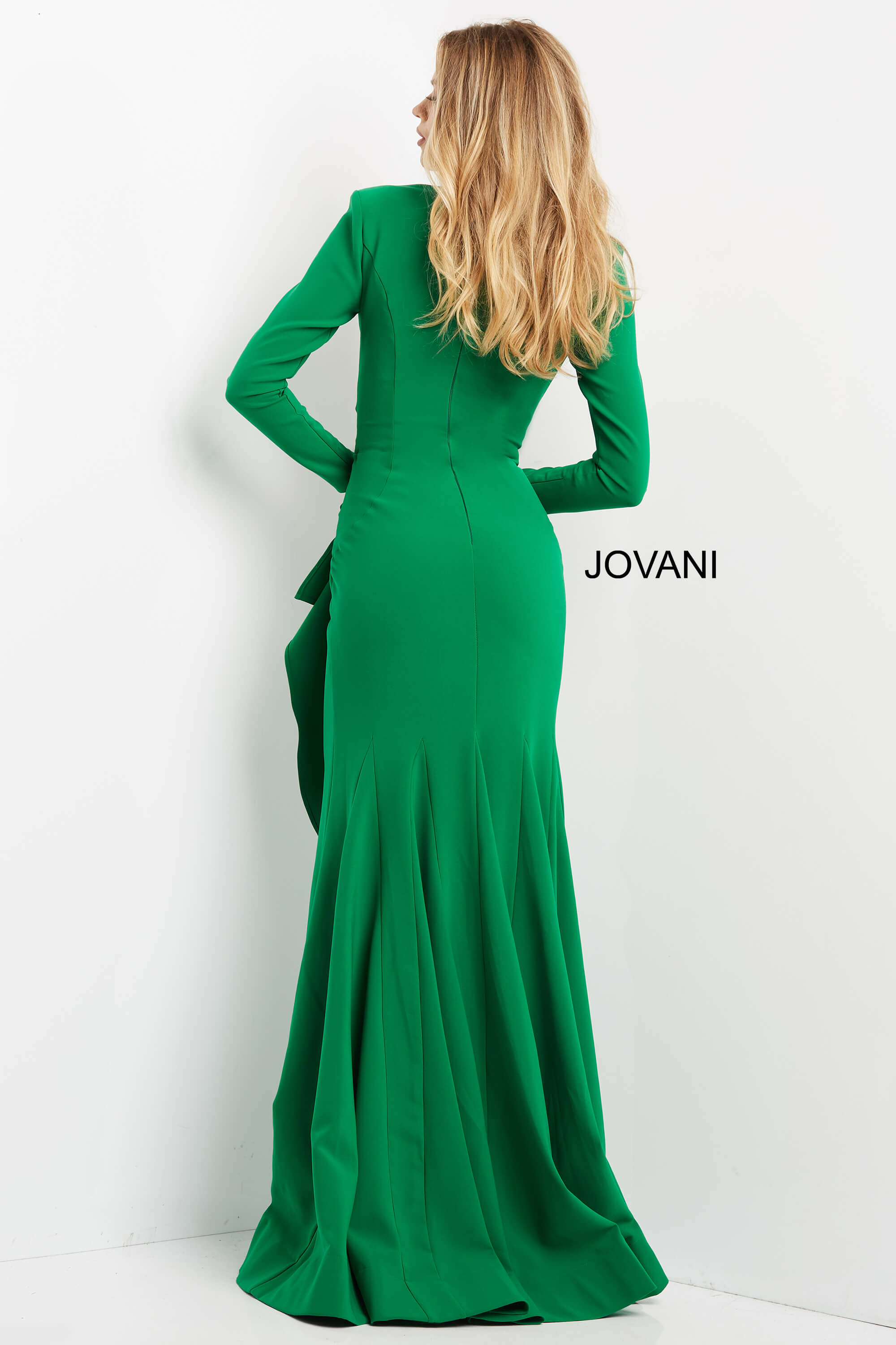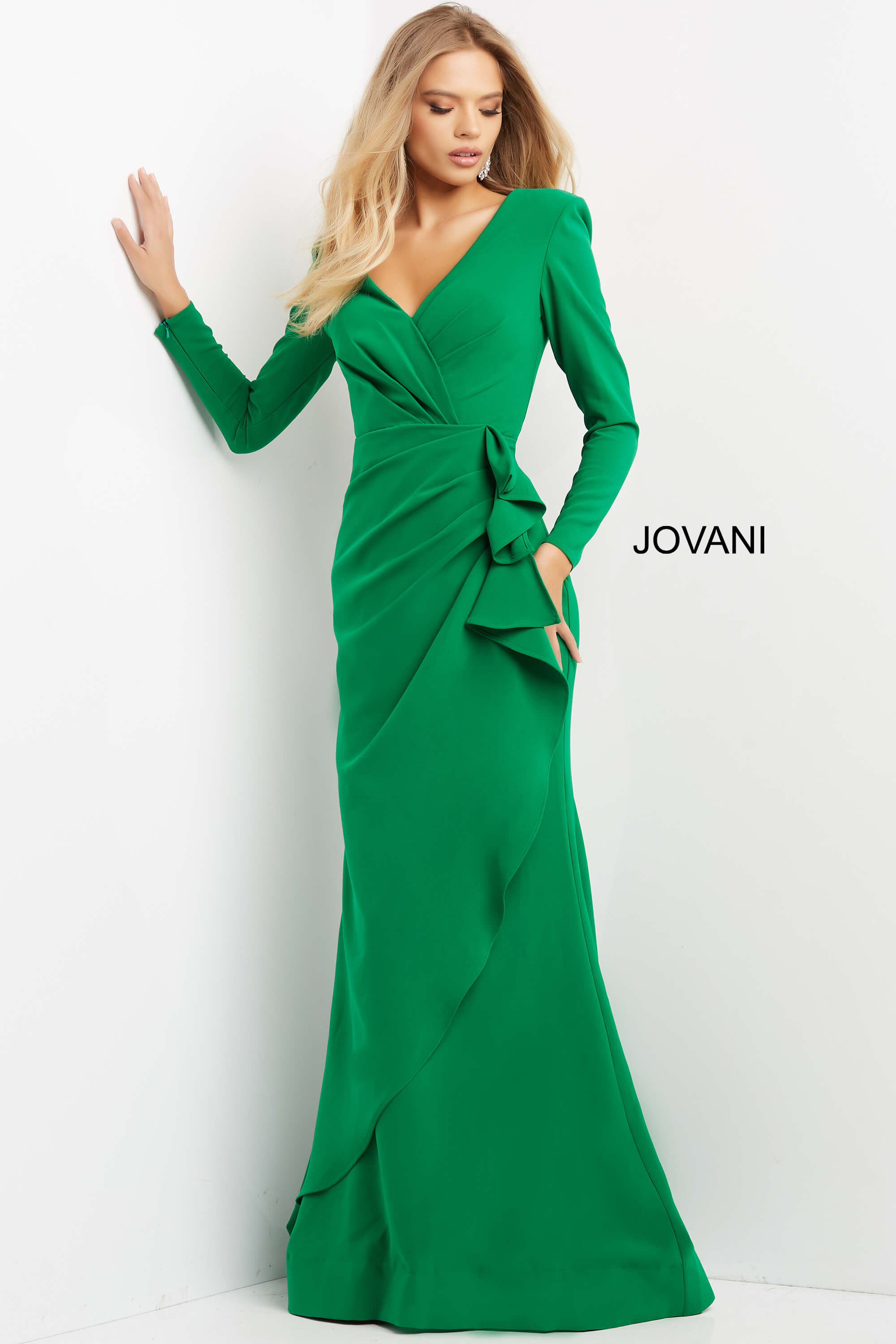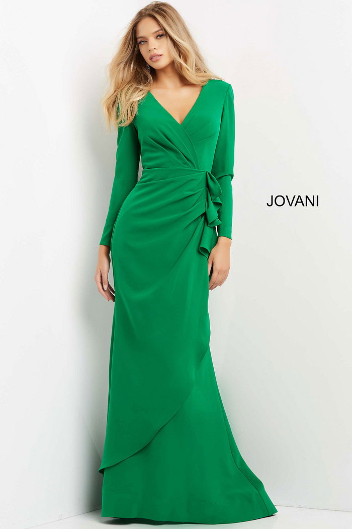 The Formal Dresses, Mother of the Bride gown from the collection is a timeless and elegant choice for special occasions. Crafted from crepe, the gown features a smooth and luxurious fabric, providing a sleek and polished appearance. The column and fitted silhouette create a flattering and timeless look, emphasizing the natural curves with grace. The gown’s design is plain, with draped and ruched details, adding subtle texture and dimension to the overall simplicity. With a long dress length, the gown exudes formality and sophistication, making it suitable for a variety of formal events. The back zipper ensures a seamless and polished closure. The V-neckline adds a touch of femininity and elegance to the gown’s design. Long sleeves contribute to the gown’s overall sophistication and provide additional coverage. Available in a range of classic colors, including Black, Emerald, Hunter, Ivory, Light Blue, Navy, and Plum, the gown offers versatile options for personal style preferences. Jovani 06995 is designed to make a lasting impression, combining a timeless silhouette with subtle details for a truly remarkable appearance.