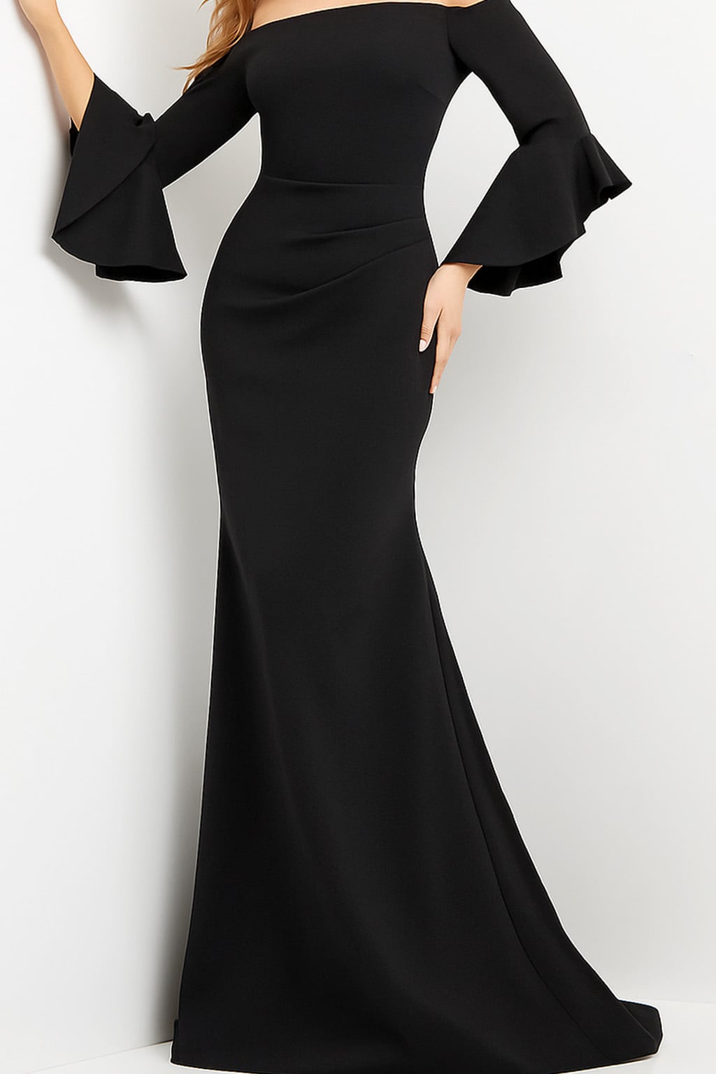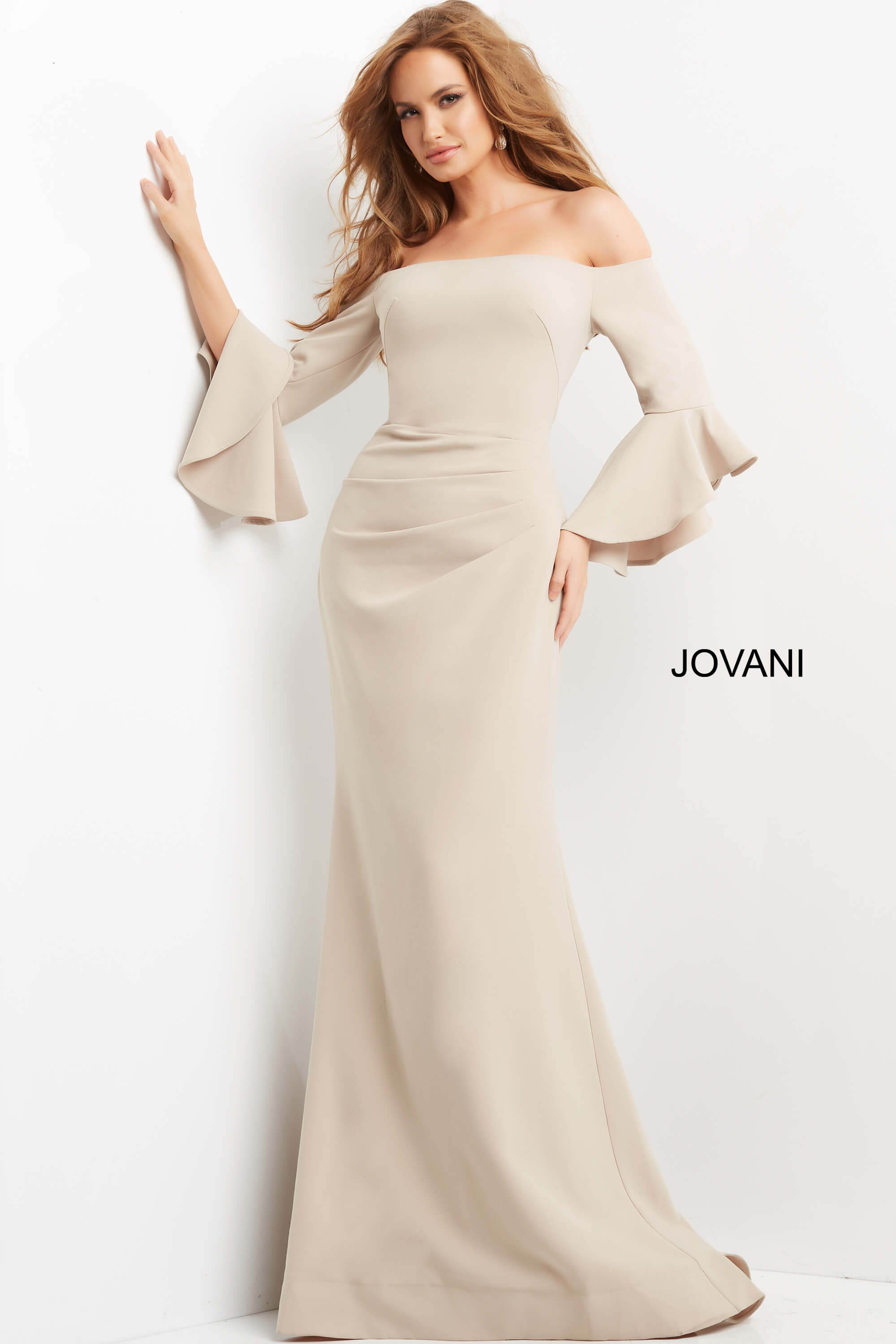 Jovani 07065 Cream Off the Shoulder Bell Sleeve Dress is a stunning floor-length gown crafted from luxurious crepe fabric. This exquisite sheath silhouette dress features an elegant off-the-shoulder neckline, complemented by dramatic long bell sleeves. Perfect for any formal occasion, the chic and sophisticated design ensures you make a memorable entrance. The closed back style adds a touch of classic refinement to this contemporary piece.