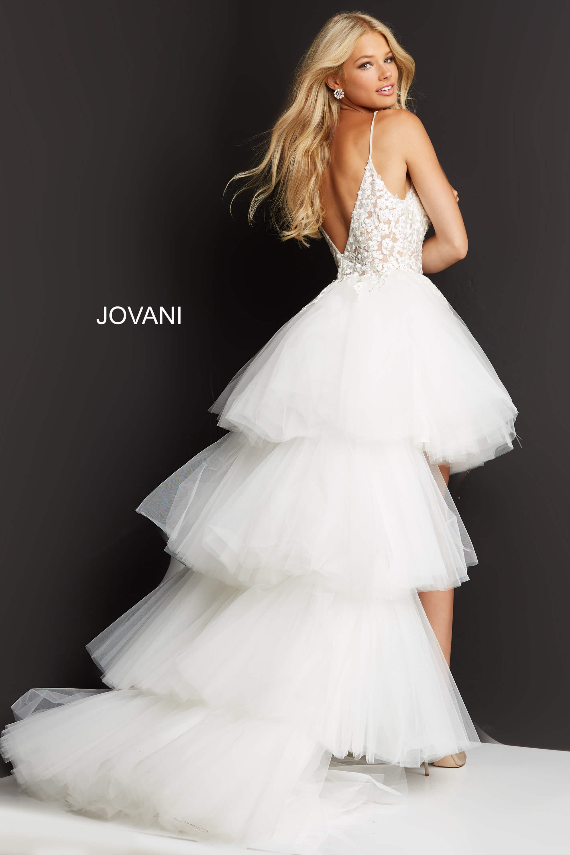 Introducing the Jovani 07263 Off White Embroidered High Low Formal Dress, an enchanting masterpiece that embodies elegance and sophistication. This exquisite dress features a beaded bodice adorned with intricate embroidery, gracefully enhancing the ethereal quality of the sheer fabric. Designed in a fit and flare silhouette, this formal dress boasts a stunning tiered high low skirt crafted from delicate tulle, providing a whimsical touch to your ensemble. The V-neckline and sleeveless design further elevate its timeless allure, while the open back style adds a hint of modern glamor. Perfect for any special occasion, the Jovani 07263 dress guarantees you’ll stand out with its captivating presence and unmatched charm.