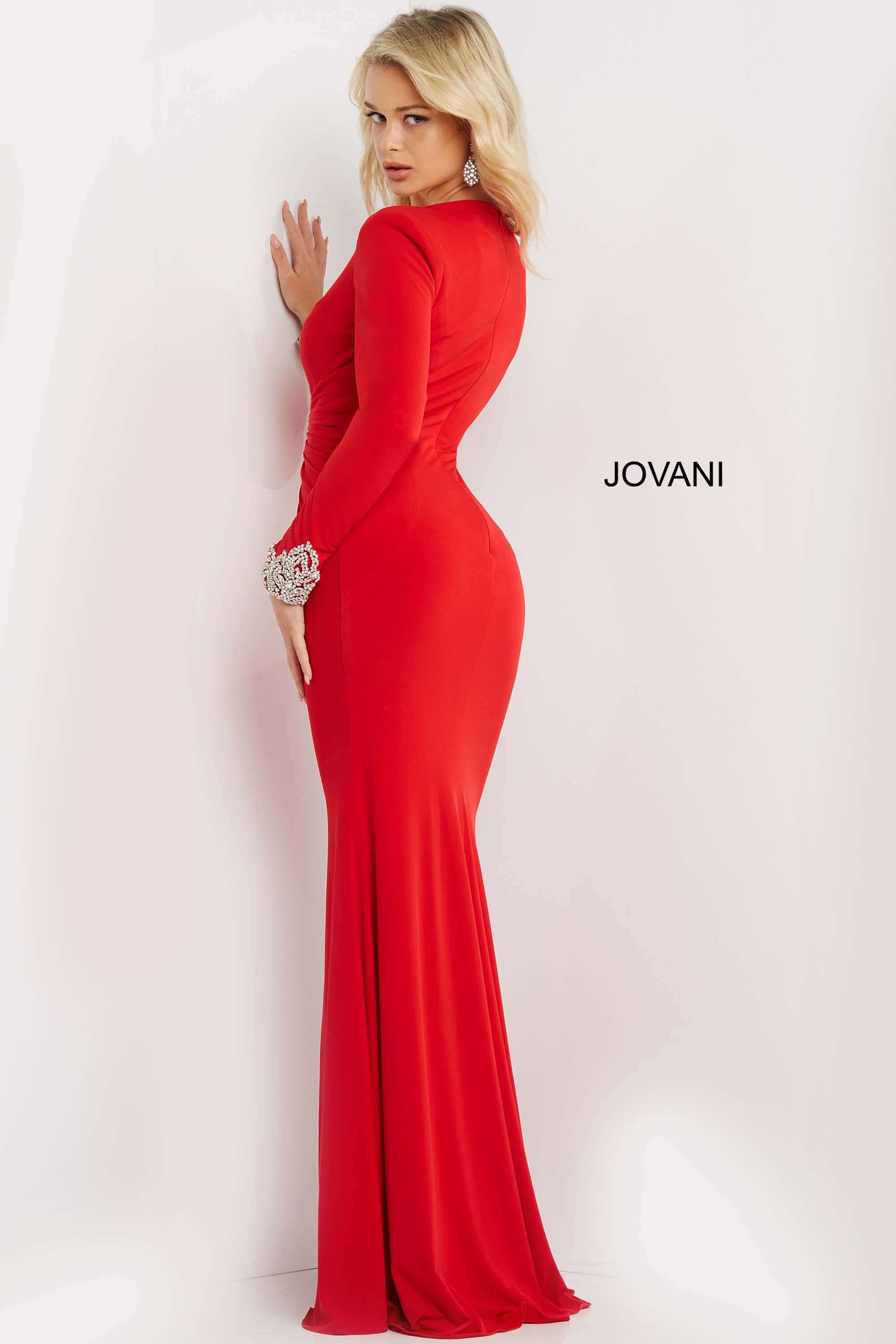 Jovani 07320 Red Plunging Neck Long Sleeve Dress. This exquisite gown is crafted from luxurious jersey fabric, ensuring a smooth and flattering fit. The dress features a daring V-neckline paired with elegant long sleeves adorned with intricate beaded detailing at the cuffs. Its floor-length sheath silhouette is designed to hug your curves and accentuate your feminine grace. A sophisticated high slit adds a touch of allure and showcases your legs with every step. Perfect for any elegant evening or special occasion, this dress promises to make a lasting impression with its vibrant red hue and timeless design.