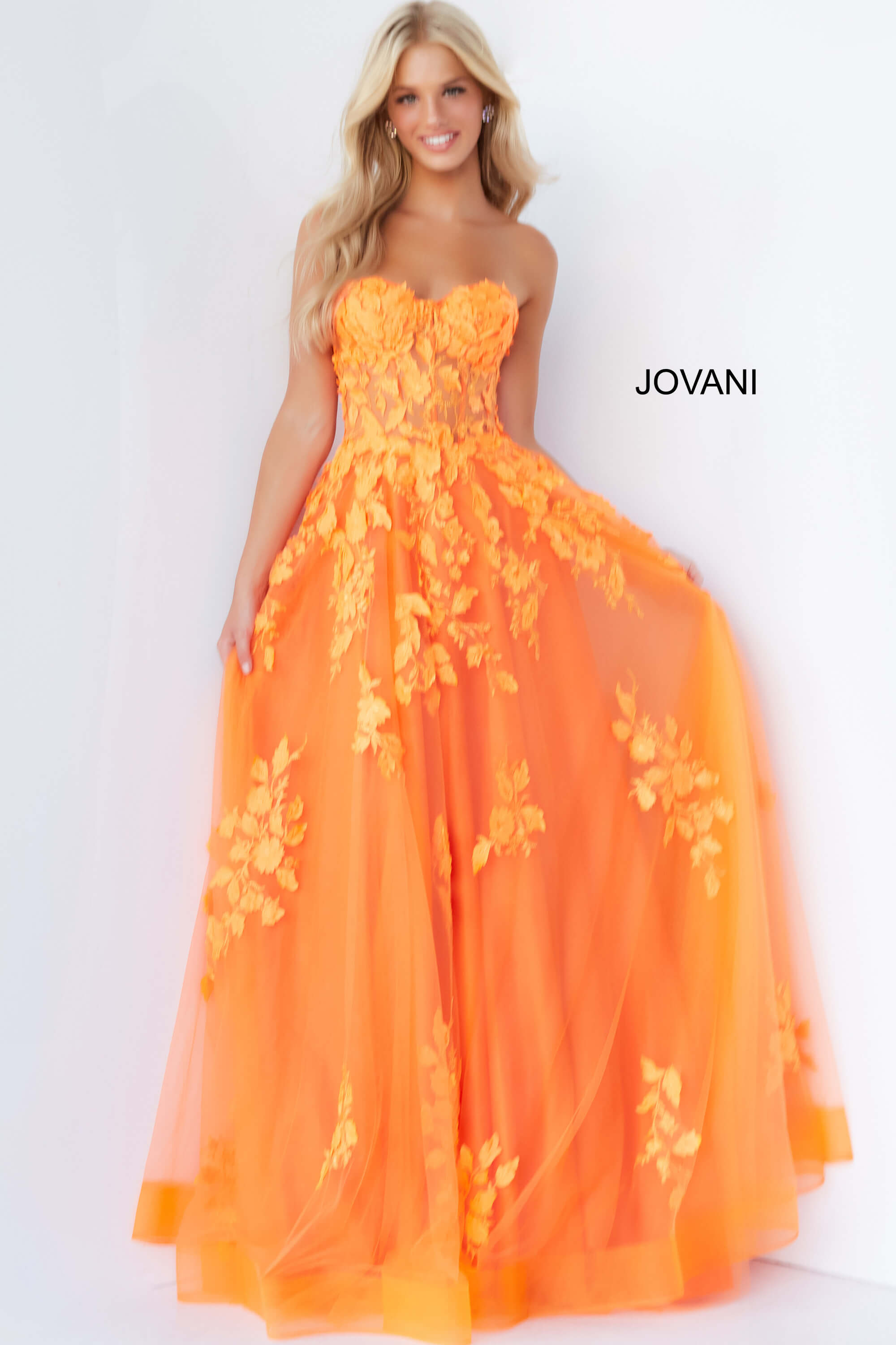 This stunning strapless A-line gown features a sheer lace bodice adorned with intricate rosettes. The fitted bodice flares into a flowing tulle and organza floor-length skirt, creating an ethereal and elegant silhouette. Perfect for formal events or special occasions, this dress exudes romance and sophistication.