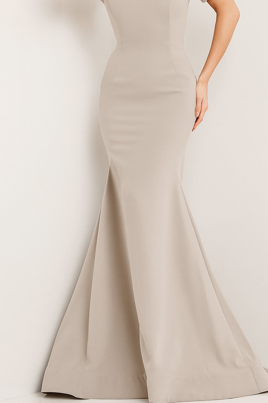 Jovani 08361 Taupe Off the Shoulder Straight Neck Gown. This enchanting gown features a luxurious satin fabric that exudes elegance and sophistication. The silhouette is a timeless mermaid style that trails beautifully along the floor, creating a dramatic and stunning effect. The off-the-shoulder design paired with uniquely stylish puff sleeves adds a contemporary twist to this classic piece. Perfect for making a grand entrance at any formal event, this gown ensures you stand out with its combination of elegant simplicity and modern touches.
