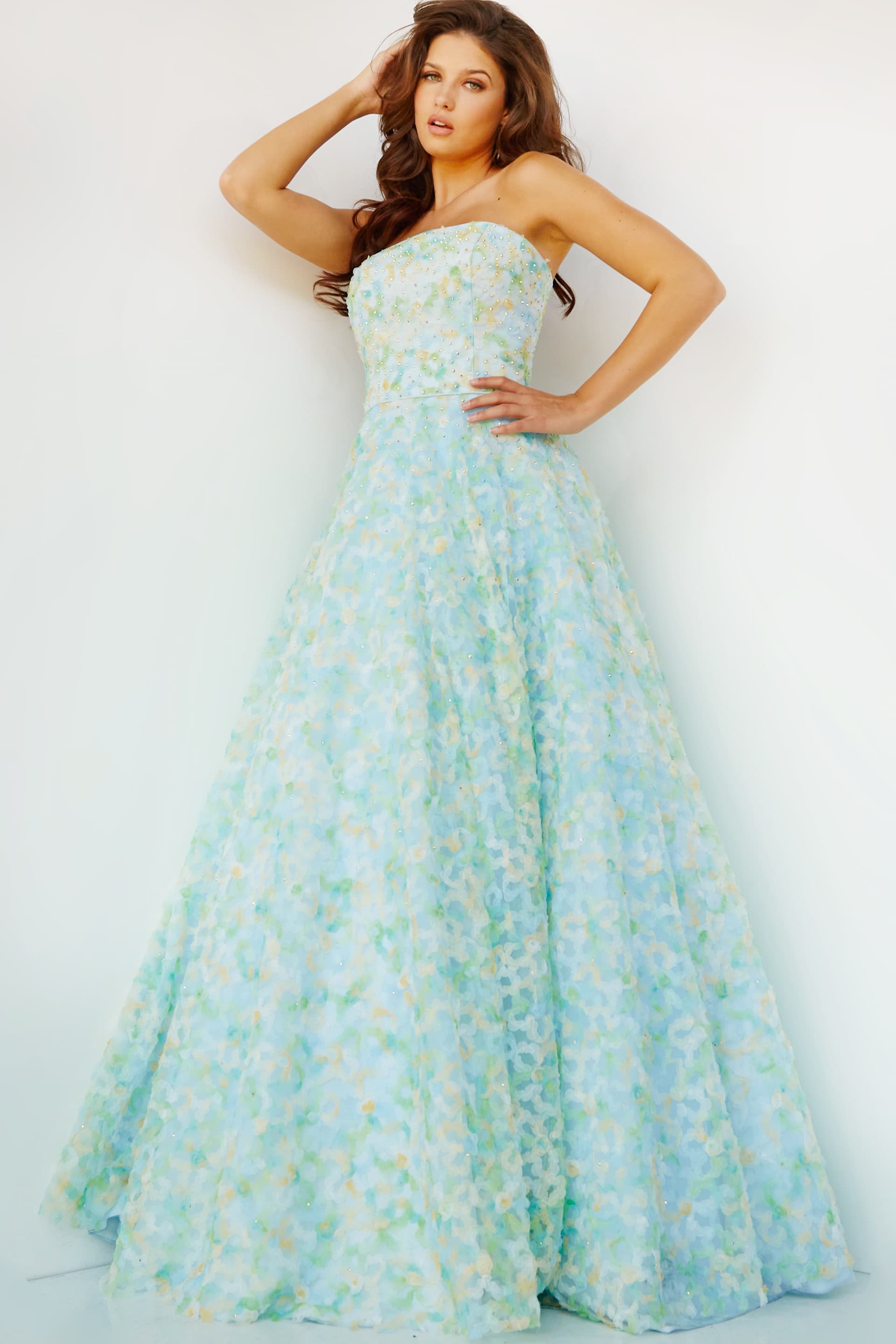 This exquisite strapless A-line gown is designed to make you feel like a princess. The floor-length dress is adorned with a beaded bodice that adds a touch of sparkle to your look. Made from high-quality chiffon fabric, it features a print design that is both unique and elegant. The dress is available in a beautiful light blue multi-color pattern. Ideal for prom, weddings, or any formal event, this gown combines comfort and style effortlessly.