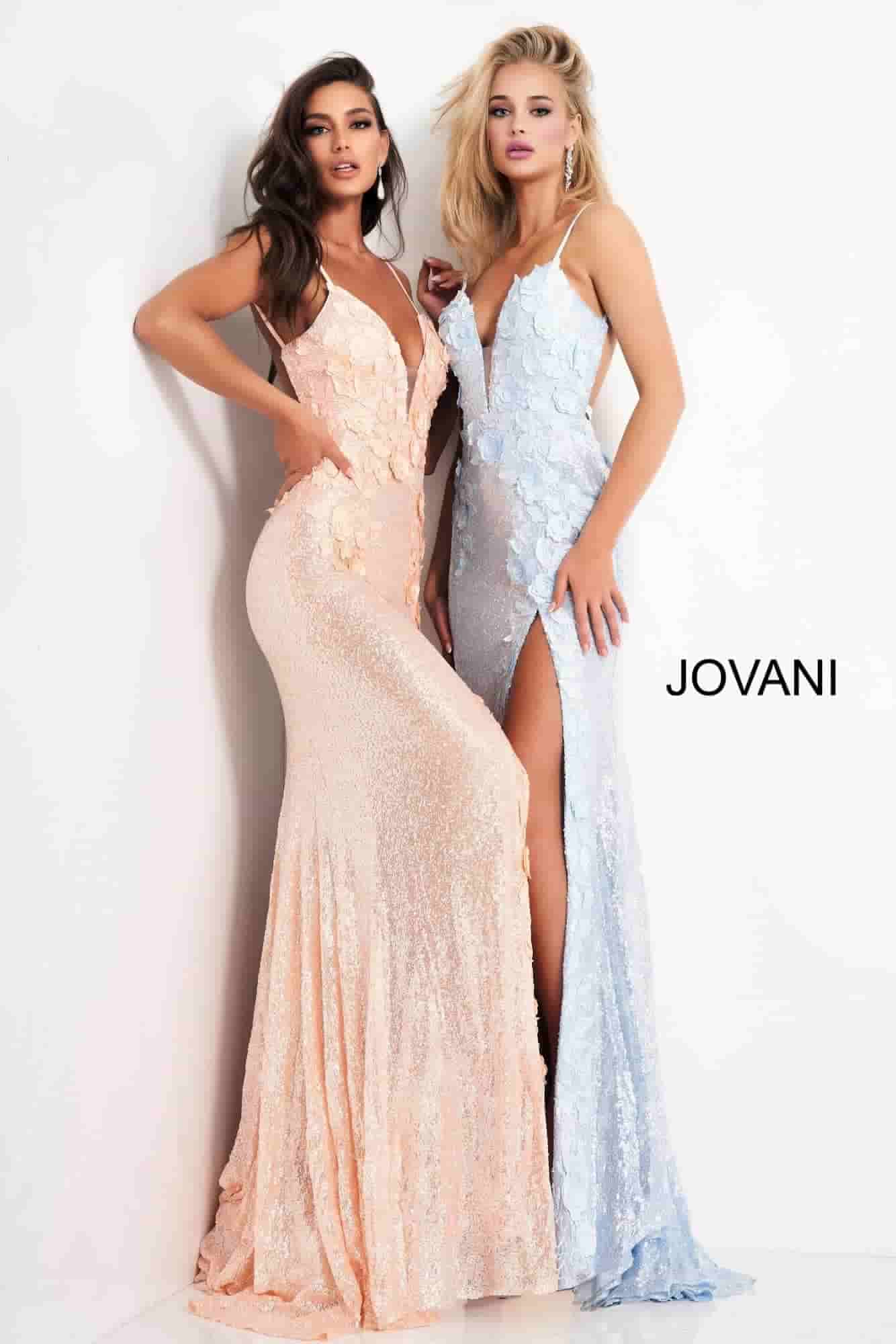 Dazzle at any event in this stunning spaghetti strap sequin gown, designed with intricate rosette appliques. The dress features a v-neckline, high slit, and mermaid silhouette that accentuates your curves. Available in multiple colors such as rose gold, orange, light blue, green, ivory, turquoise, and black, this gown is perfect for any formal or evening occasion. The open back adds a touch of allure, while the full-length design ensures elegance.