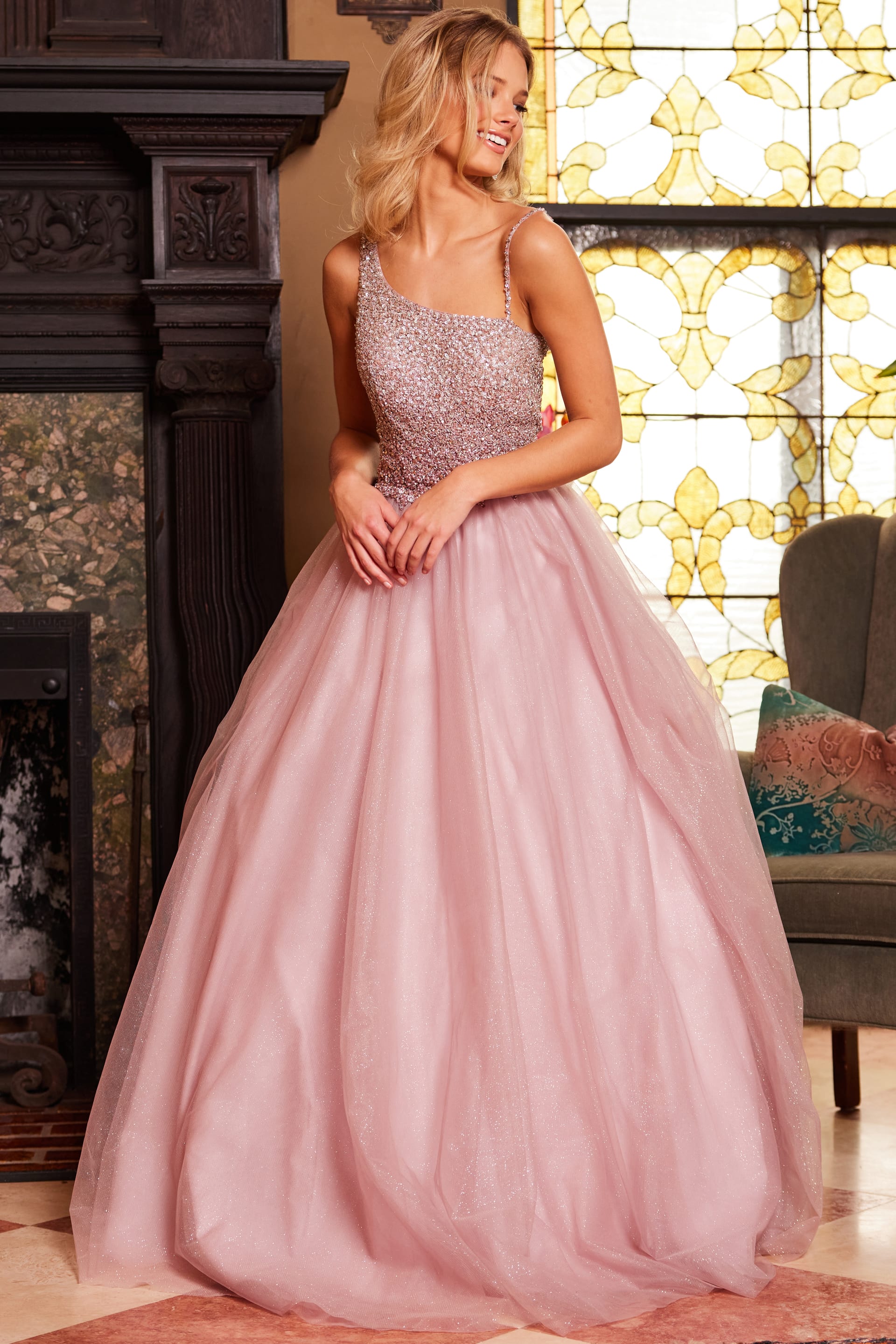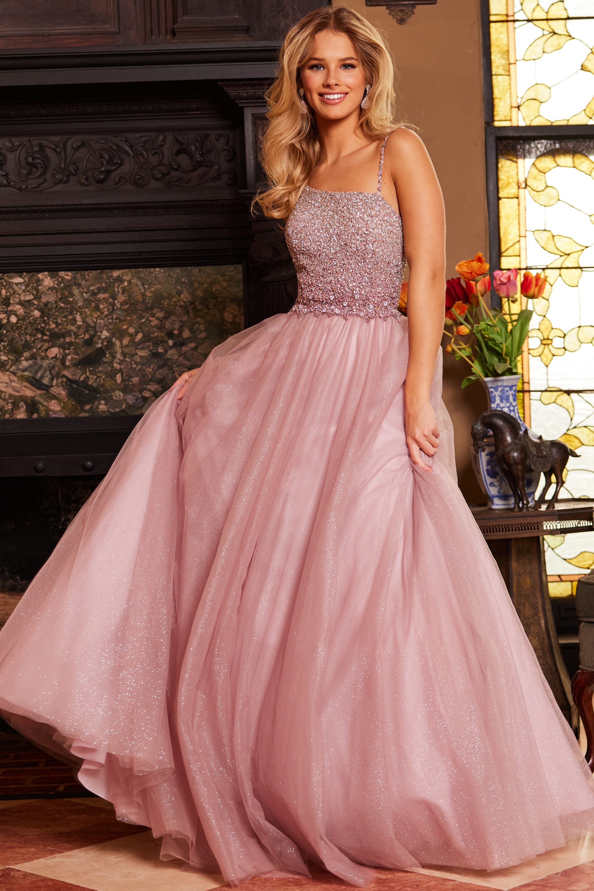 Jovani 24051 Ice Pink Embellished Bodice Ballgown is a stunning masterpiece featuring an opulent beaded bodice paired with a voluminous tulle floor-length skirt. The ballgown silhouette accentuates the waist before cascading elegantly to the floor, ensuring that you make a dramatic entrance at any event. The gown’s sleeveless design, along with a classic closed back style, adds an air of sophistication. Perfect for prom, pageants, or any formal occasion, this Jovani dress combines timeless elegance with modern glamour.