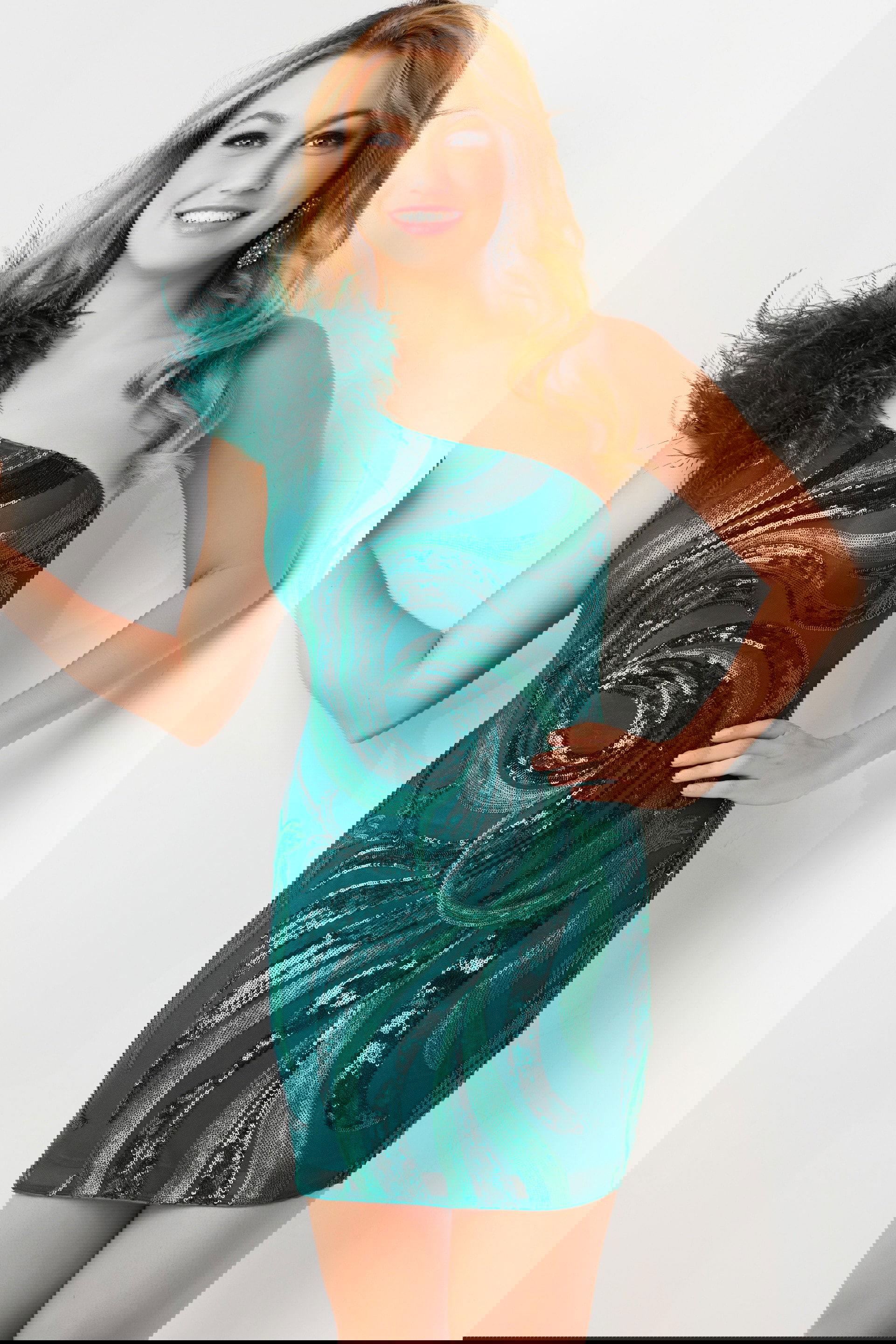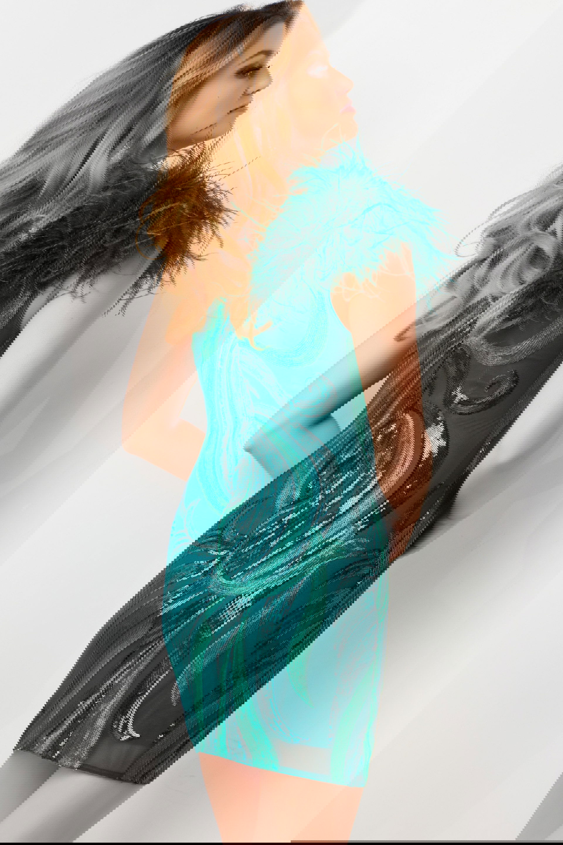 3. Fabric and Fit: This dress is made from stretch mesh fabric and is designed to fit your curves and flatter your figure. The fitted style accentuates your shape while allowing you to move and dance comfortably. The sequin embellishments and feather shoulder detail adds texture and visual interest to the dress.