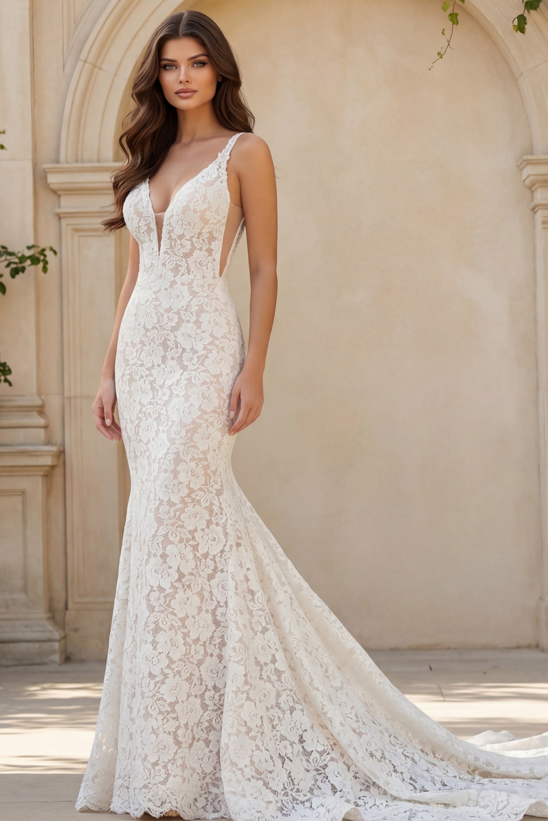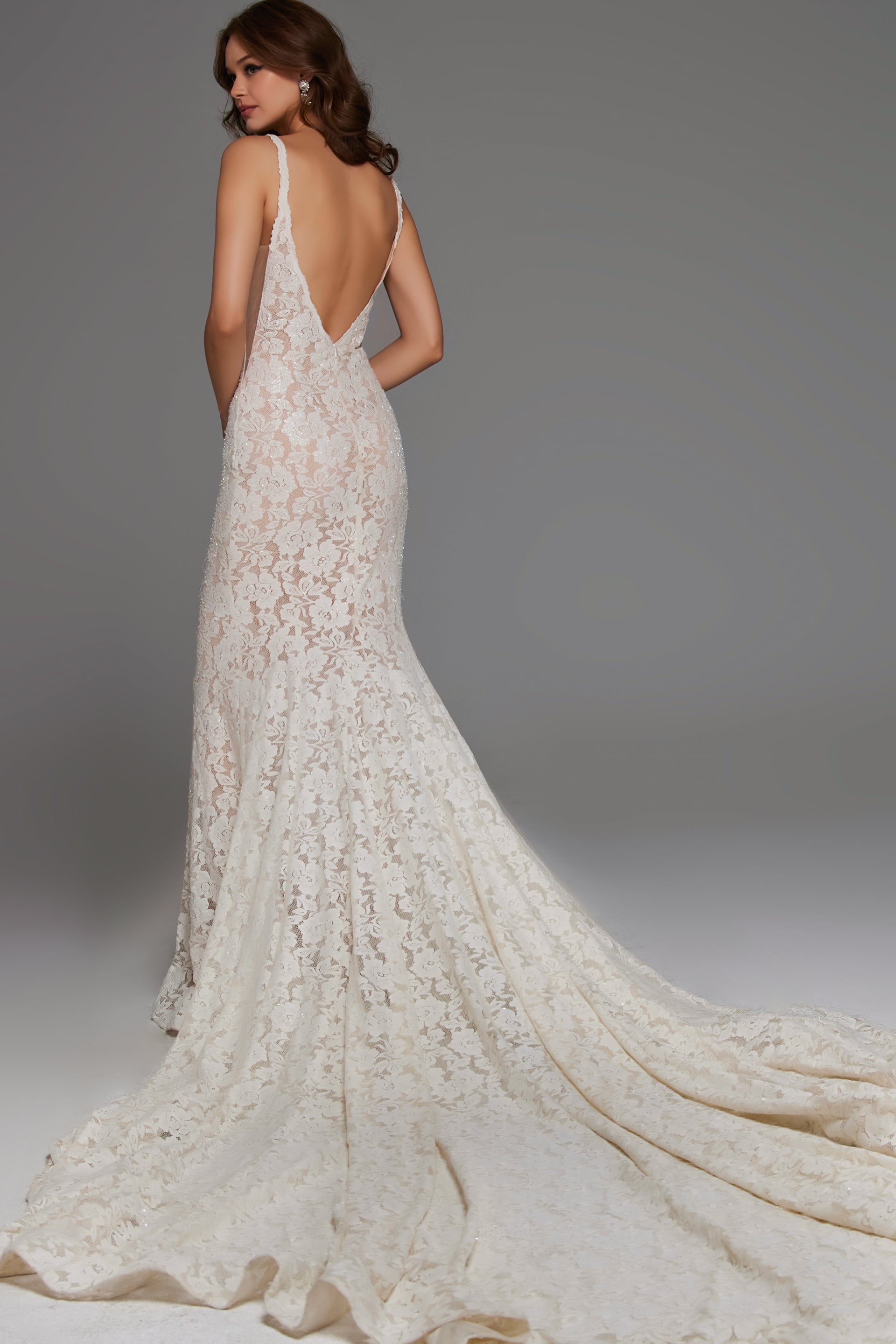 Jovani JB03864 Ivory Lace Wedding Dress. This exquisite wedding gown features a stunning mermaid silhouette that hugs your curves through the bodice and hips before gracefully flaring at the knees. The dress is made from luxurious ivory lace fabric, adding a touch of romantic elegance. The deep V-neckline is both alluring and sophisticated, paired with sleeveless straps that enhance the dress’s elegant charm. Its beautiful floor-length design makes it perfect for making a memorable entrance on your special day. The daring open back adds a modern twist to the timeless lace design, making this dress an unforgettable choice for any bride-to-be.