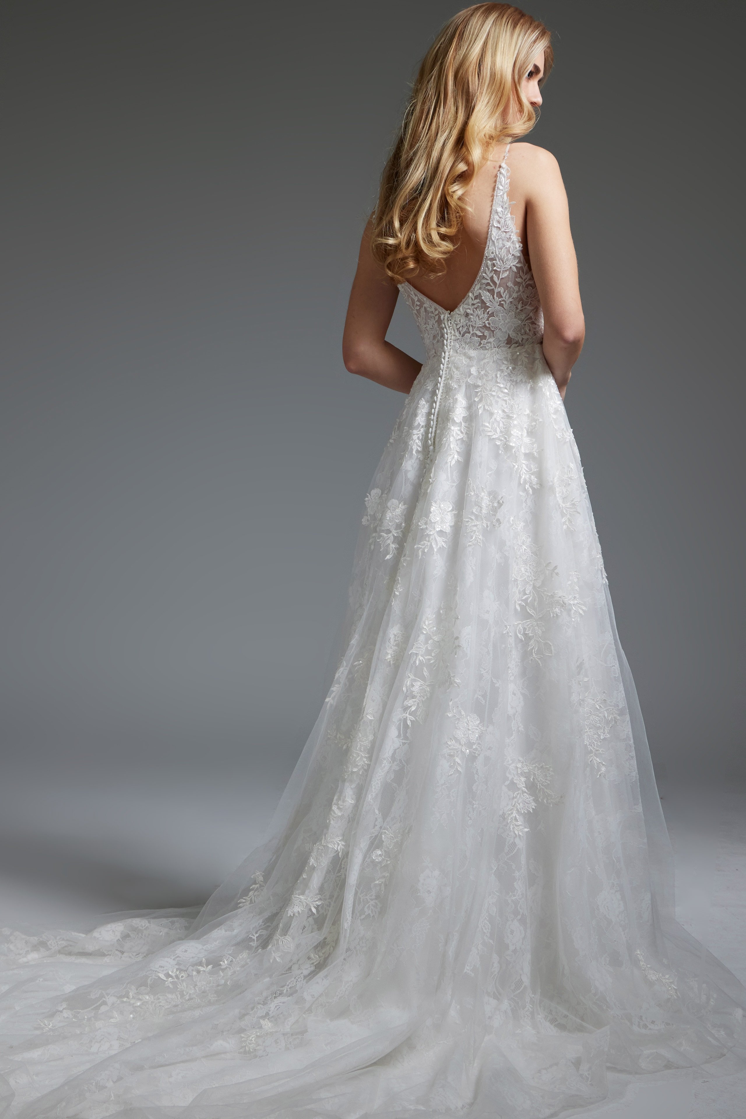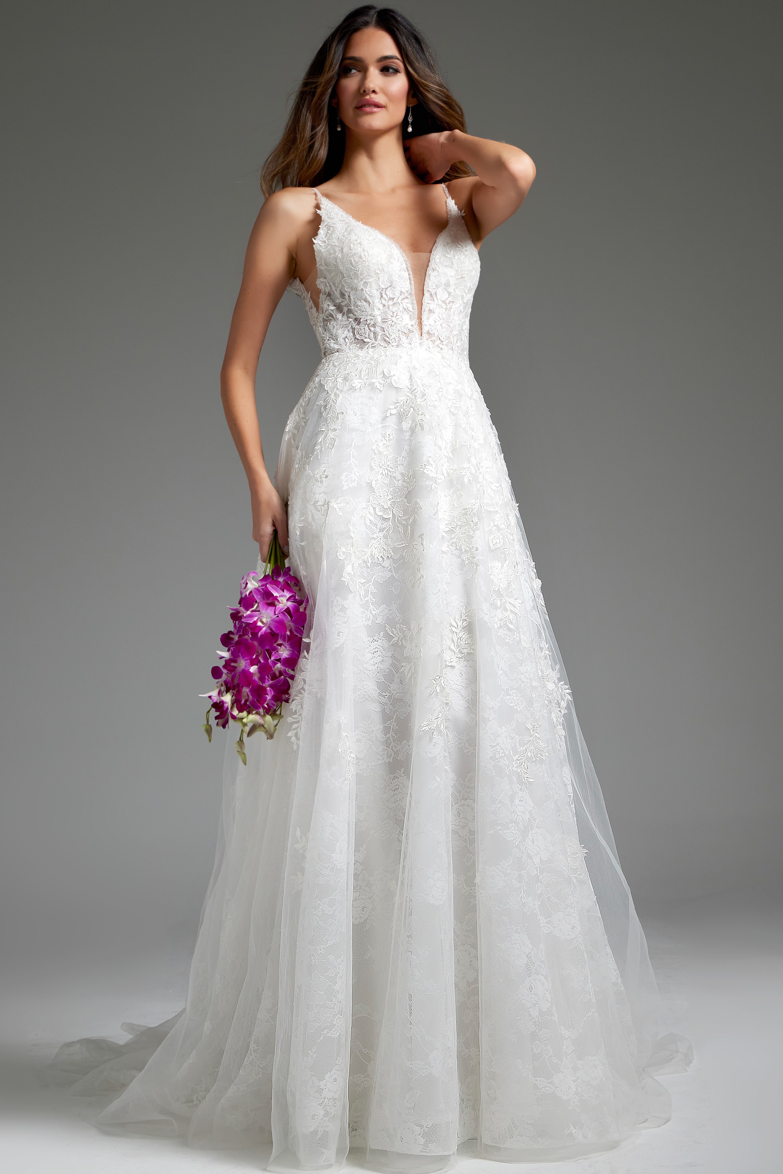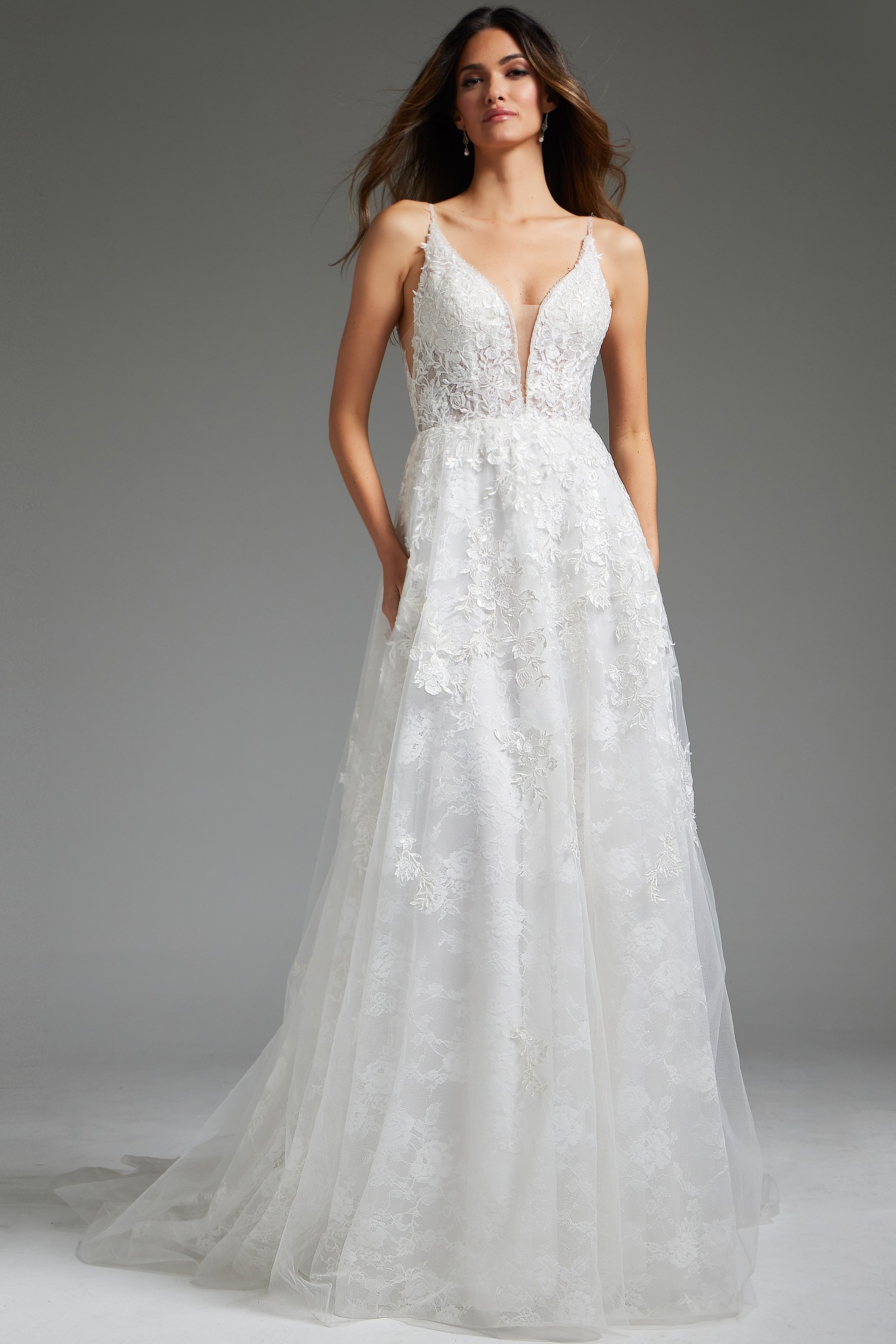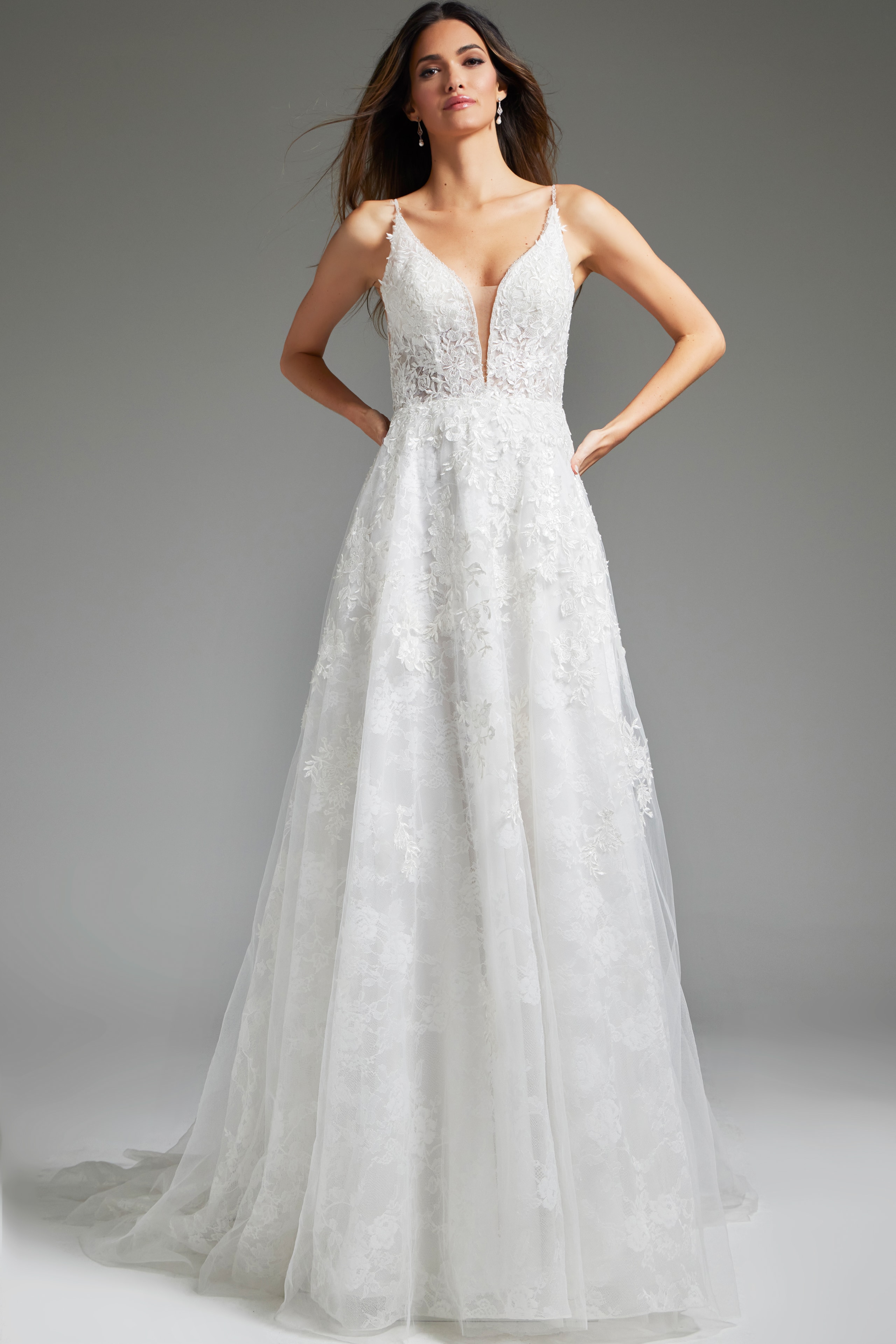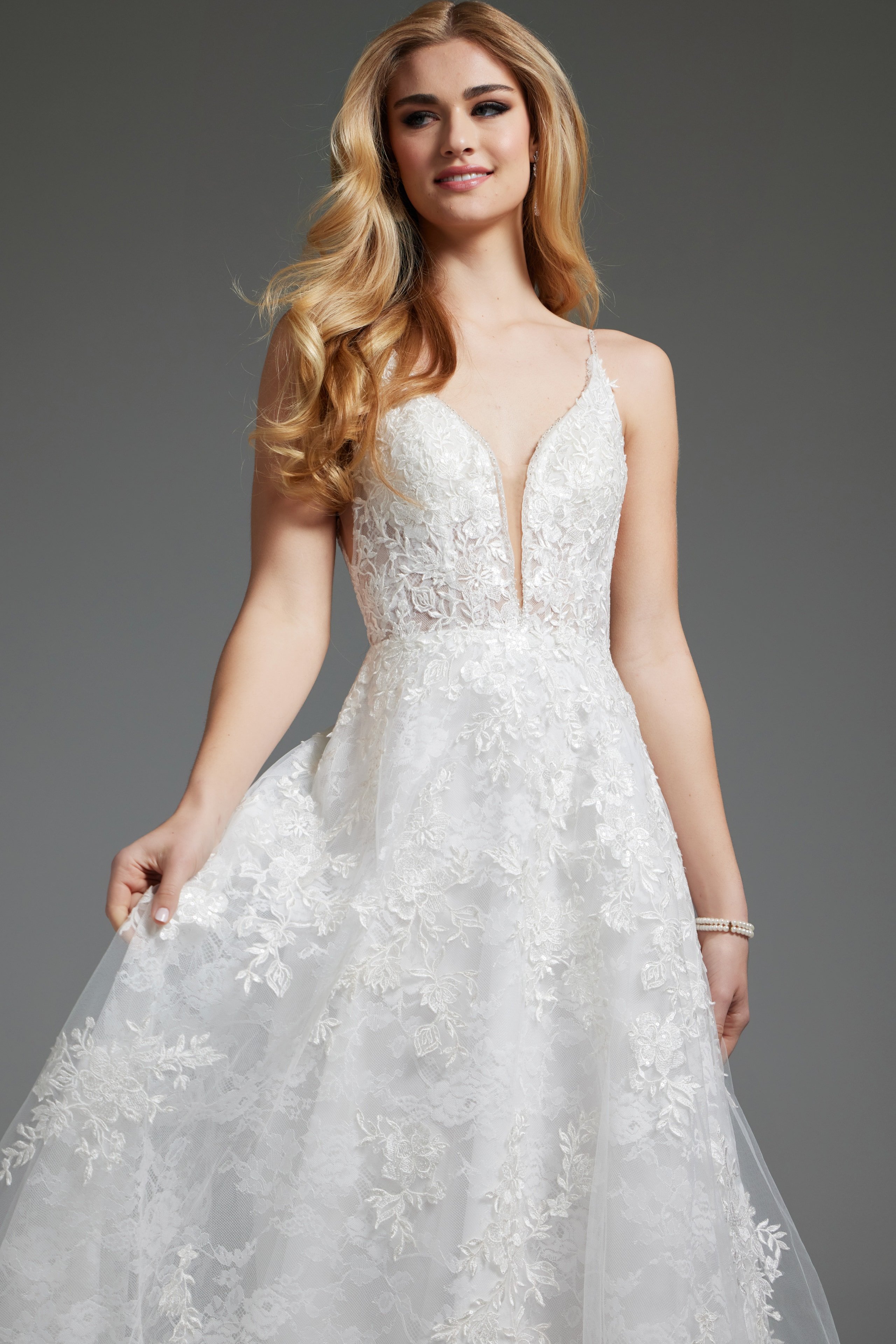 The Jovani JB07147 Ivory Embellished Spaghetti Strap Bridal Ballgown showcases an exquisite combination of elegance and romance. This stunning gown features delicate spaghetti straps that frame a deep V-neckline, drawing attention to the intricate beaded and lace detailing of the bodice. Crafted from luxurious lace fabric, this floor-length ballgown silhouette flows effortlessly into a sweeping long skirt adorned with pleated accents, offering a perfect blend of classic sophistication and modern charm. The sheer detailing adds a touch of allure, while the closed back style ensures a timeless appeal. Ideal for making a graceful entrance on your special day, this dress promises to captivate and enchant with its ethereal beauty.