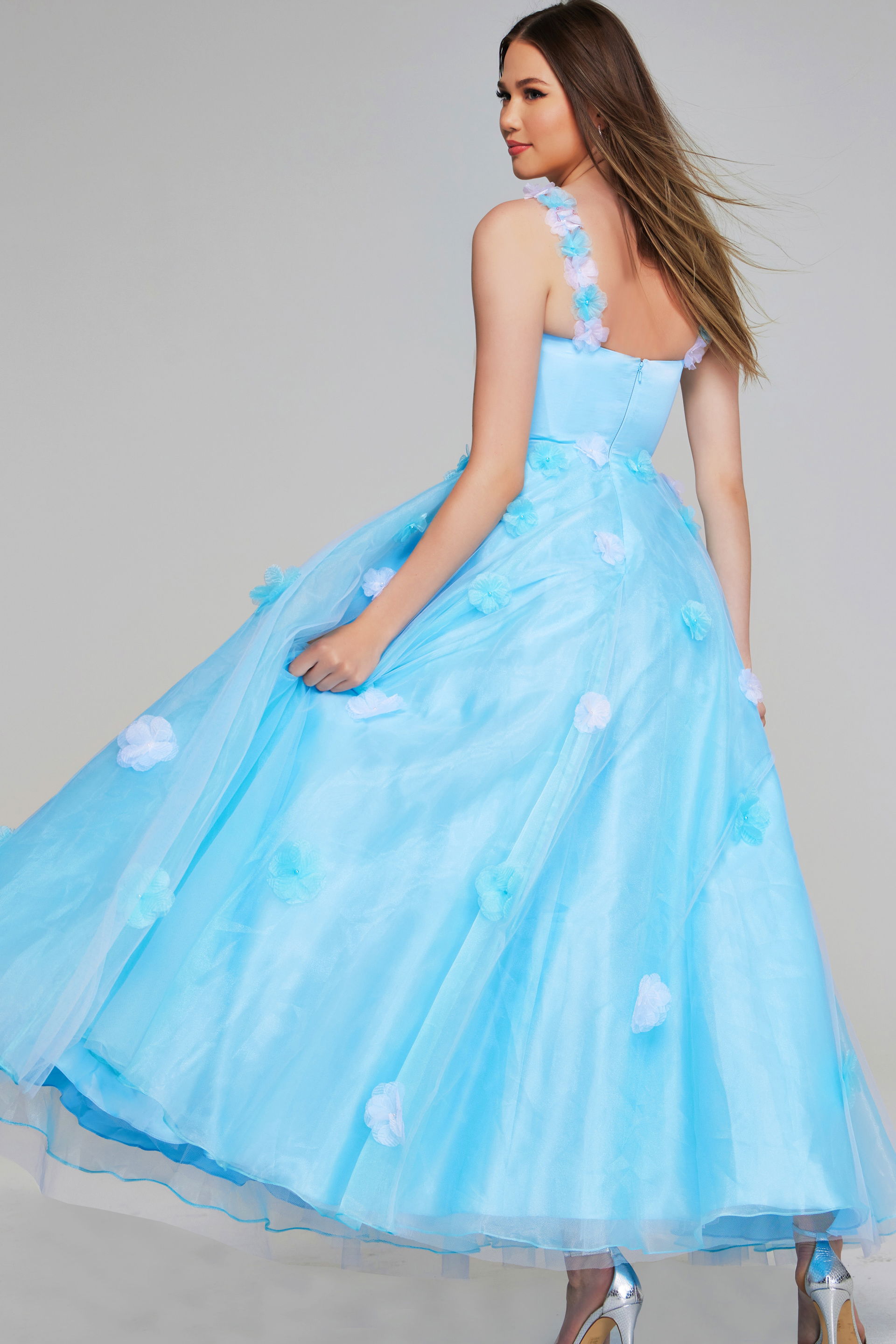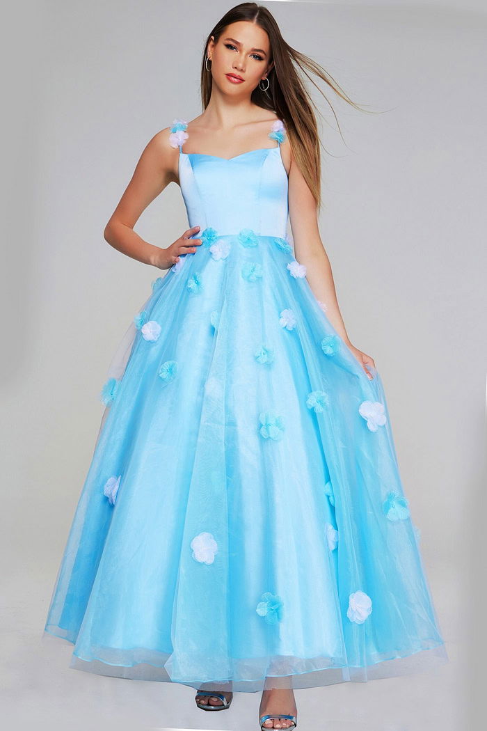 This darling floor-length ballgown features a sweetheart neckline and delicate sleeveless design. The dress is adorned with charming floral rosettes, offering a whimsical and enchanting look. Made from layers of tulle fabric, it provides an ethereal quality that captivates at every turn.