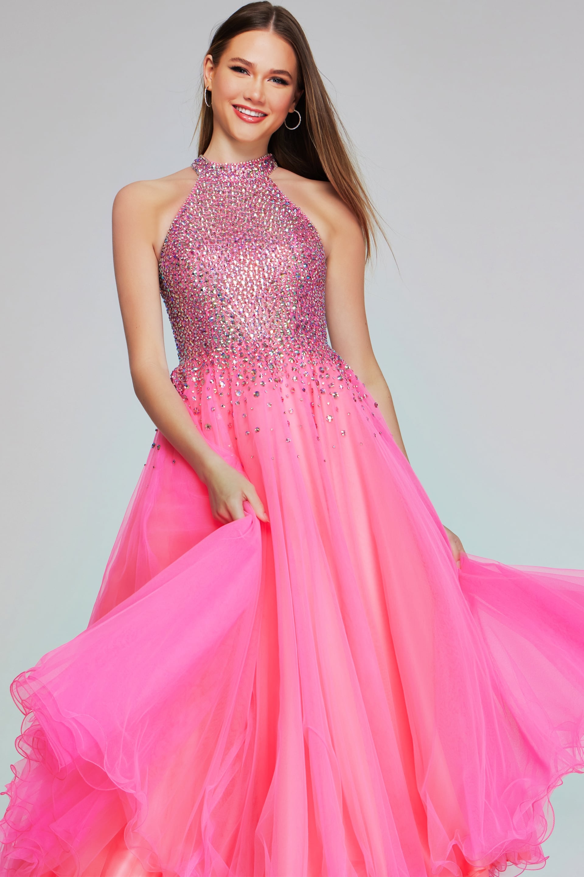 This stunning hot pink A-line dress features a bejeweled halter neckline with a dazzling array of beaded details. The full tulle skirt adds volume and elegance, making it perfect for any glamorous event. The dress is floor-length, crafted from luxurious tulle fabric, and designed to make you stand out in any crowd with its vibrant color and intricate detailing.
