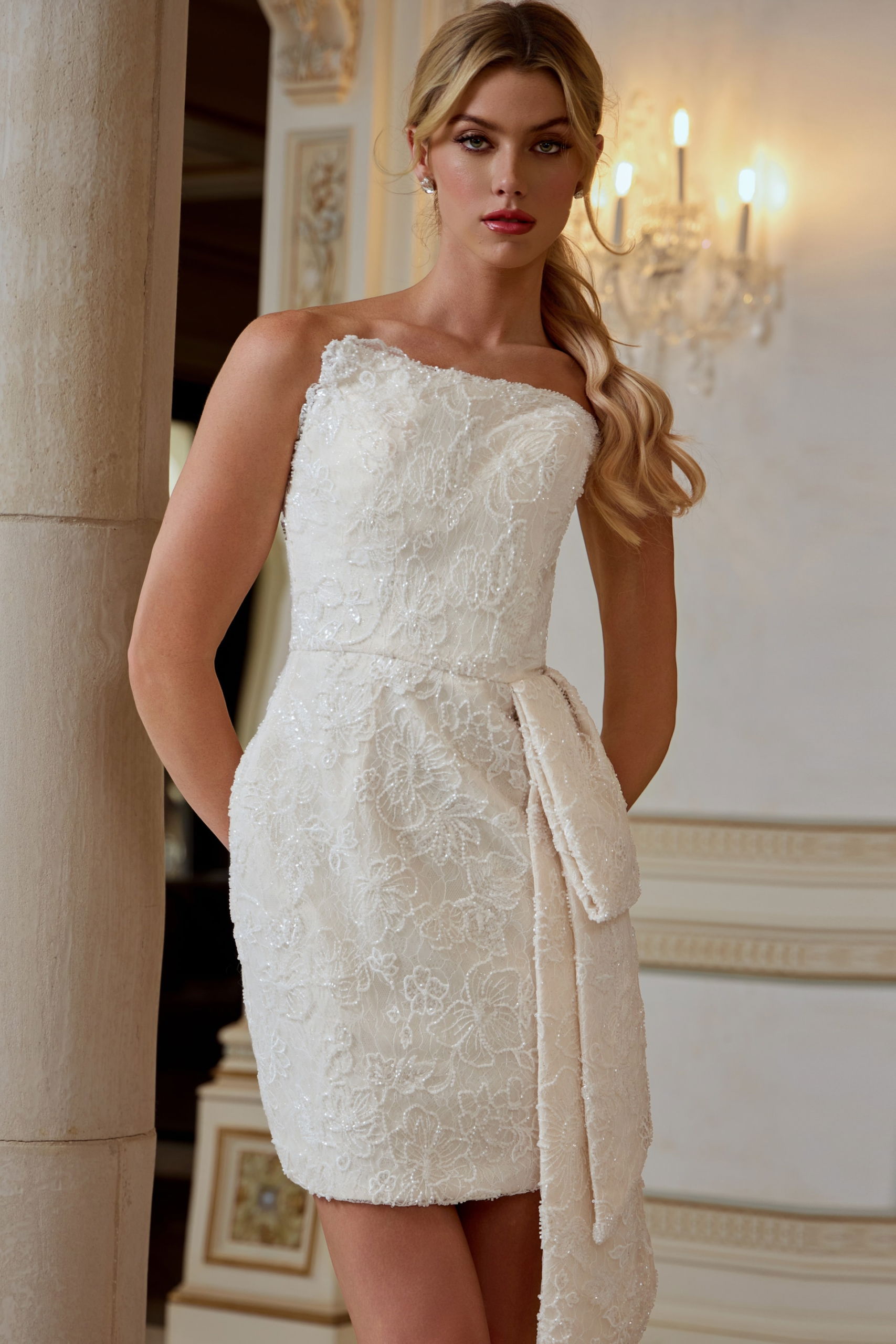 Beaded Lace Appliqué, Side Bow Detail, Fitted Bodice, Scalloped Edges