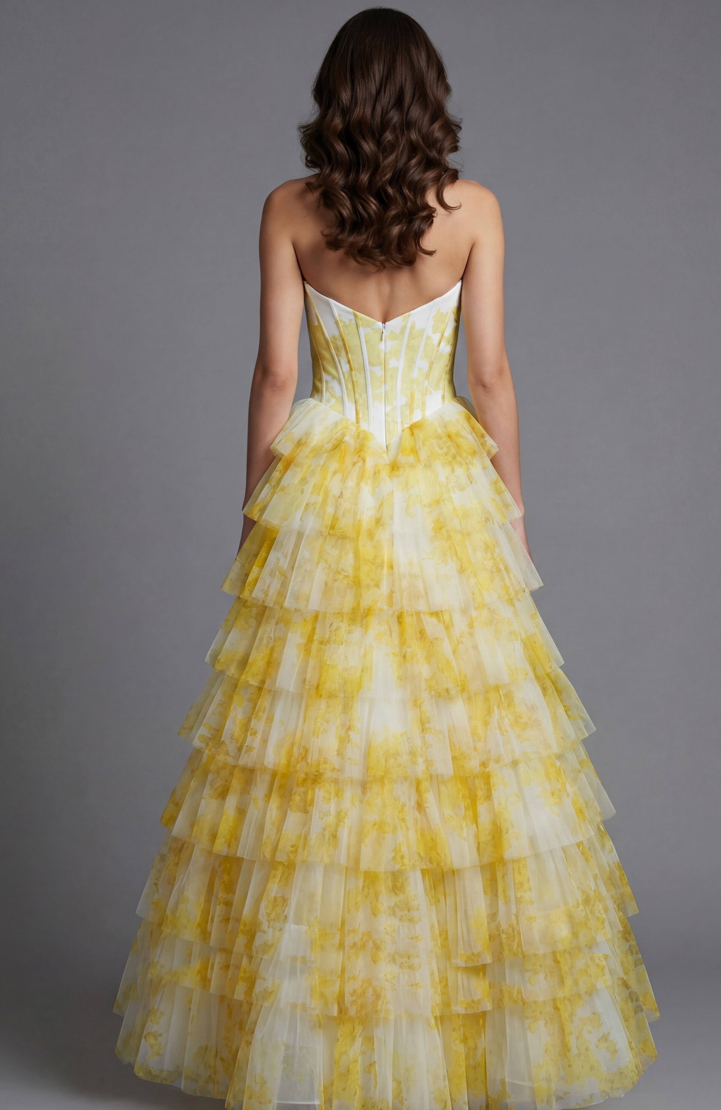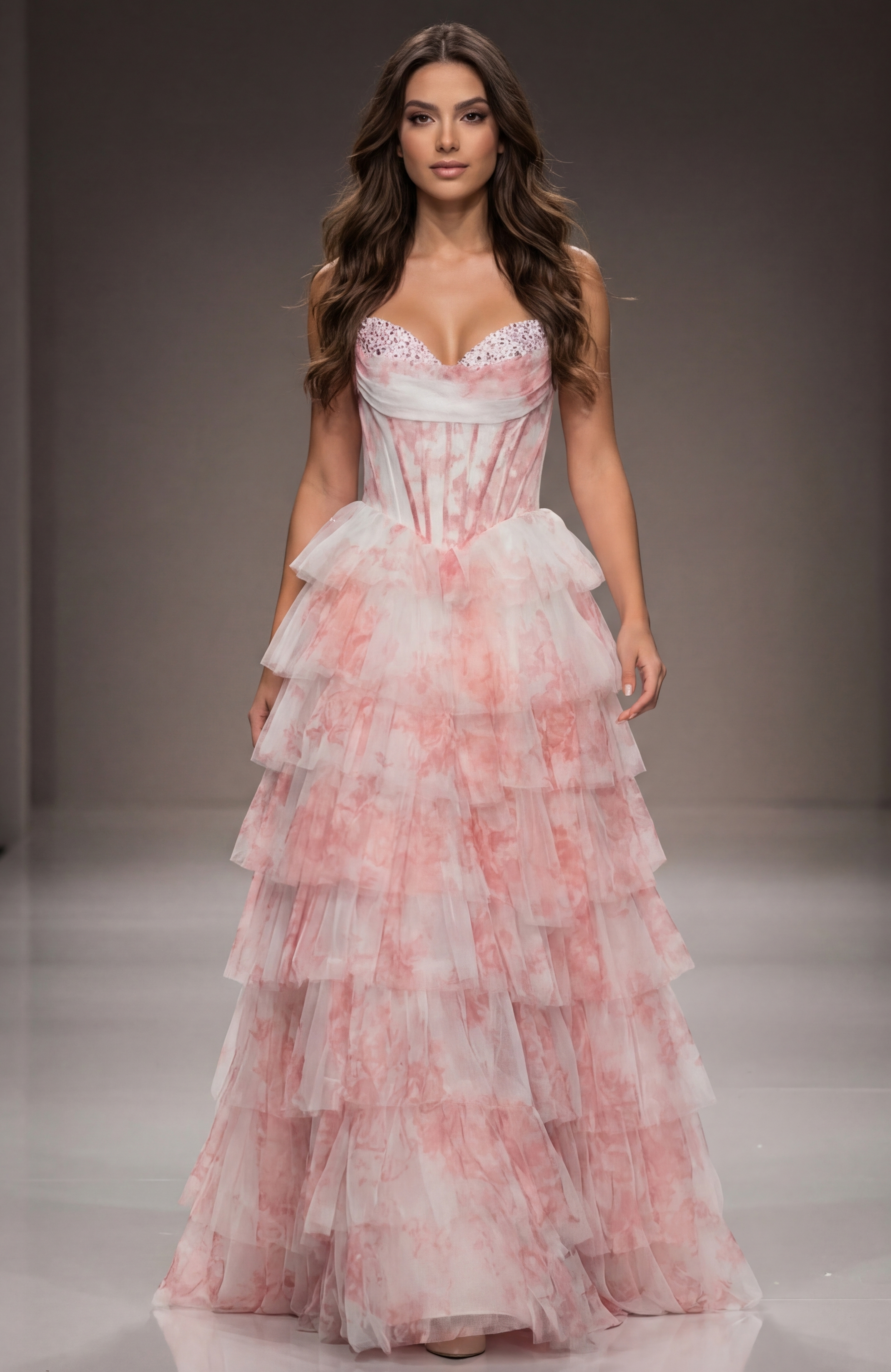 Beaded Bustline, Corset Bodice, Tiered Skirt, Boned Structure, Romantic Floral Pattern