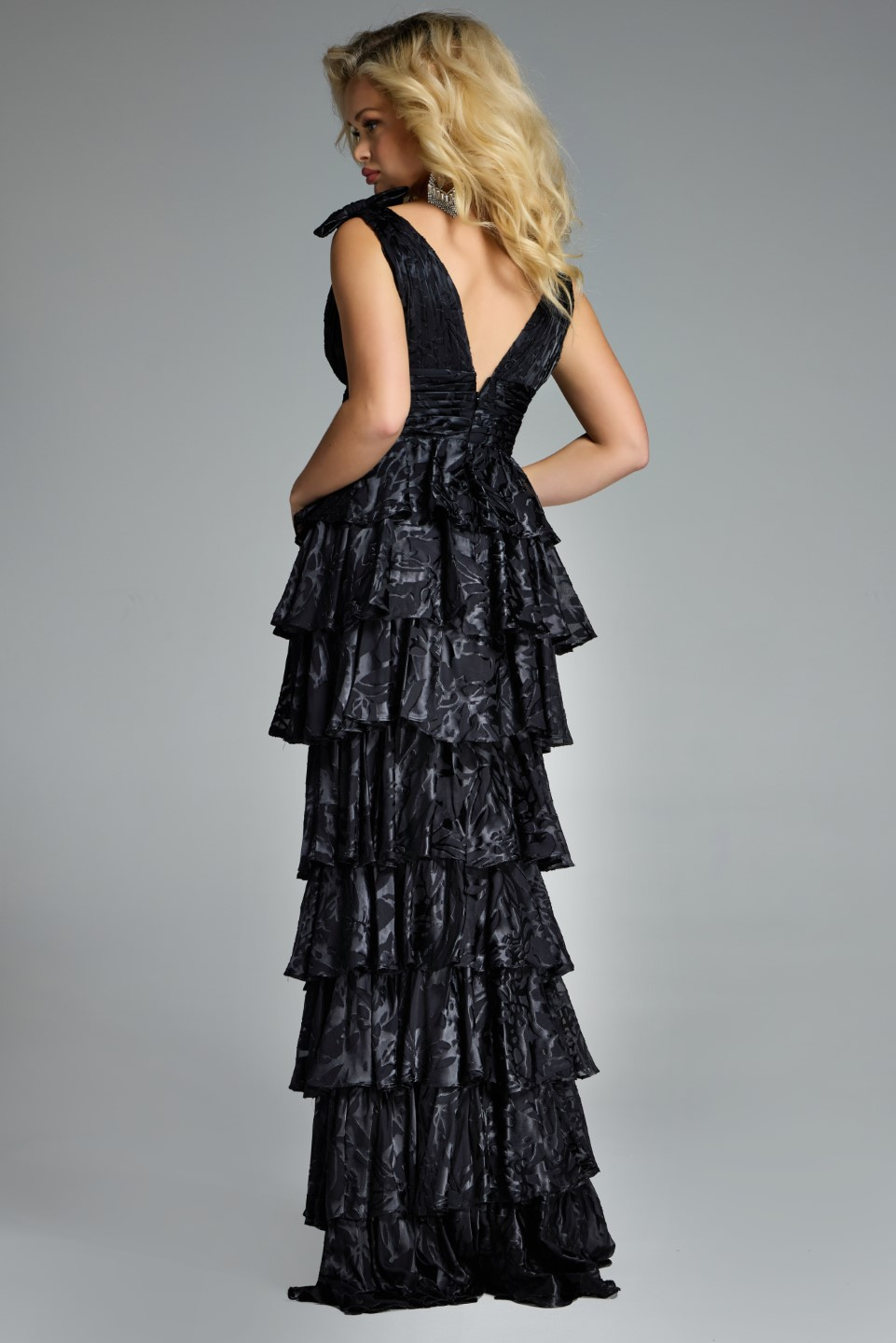 Elevate your evening ensemble with this stunning black gown, featuring a luxurious tiered skirt that cascades elegantly to the floor. The dress showcases a flattering A-line silhouette, tailored with precision to enhance your natural curves. The deep V-neckline adds a hint of allure, while the sleeveless design emphasizes a classic, sophisticated look. Every tier of the skirt is adorned with intricate patterns, contributing to the dress’s unique texture and style. This dress promises to make you the center of attention at any formal event.